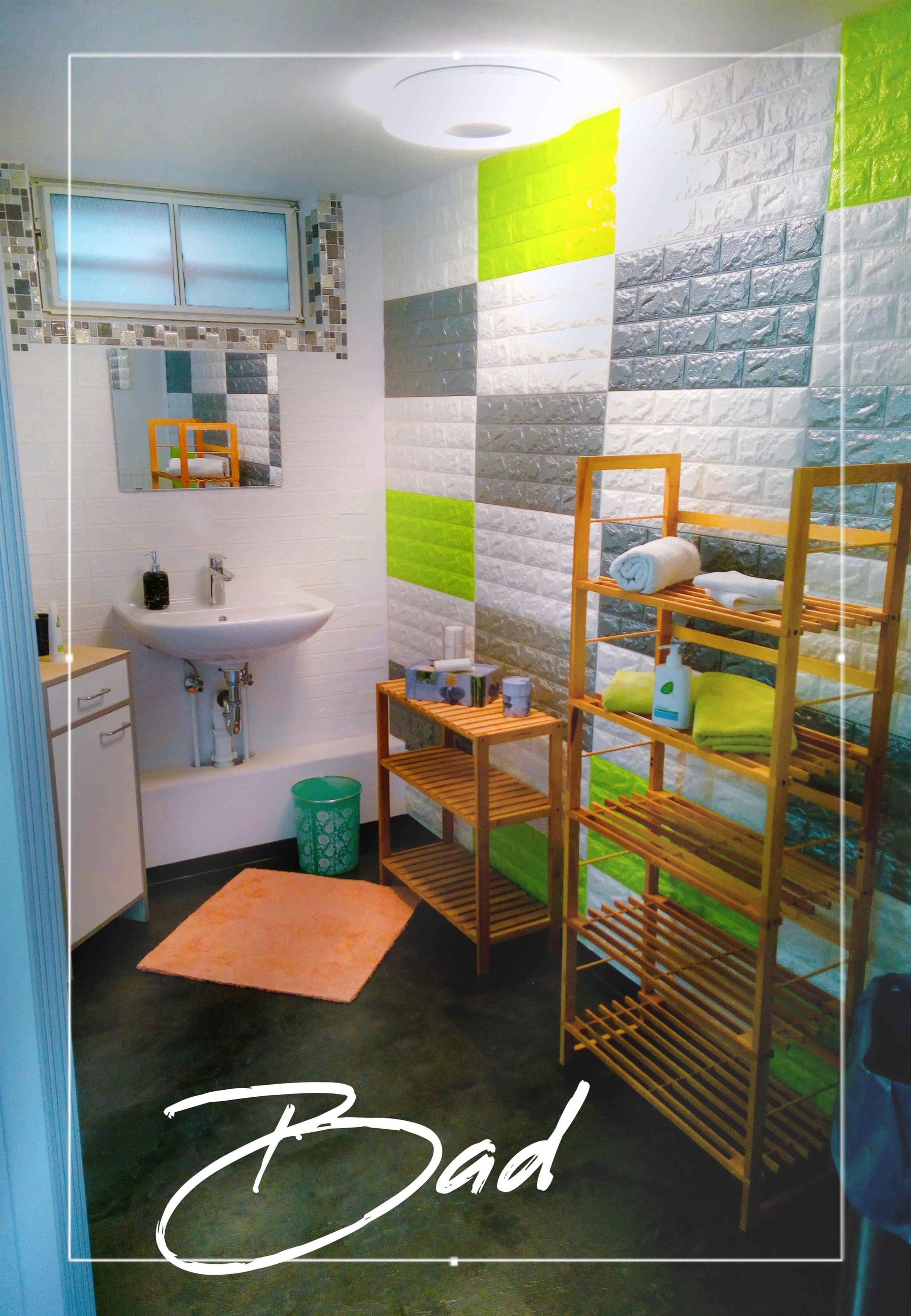Badezimmer ist geräumig, mit Waschbecken, Regalen und 2 WC Kabinen.