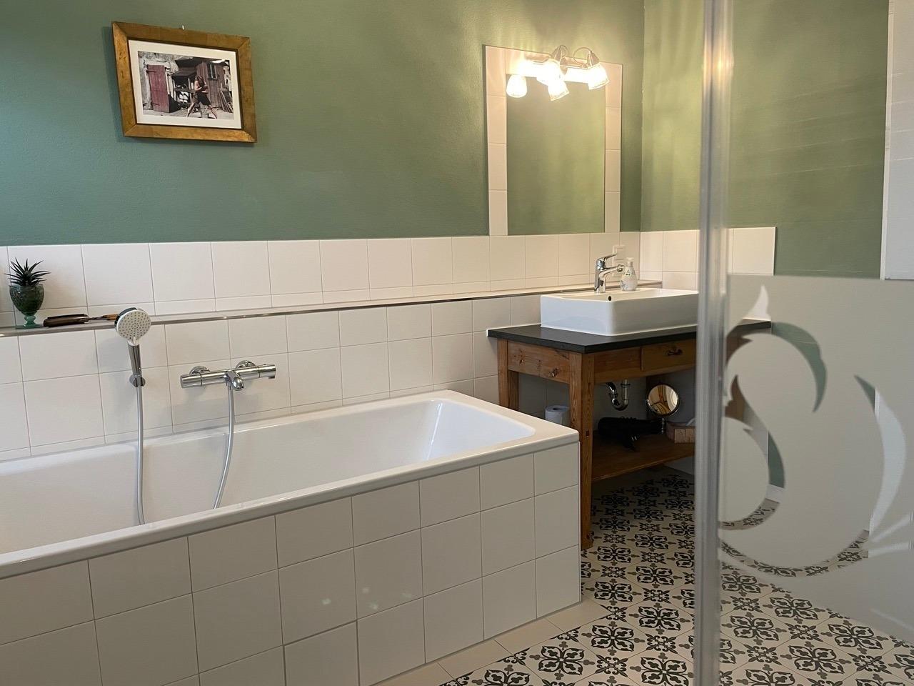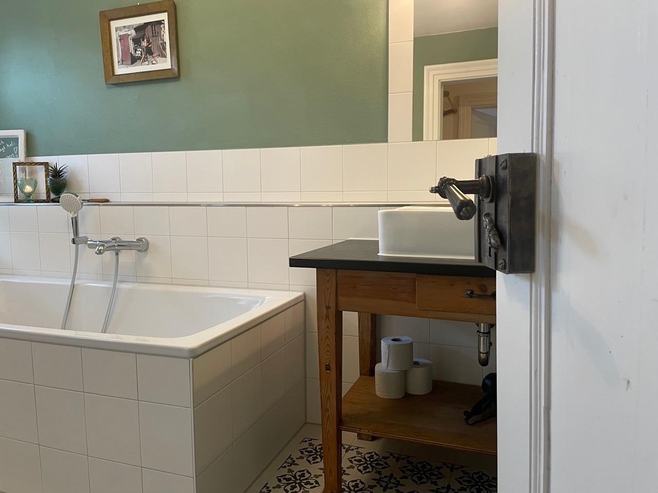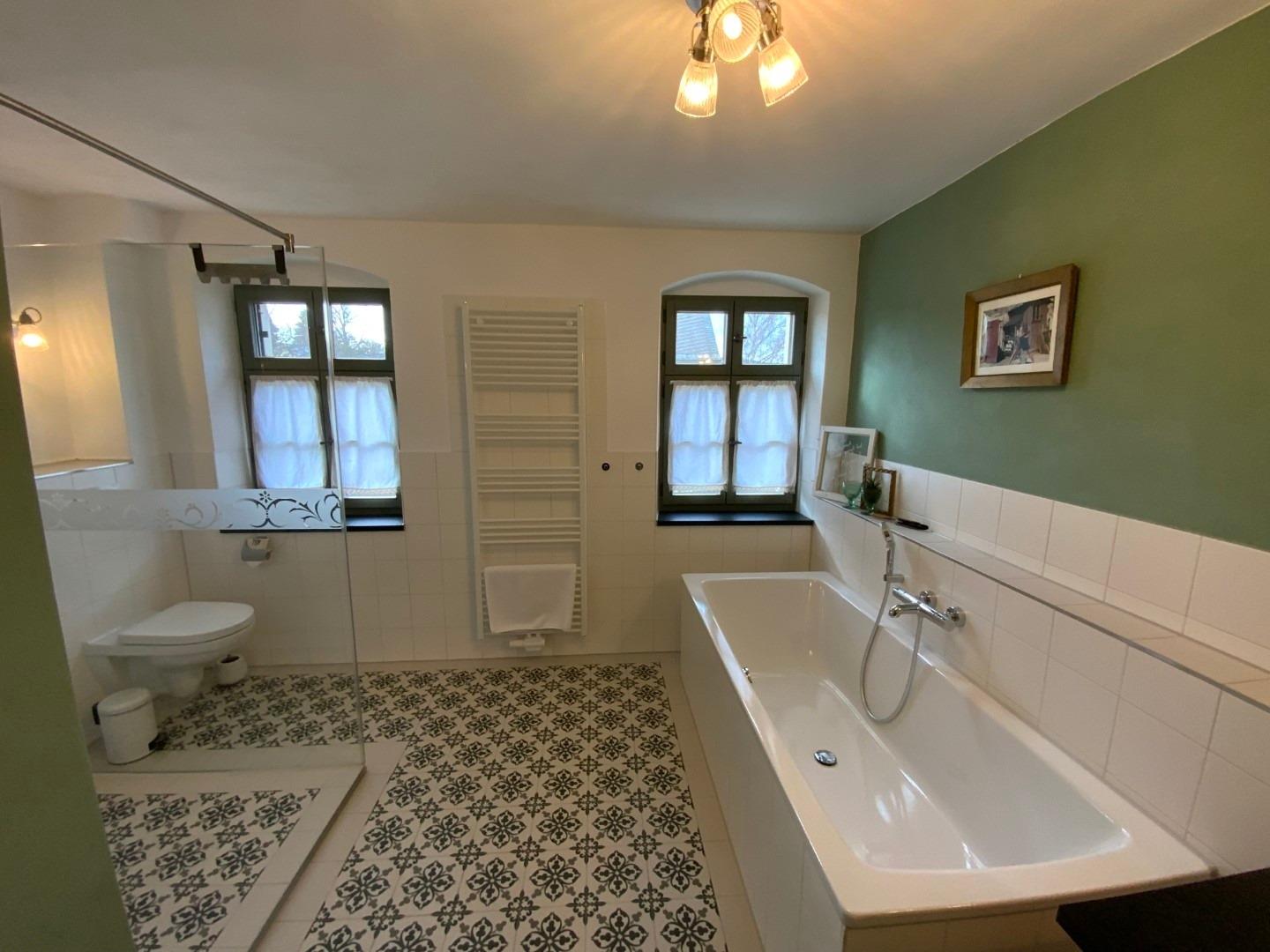 Die Gutsherrenwohnung befindet sich im 1. Obergeschoß und bietet Platz für 2 Personen. Hier stehen Ihnen eine Küche, ein Wohnzimmer, ein Schlafzimmer mit Doppelbett, sowie ein Bad mit WC, Dusche und Badewanne zur Verfügung. Die Küche ist mit Herd, Geschirrspüler, Kühlschrank, Kaffeemaschine, Wasserkocher, Toaster und vielem mehr voll ausgestattet. Diese Wohnung ist nach altem Vorbild mit Kalk und Lehm geputzt. Und auch hier wurden die ursprünglichen Türen liebevoll aufgearbeitet. Diese großzügig geschnittenen Räume erzählen von einer Zeit, als die Gutsbesitzer die "weiße Stube" ( heutiges Wohnzimmer ) nur zu besonderen Anlässen benutzten.