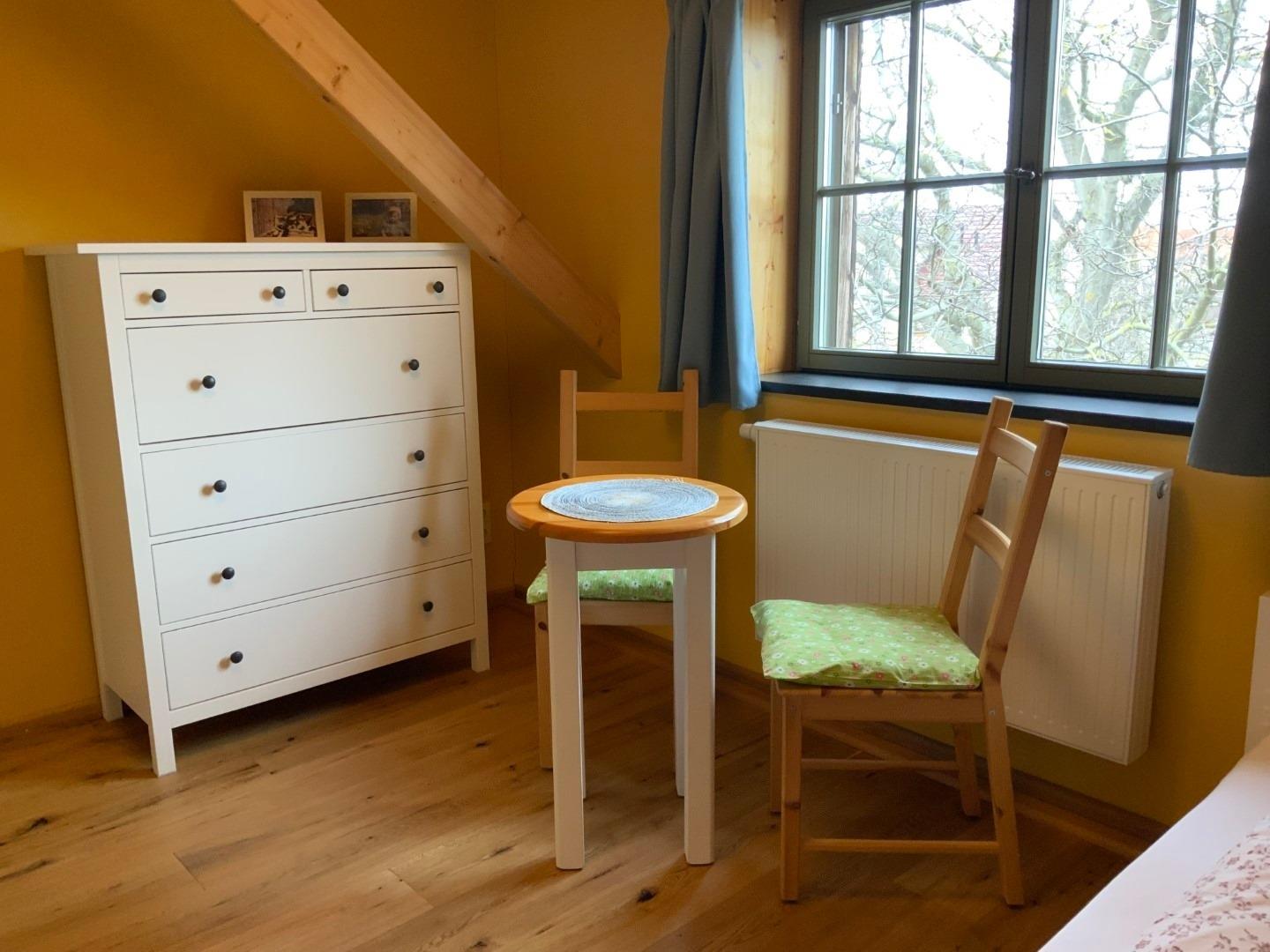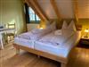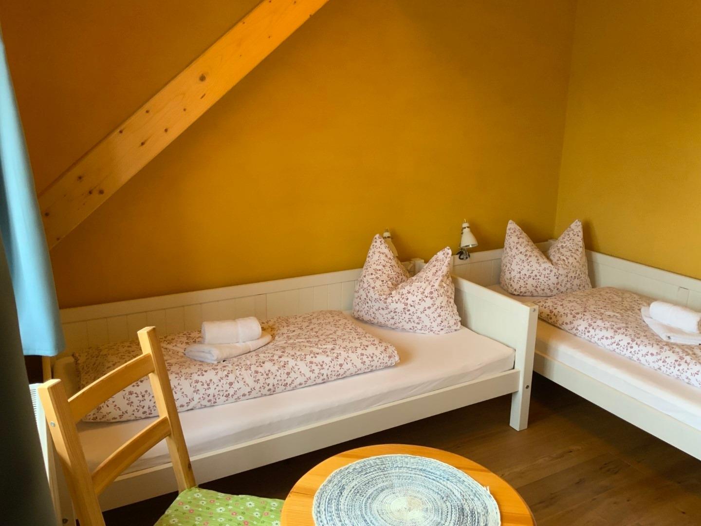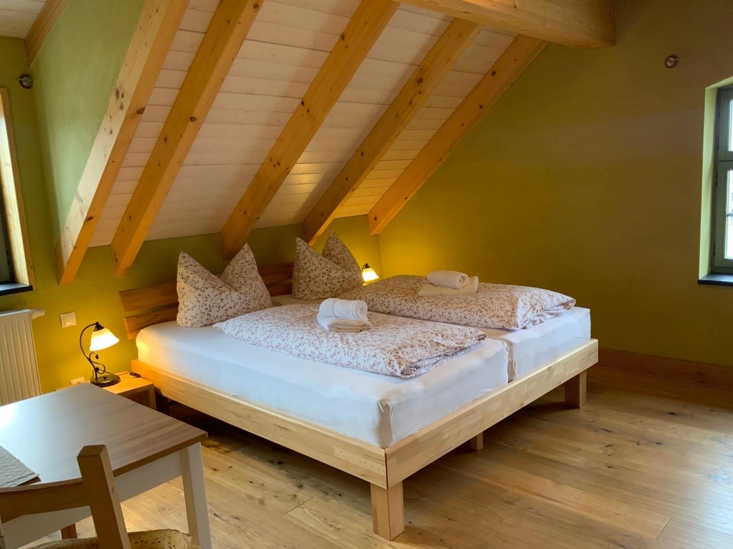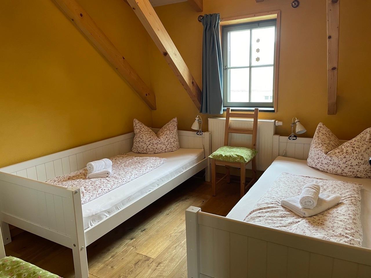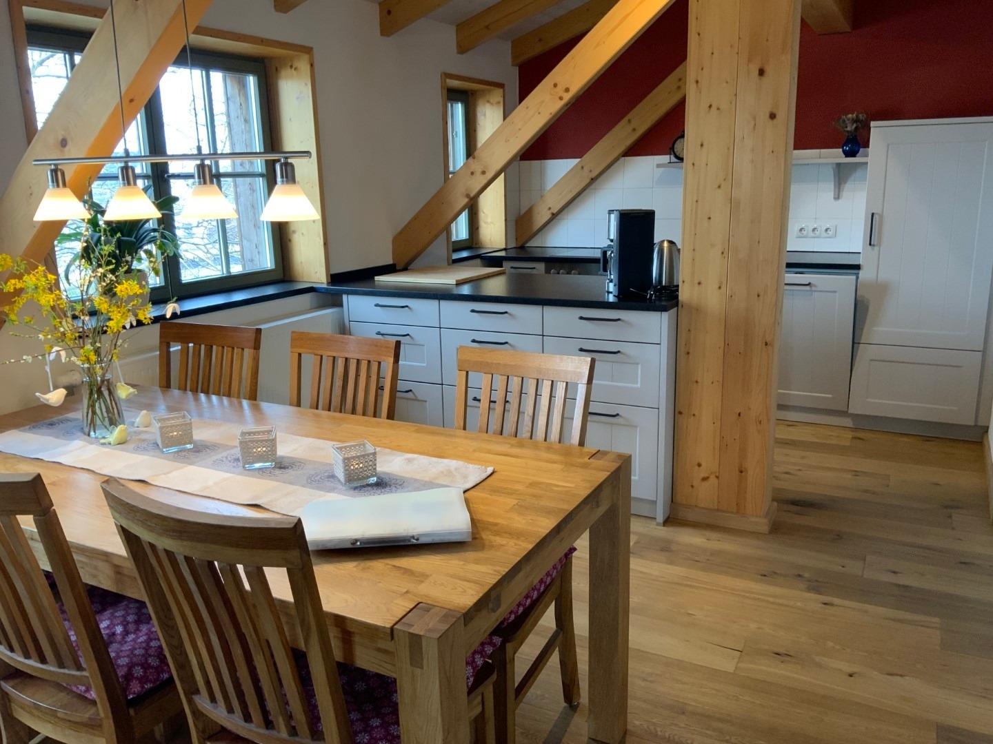 Die Kornkammer befindet sich im Dachgeschoß und bietet Platz für 6 Personen. Hier steht Ihnen eine große Wohnküche mit Essbereich zur Verfügung. Die Küche ist mit Herd, Geschirrspüler, Kühlschrank, Kaffeemaschine, Wasserkocher, Toaster und vielem mehr voll ausgestattet. Desweiteren gehören zur Wohnung ein Schlafzimmer mit Doppelbett, zwei Kinderzimmer mit je 2 Einzelbetten, ein Spielboden sowie ein Bad mit WC und Dusche. Durch die ökologische Bauweise mit Holz, Lehm und Naturdämmstoffen herrscht hier zu jeder Jahreszeit ein sehr angenehmes Wohnklima. Dort wo früher das Korn gelagert war, laden wir Sie ein von weiten Feldern und Wiesen zu träumen.