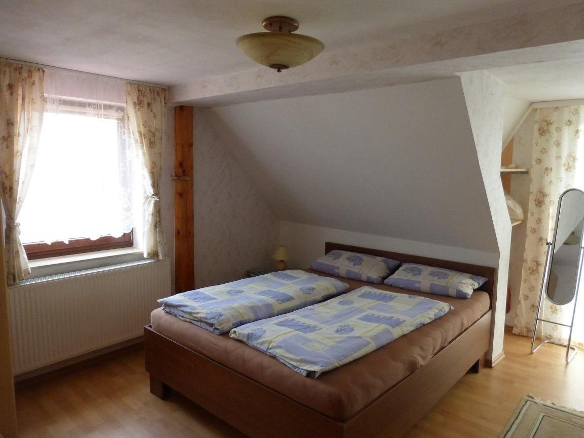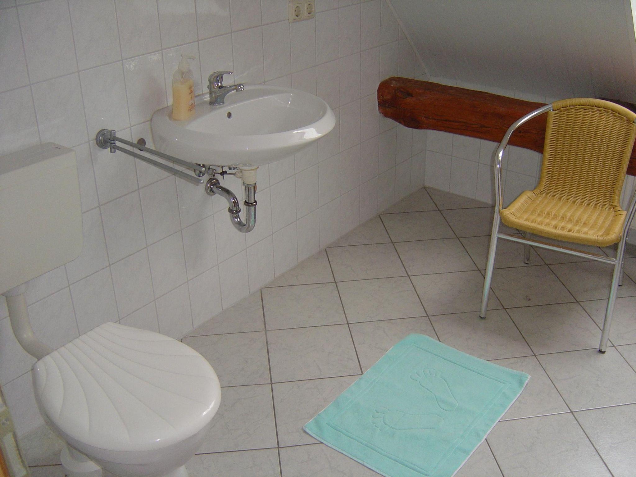 The holiday apartment is on the first floor and has a separate entrance. It has two bedrooms, a living room-kitchen and a bathroom with a WC. The first bedroom is furnished with a double bed (200 x 200cm), bedside tables and a wardrobe. A cot or a supplementary bed can also be set up here. The second bedroom has a French bed (180 x 200cm), a wardrobe, a dresser, a little table and two chairs. The table and chairs can be replaced by a supplementary bed or a cot. The living room-kitchen provides a sofa bed (200 x 200cm), a table and chairs, a cupboard wall with crockery, glasses and books. There is also a kitchen unit with a standard electric stove with an oven, a sink and a fridge, as well as a coffee machine, toaster and kettle.