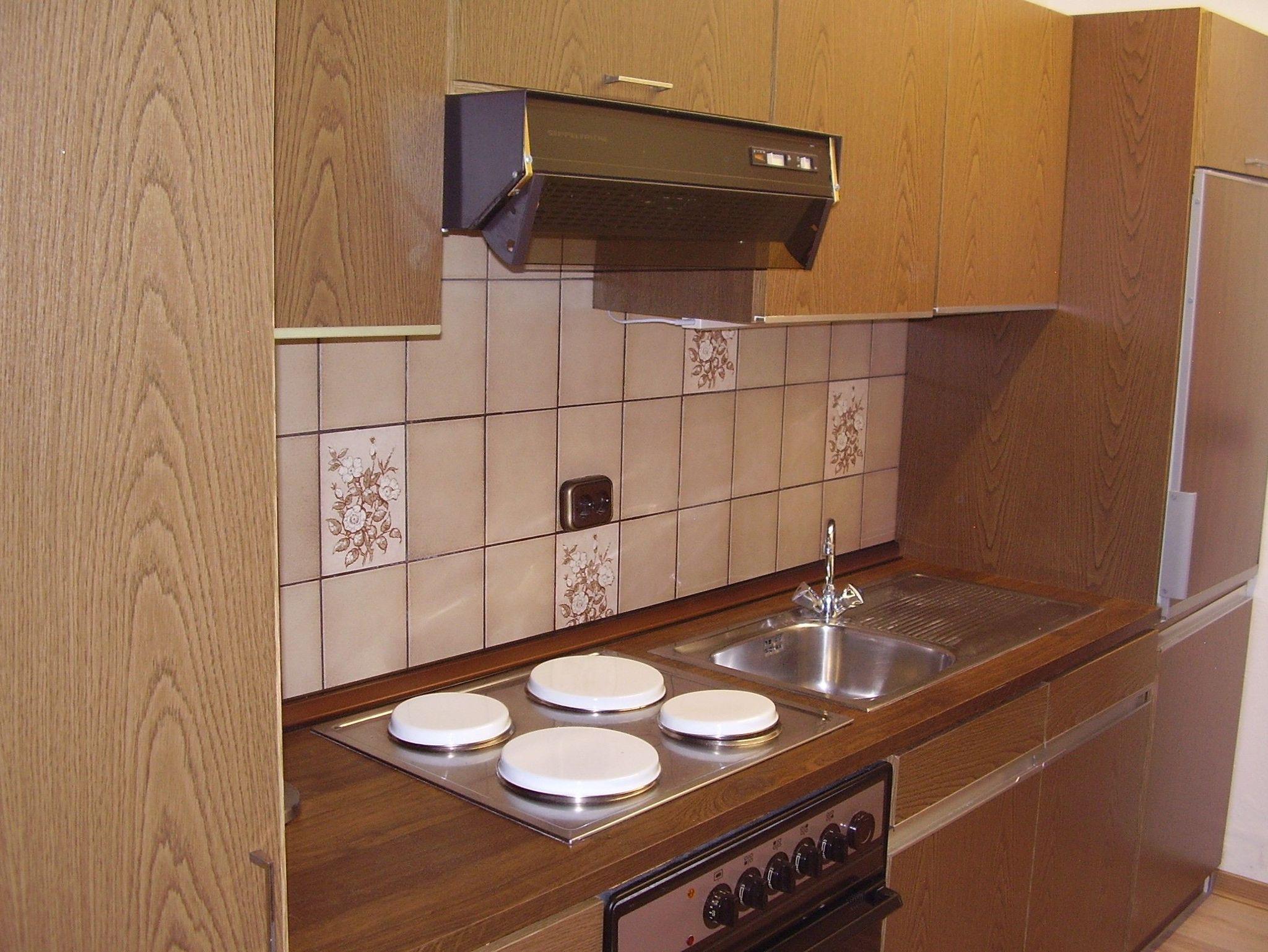 Separate Einbauküche mit 4-Plattenherd und Backofen, Kühlschrank mit Gefrierfach, ausreichend Töpfen, Pfannen, Bestecke und Geschirr, etc..