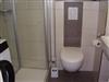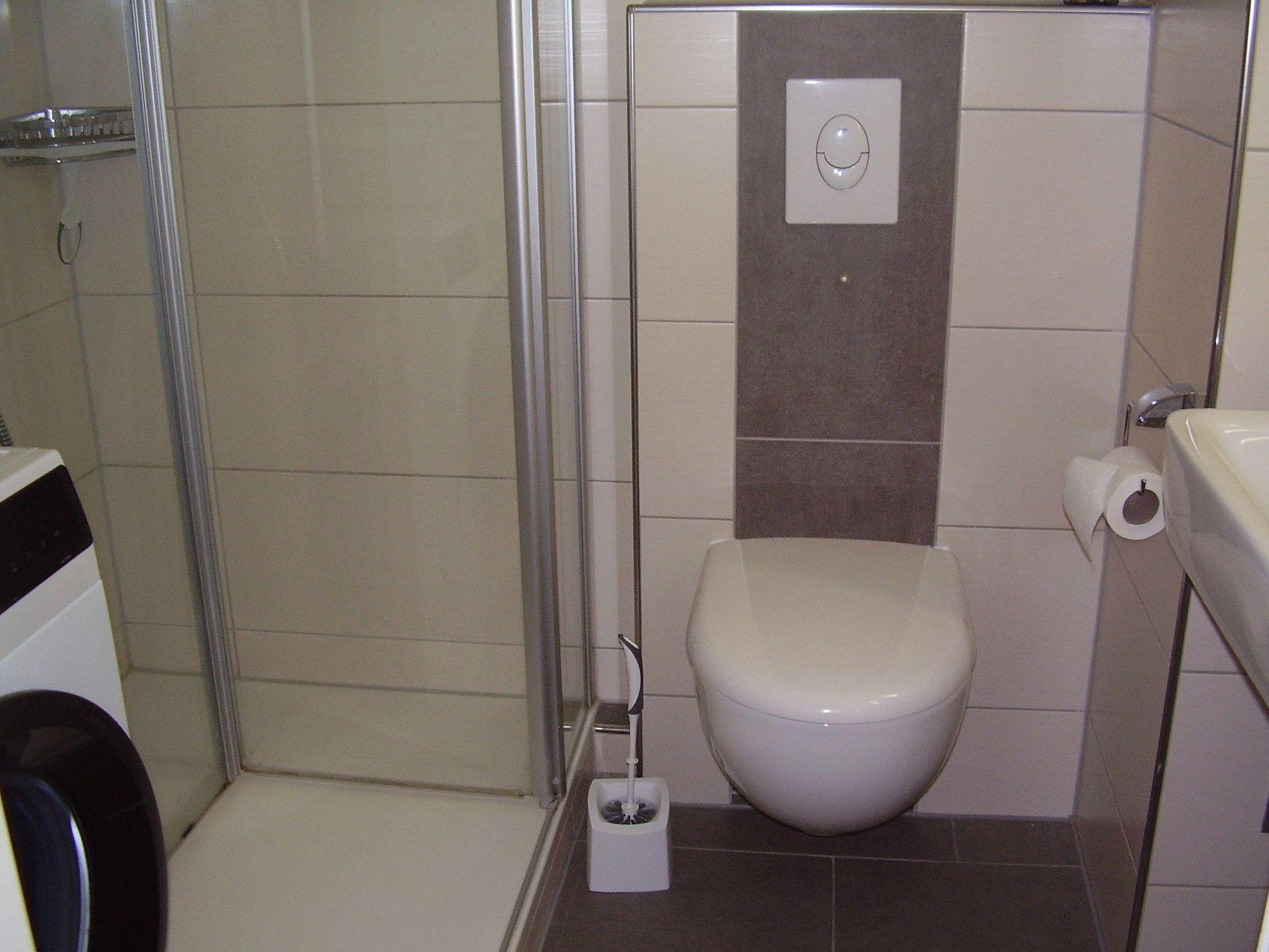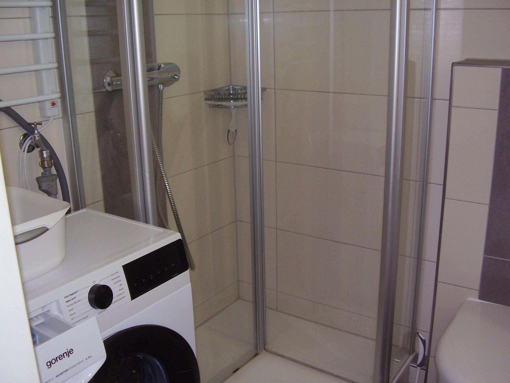 Modernes Badezimmer mit Dusche, Hänge-WC und Waschmaschine.