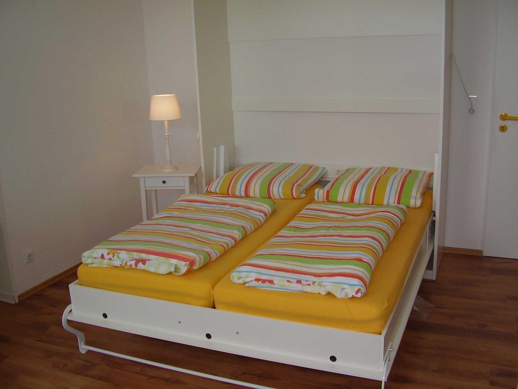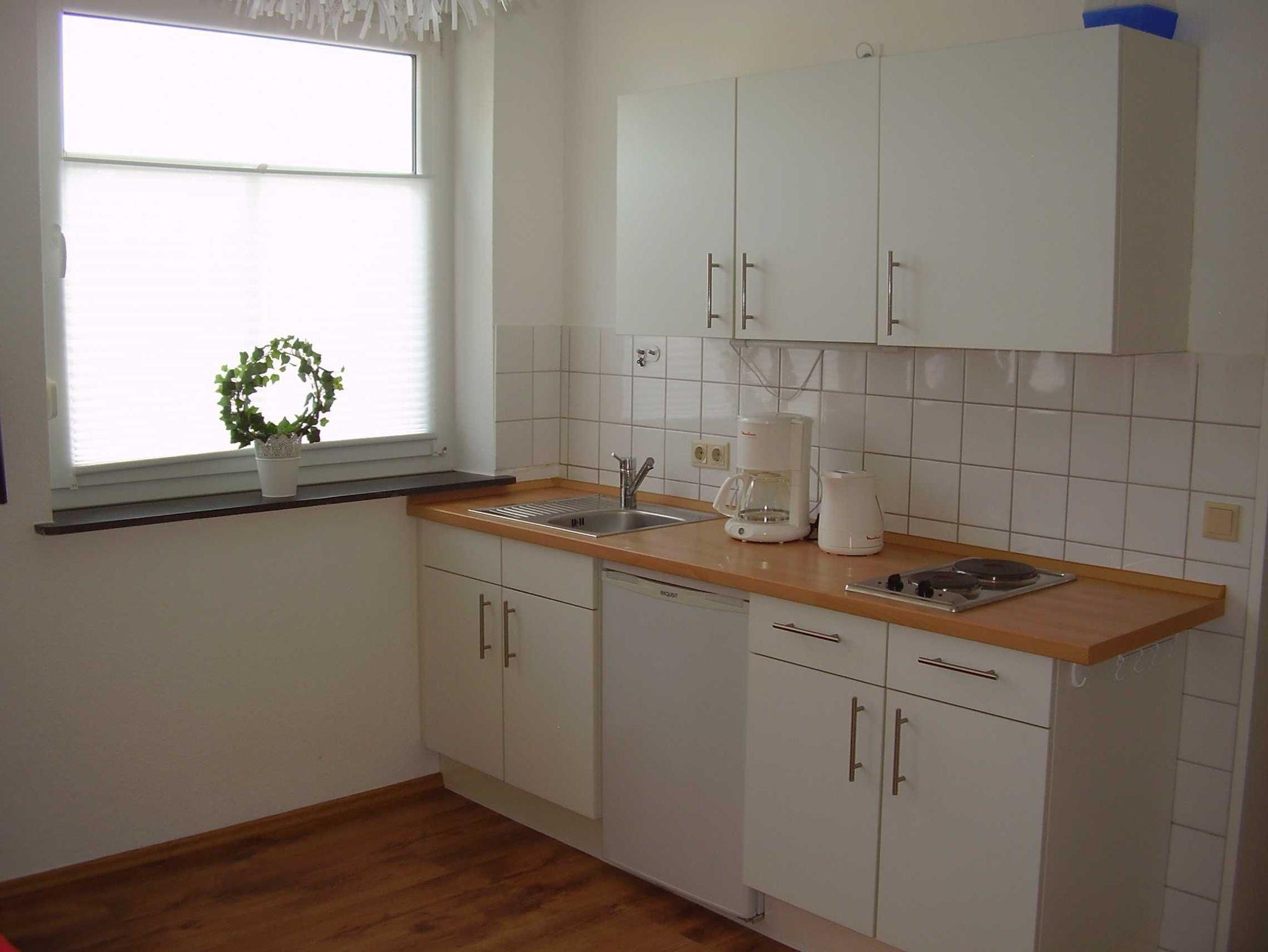Das Ferienapartment verfügt in einem Raum über Wohn- und Essbereich mit gemütlicher Sitzgarnitur und Flachbild-TV, einer kleinen Einbauküche mit Kühlschrank, Elektroherd und den erforderlichen Elektrogeräten, sowie einem Doppelschrankbett mit Einzelmatratzen; Laminatfussboden.