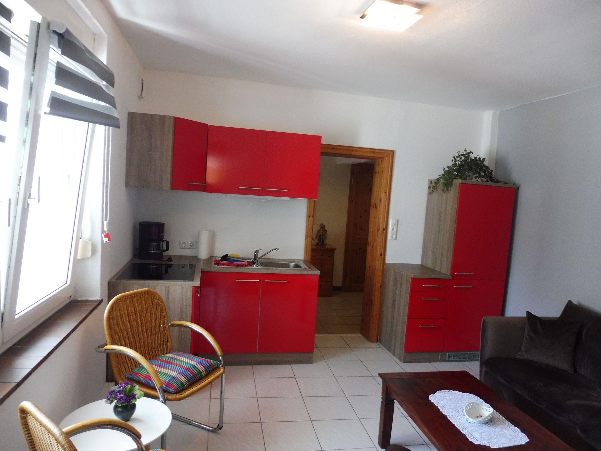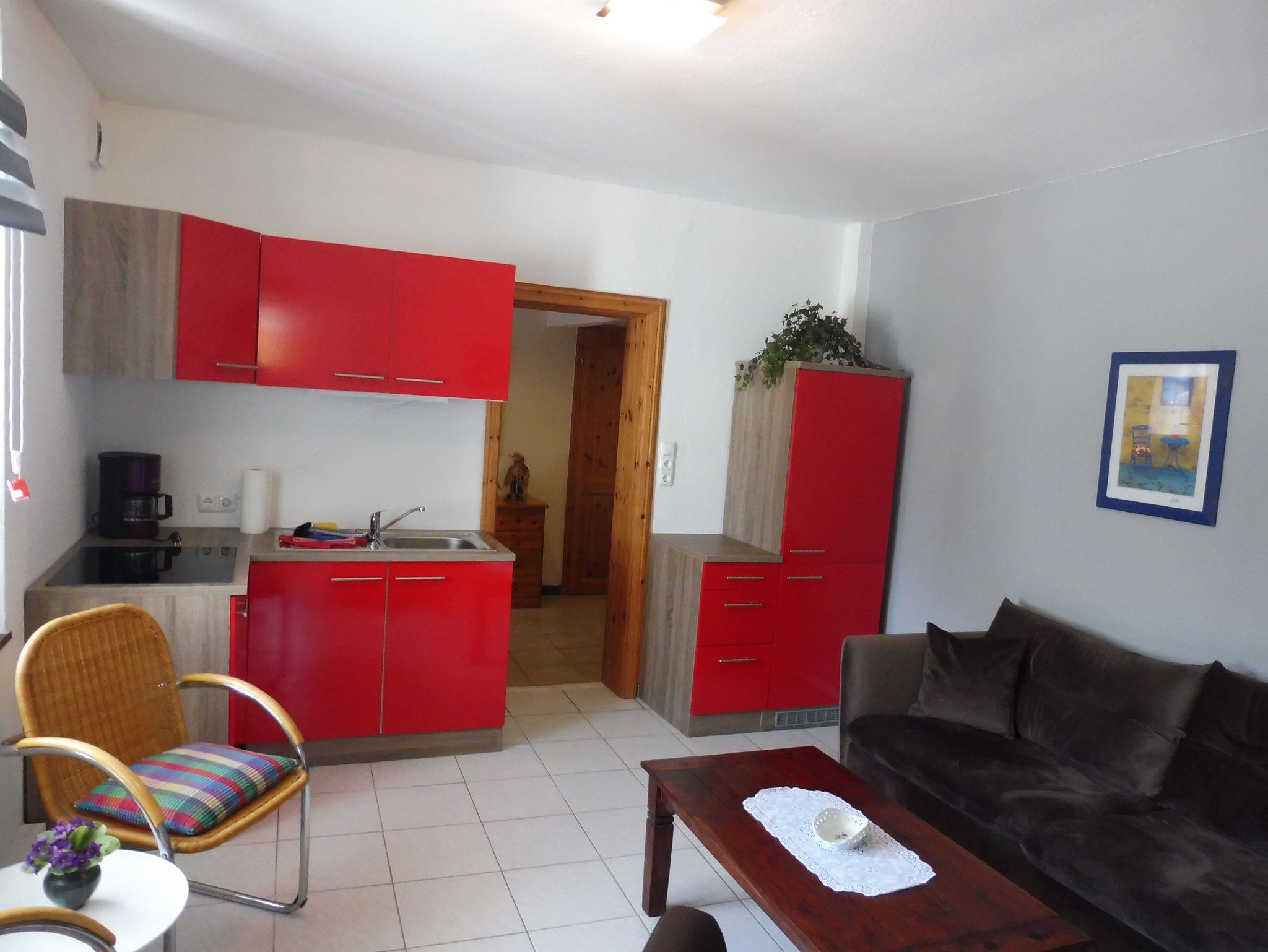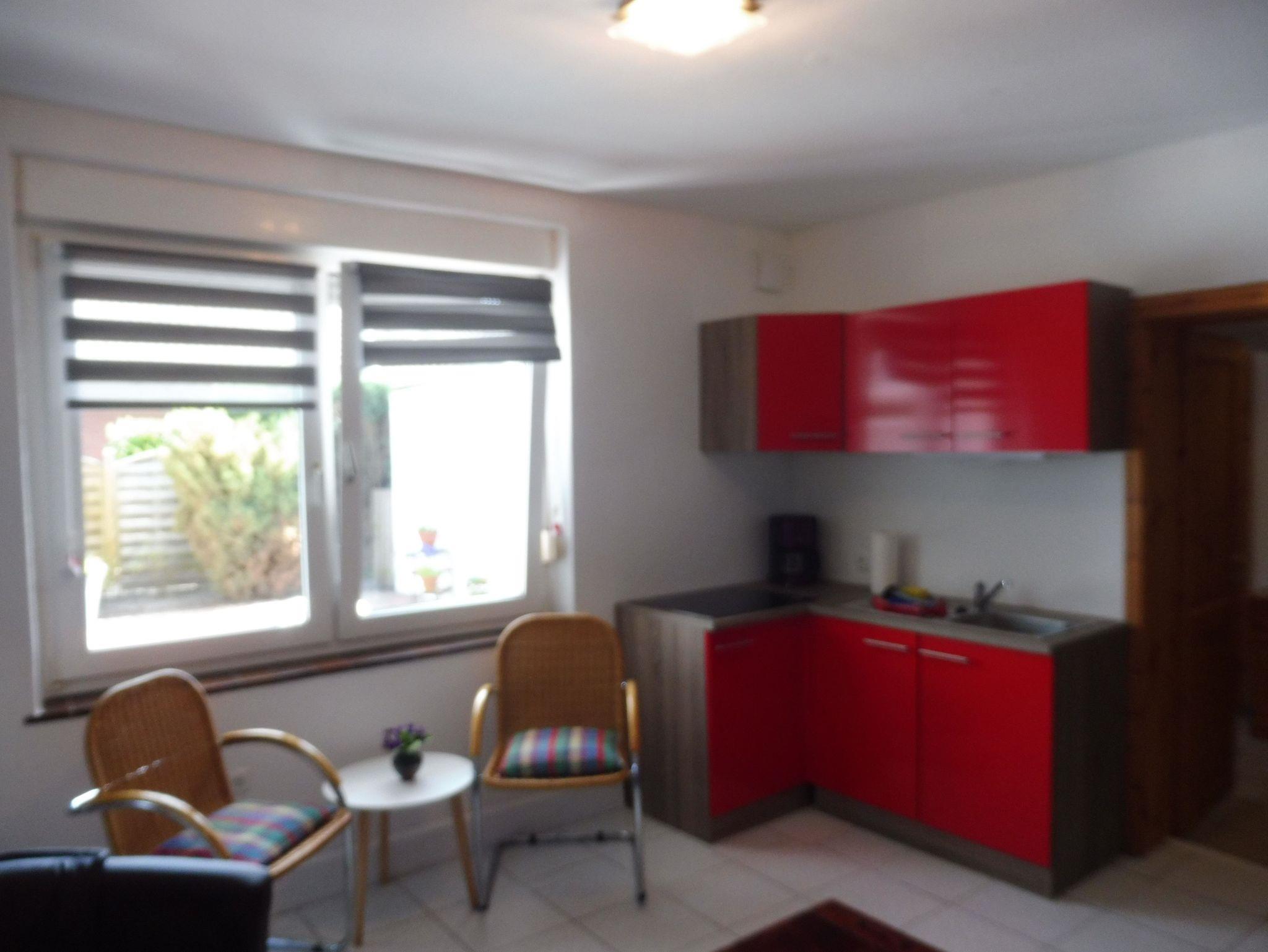 Wohnküche mit bequemer Sitzcouch, Cocktailsessel, Couchtisch und Schwingstühlen. Die integrierte Einbauküche bietet ein 4-Platten-Ceran-Kochfeld, einen Einbau-Kühlschrank mit Gefrierfach, Kaffeemaschine, Wasserkocher, Toaster sowie koml. Geschirr & Gläser und alle Utensilien die man in einer Urlaubsküche benötigt. Ein extra Schlafzimmer mit Boxspringbett 1,5x2,0 Meter, Kleiderschrank, Bei Bedarf steht für eine 3. bzw. 4. Person ein weiterer