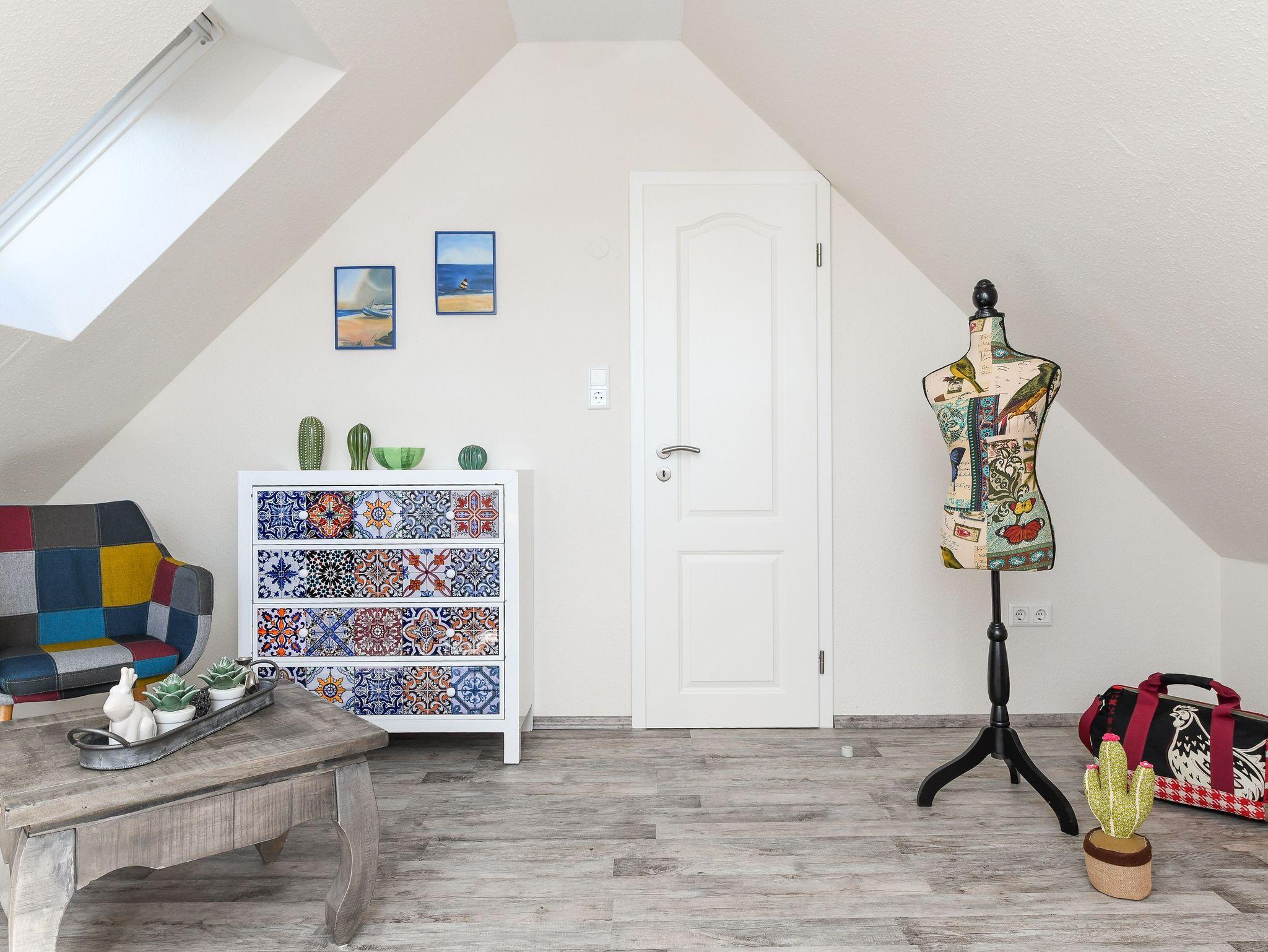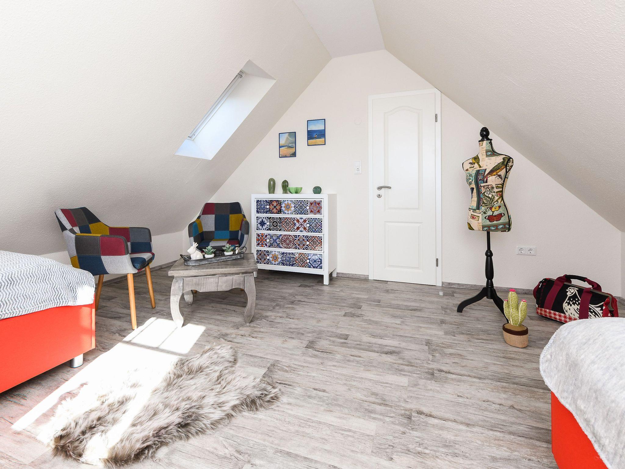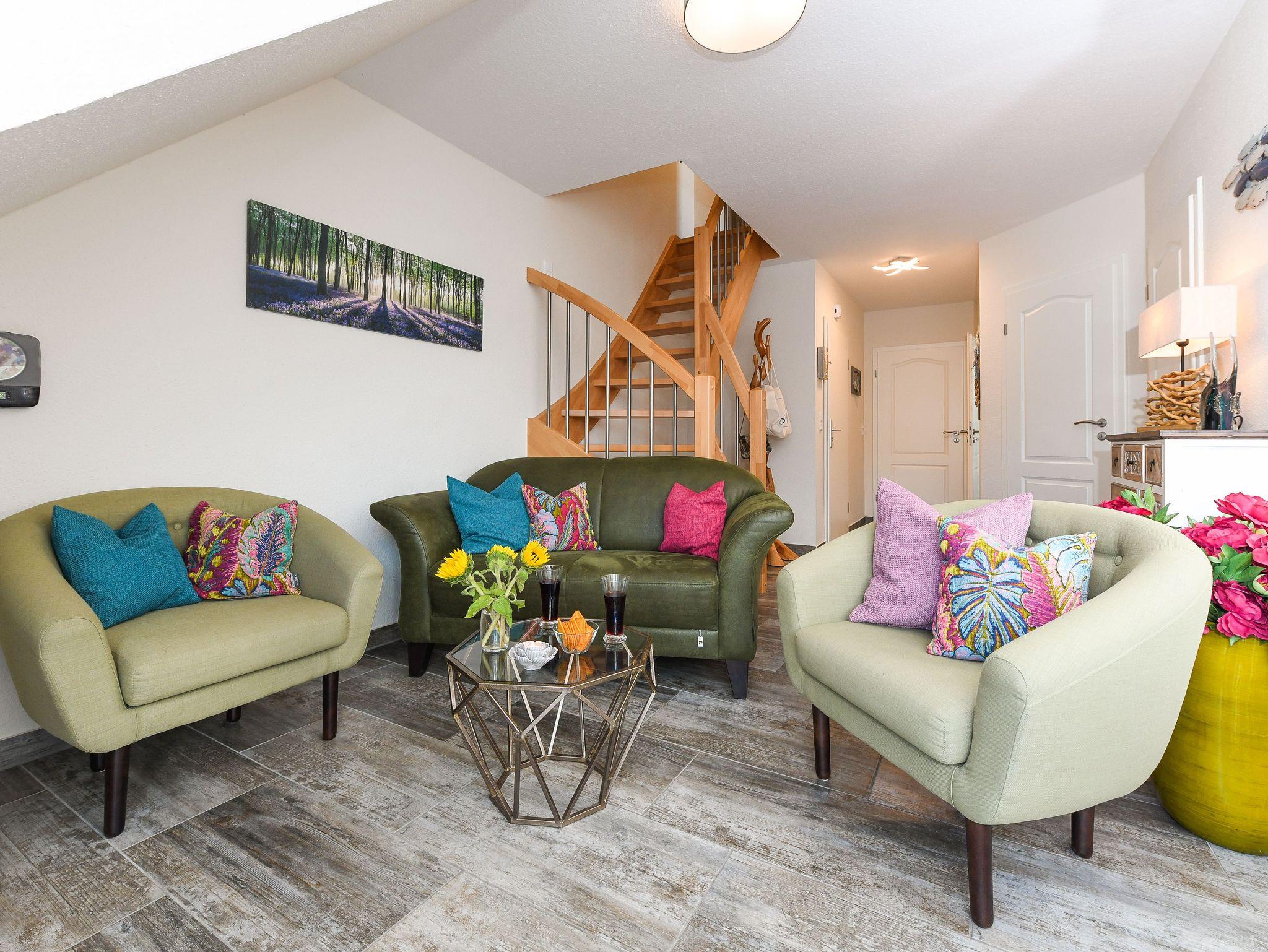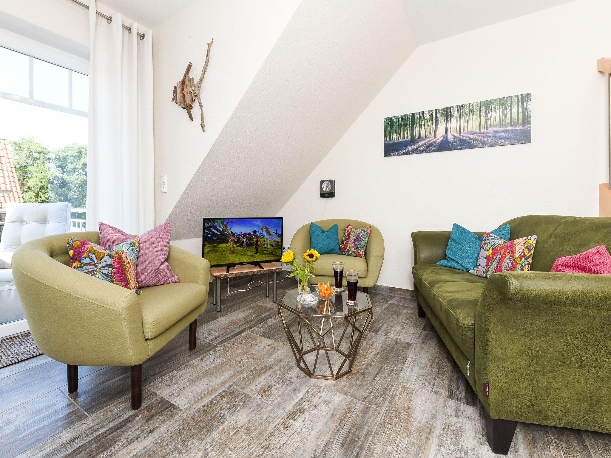 Die gemütlich und freundlich eingerichtete Ferienwohnung ist ungefähr 60 Quadratmeter groß und verfügt über drei Schlaf- bzw. Kinderzimmer, einem Wohnraum mit integrieter Küche sowie einem nach Süden ausgerichteten Balkon. Die Ferienwohnung „Kiebitz“ ist damit sehr gut geeignet für zwei bis vier Personen und ein zusätzliches Kleinkind.