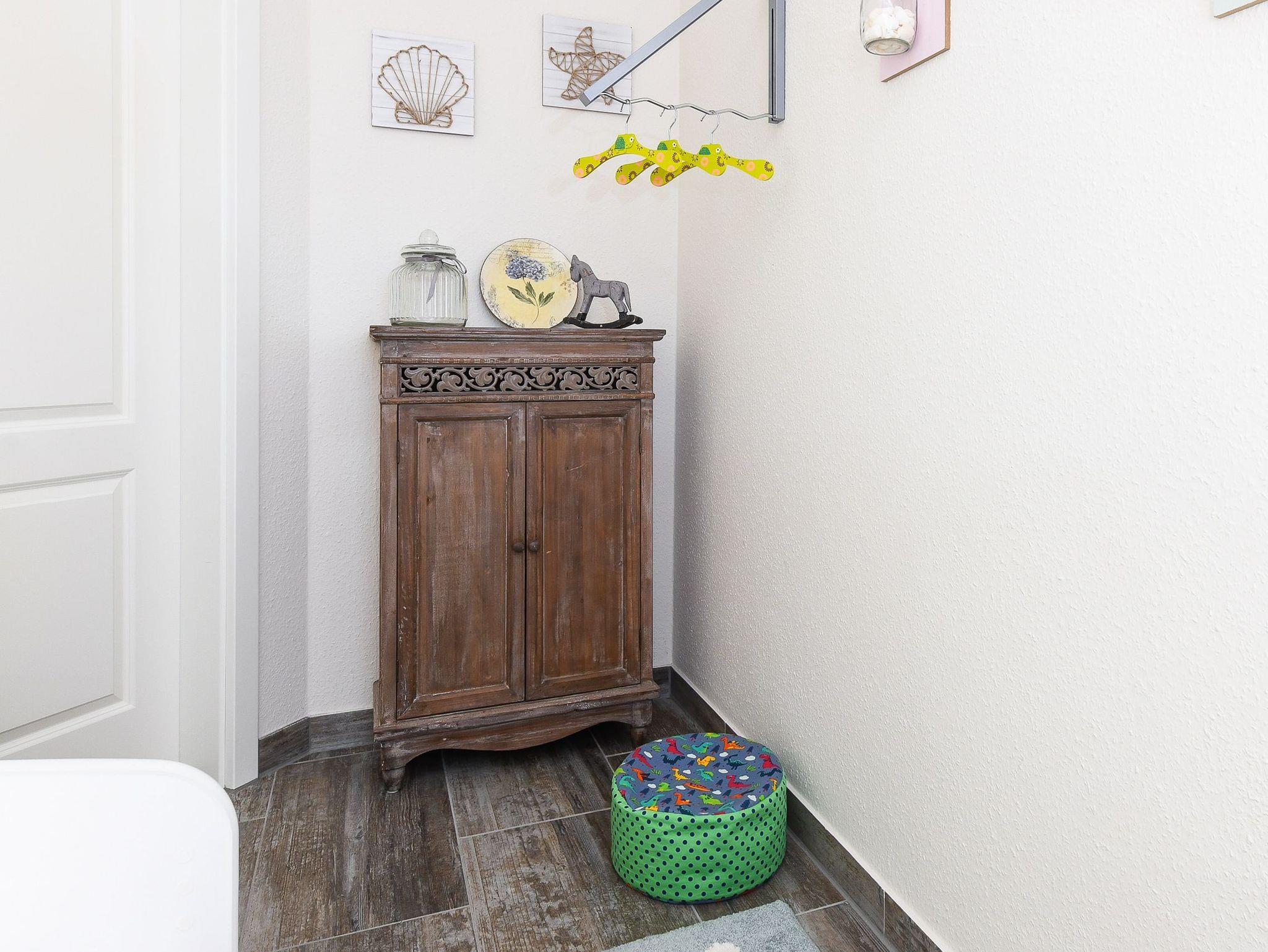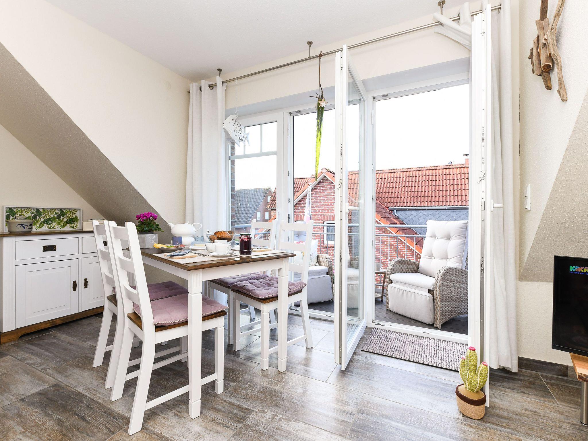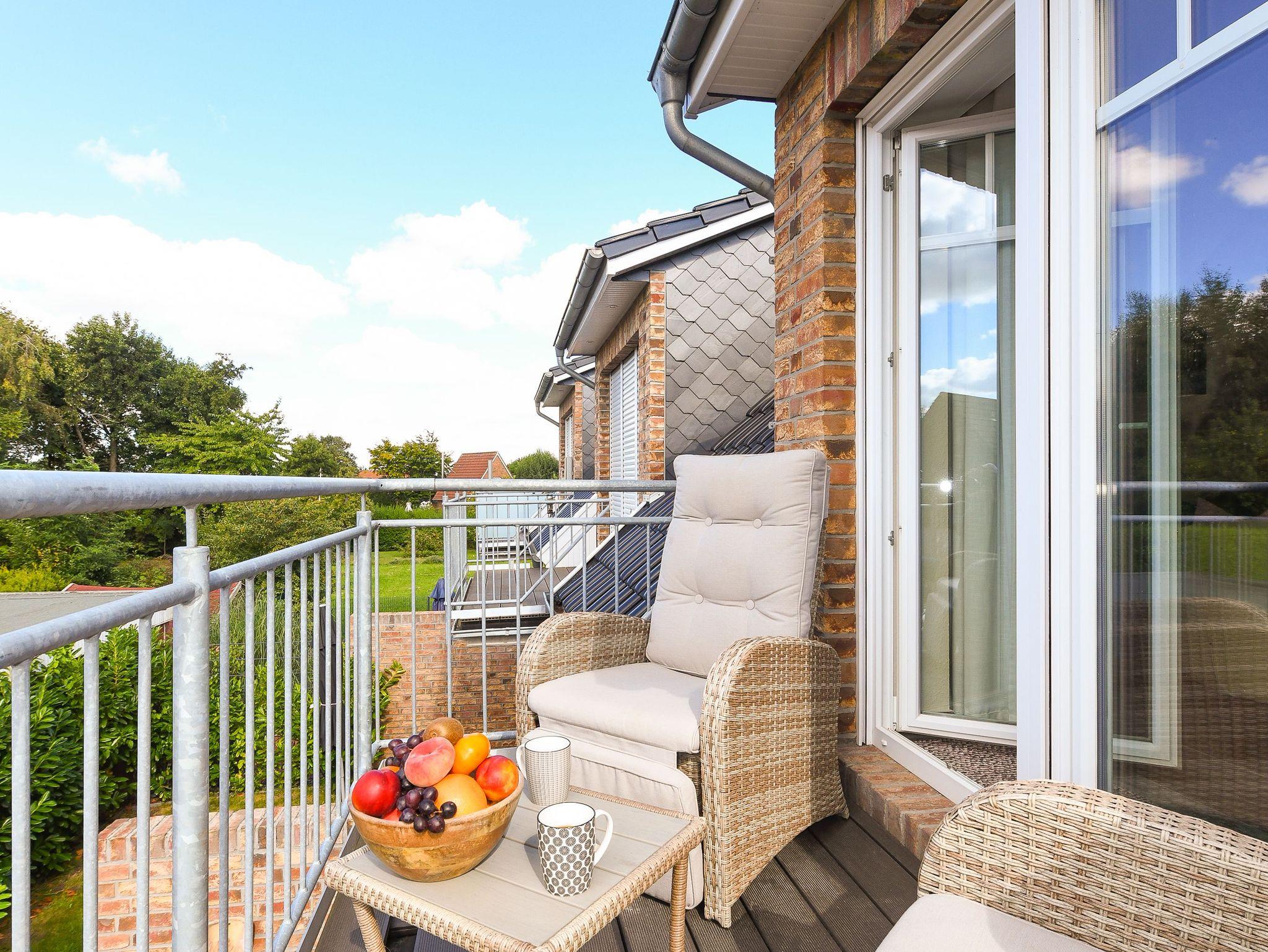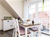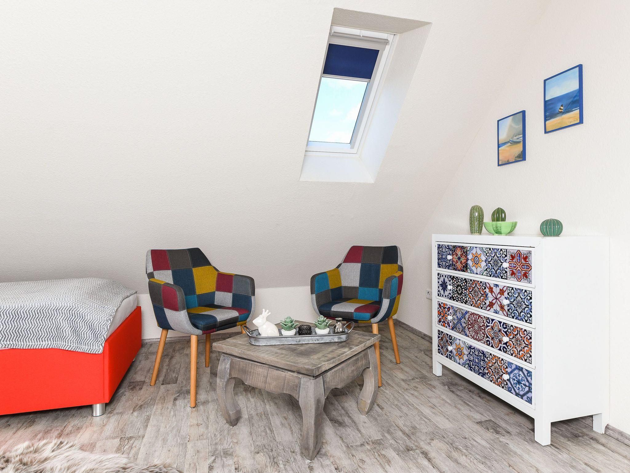 Die gemütlich und freundlich eingerichtete Ferienwohnung ist ungefähr 60 Quadratmeter groß und verfügt über drei Schlaf- bzw. Kinderzimmer, einem Wohnraum mit integrieter Küche sowie einem nach Süden ausgerichteten Balkon. Die Ferienwohnung „Kiebitz“ ist damit sehr gut geeignet für zwei bis vier Personen und ein zusätzliches Kleinkind.