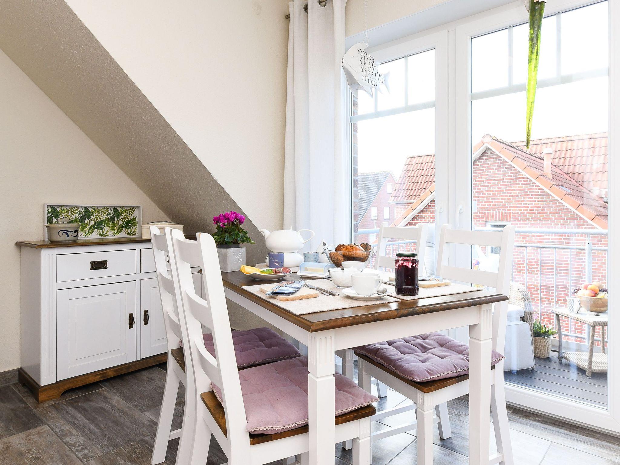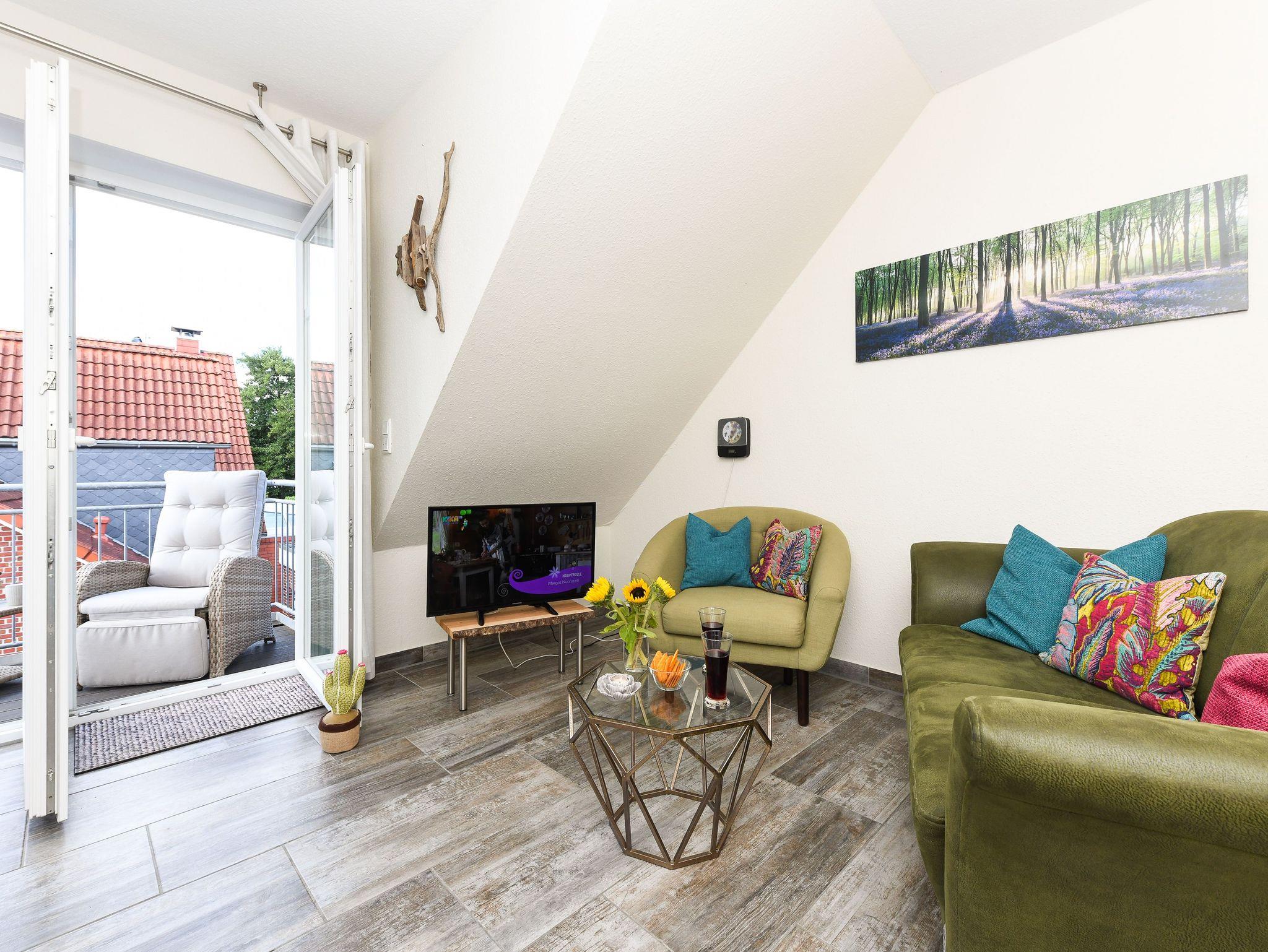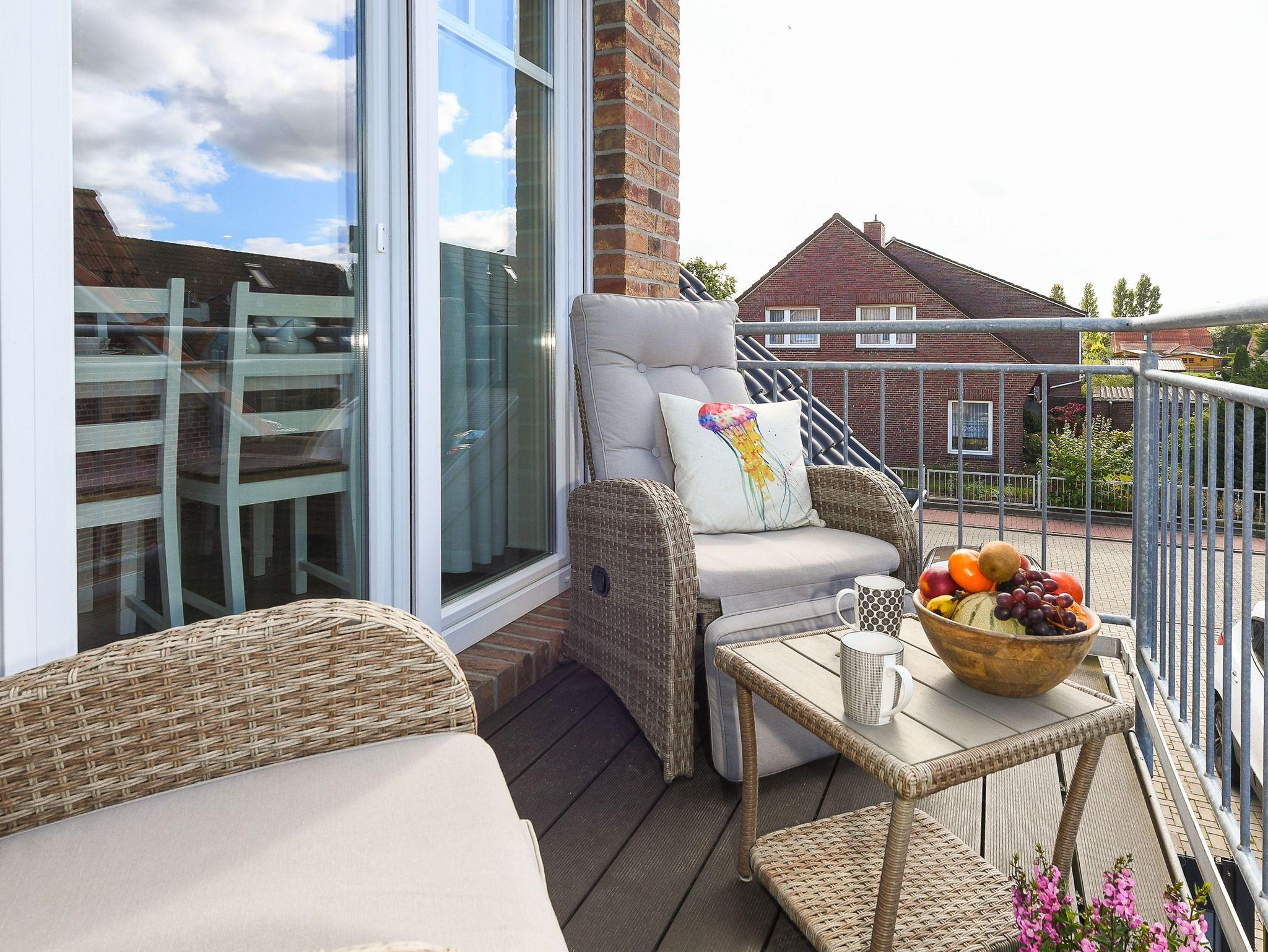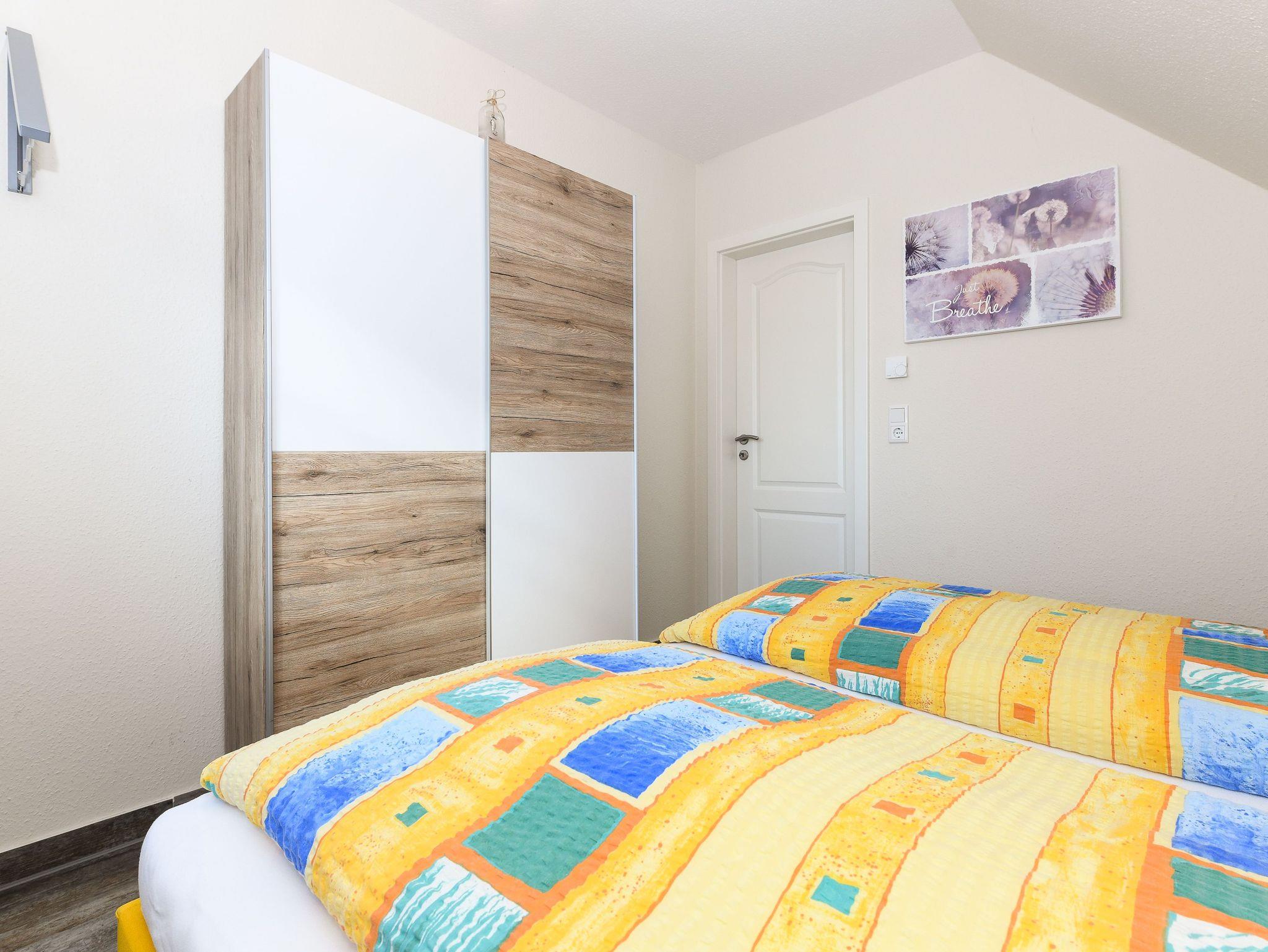 Die gemütlich und freundlich eingerichtete Ferienwohnung ist ungefähr 60 Quadratmeter groß und verfügt über drei Schlaf- bzw. Kinderzimmer, einem Wohnraum mit integrieter Küche sowie einem nach Süden ausgerichteten Balkon. Die Ferienwohnung „Kiebitz“ ist damit sehr gut geeignet für zwei bis vier Personen und ein zusätzliches Kleinkind.