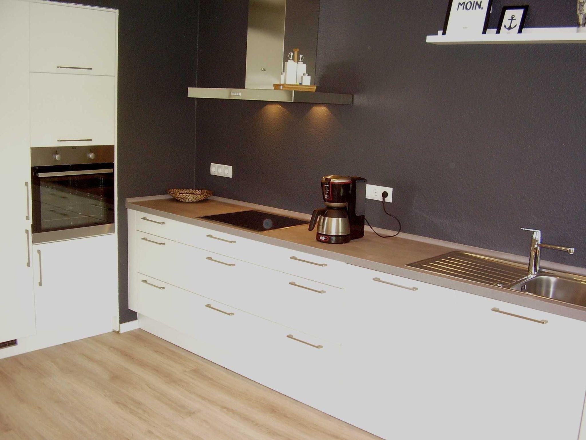 Moderne Einbauküche, die mit E-Herd mit Ceranfeld, Backofen auf Griffhöhe, grossem Kühlschrank mit Gefrierfach, Geschirrspüler, Mikrowelle, Wasserkocher, Kaffeemaschine, sonstigen erforderlichen Elektrogeräten und natürlich mit ausreichend Gläsern, Geschirr und Küchenausstattung ausgestattet ist.