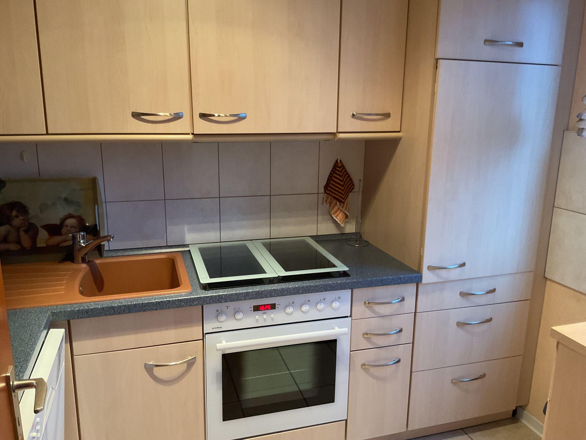 Separate Küche mit Einbauküche mit VierPlattenHerd mit Backofen und Ceranfeld, Spülmaschine, Waschmaschine, Kühlschrank mit Gefrierfach, Mikrowelle und allen erforderlichen Elektrogeräten, sowie ausreichend Geschirr, Besteck, Töpfe, etc..