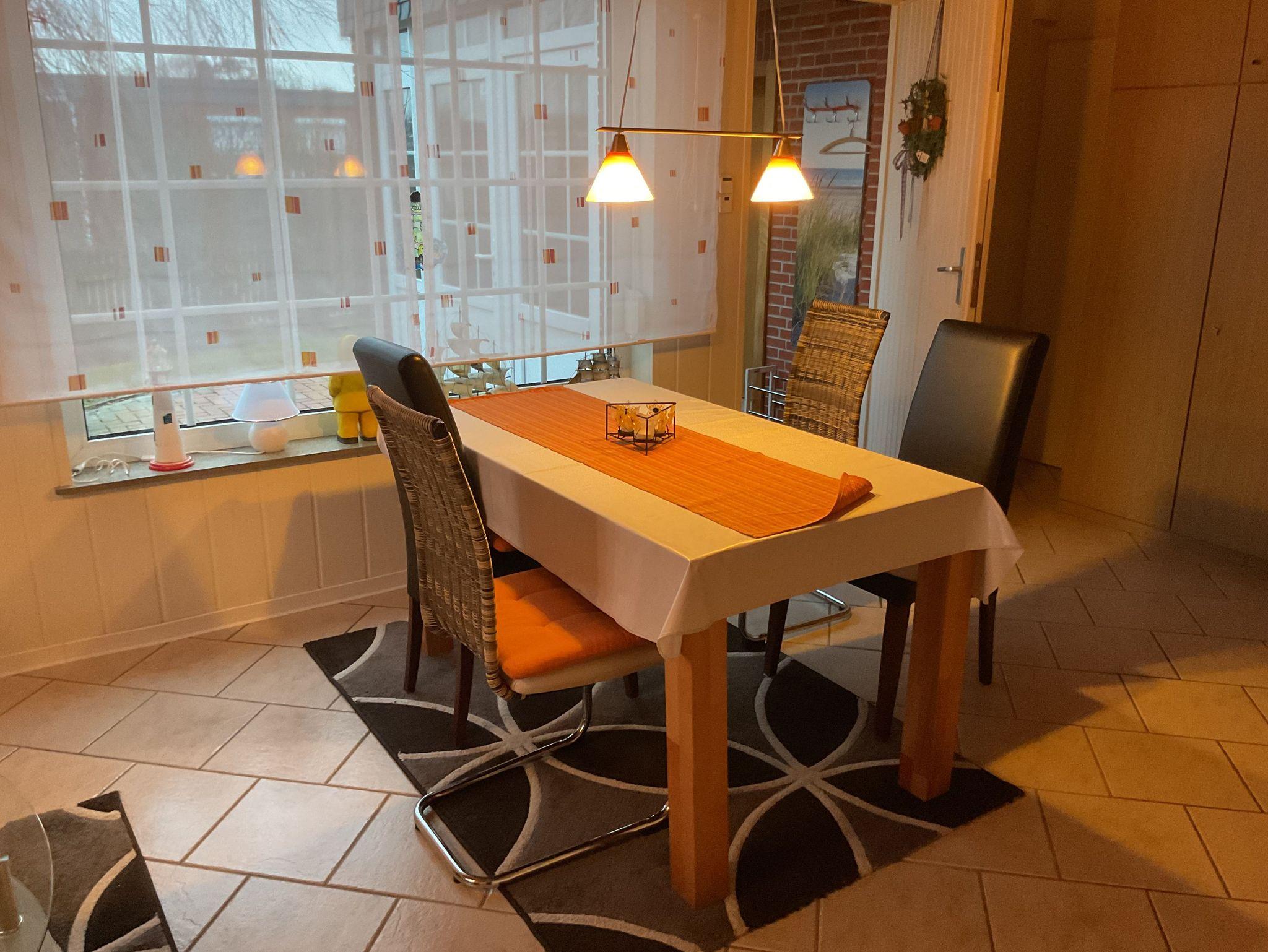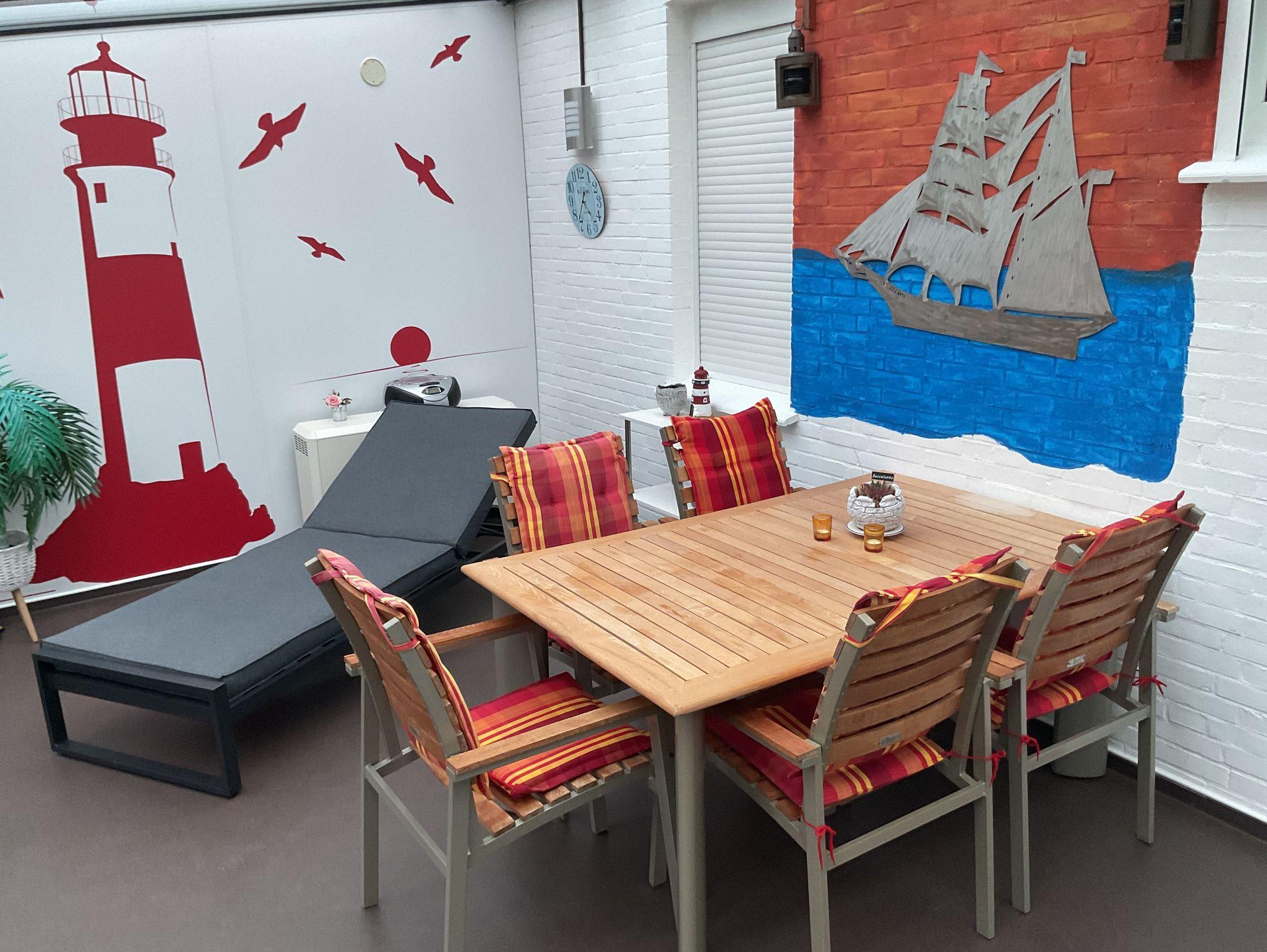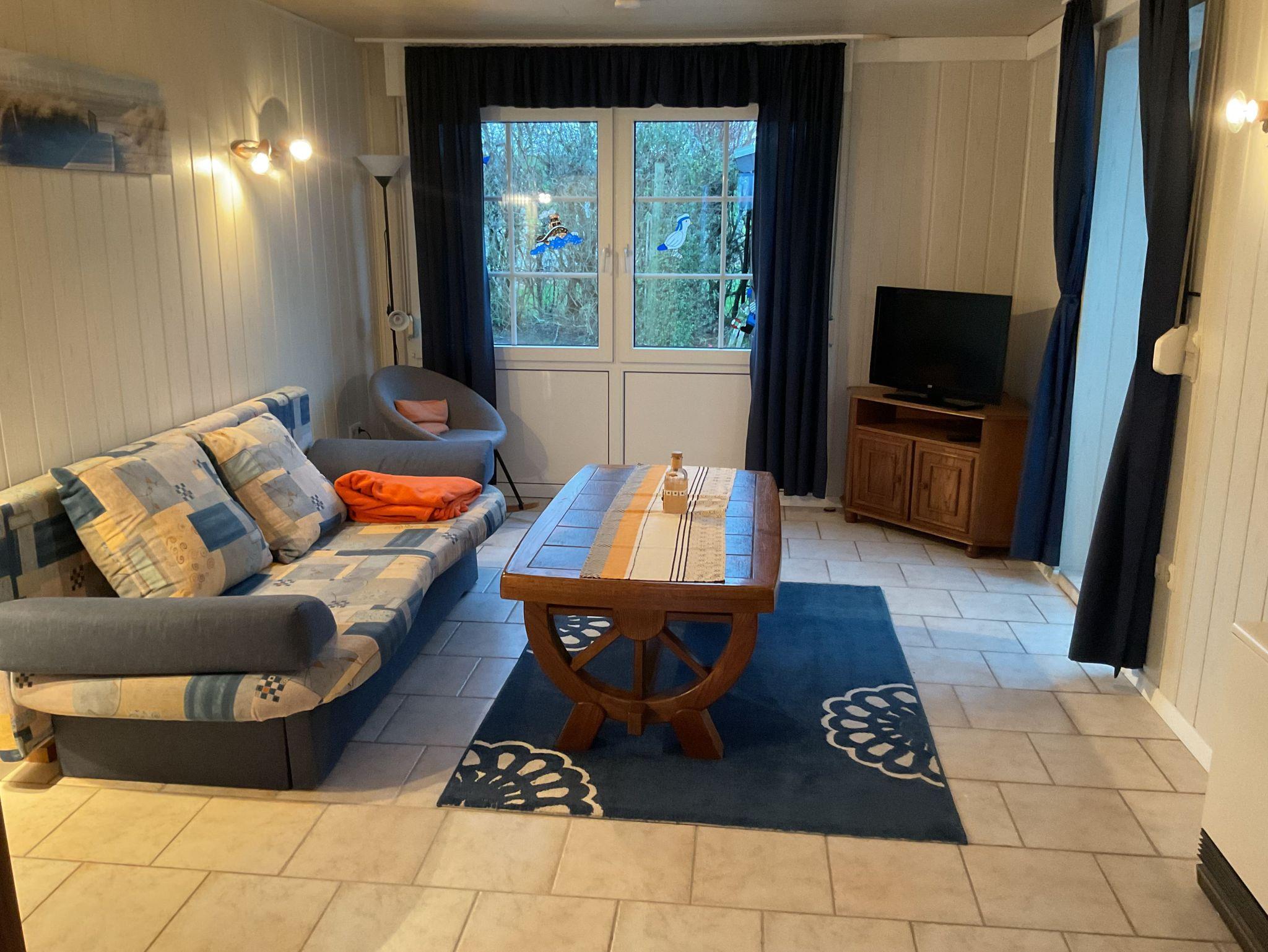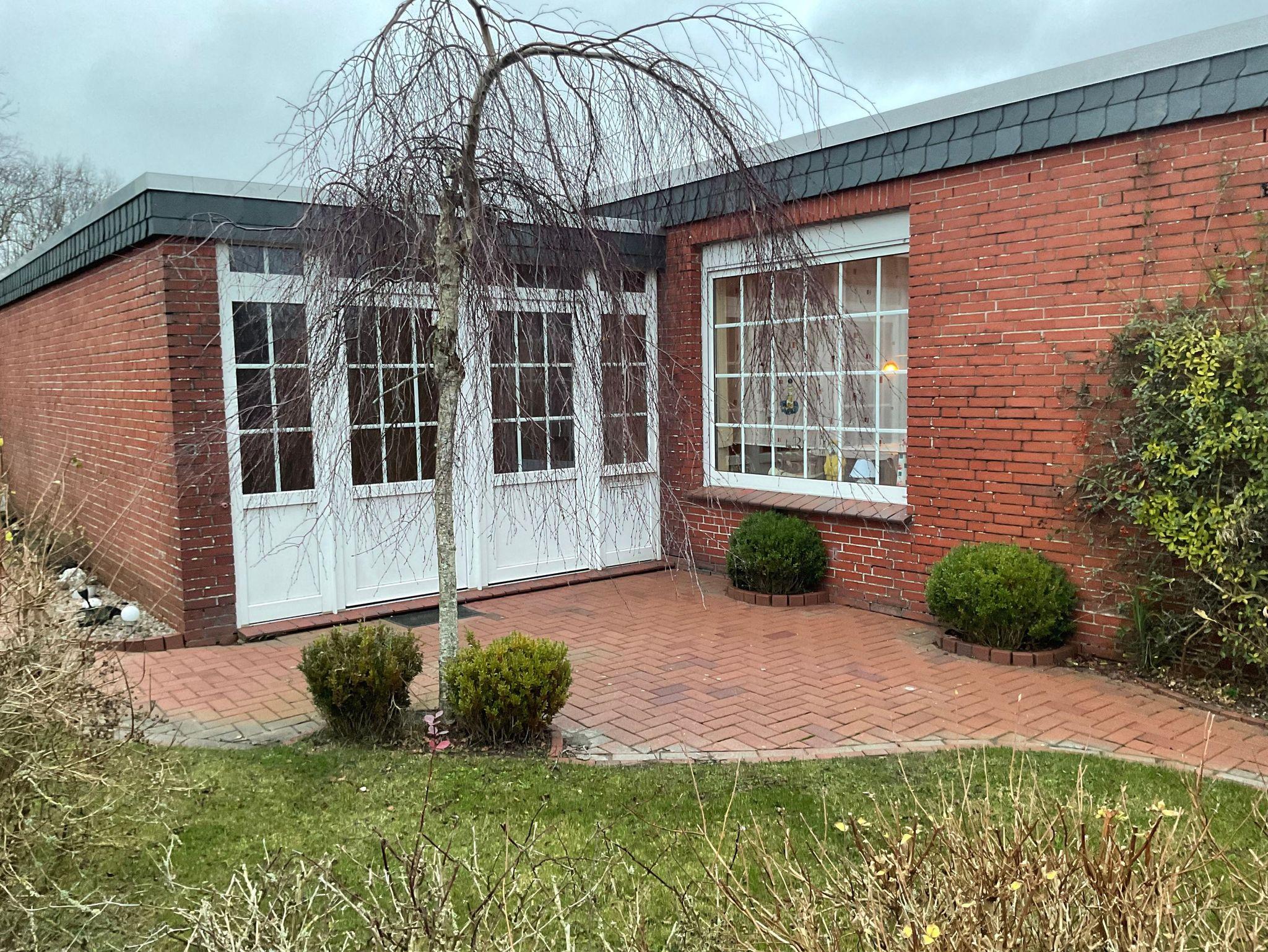 Nichtraucher Bungalow mit beheiztem Wintergarten, zwei Wohnzimmern mit Flachbild-TV und einem eingewachsenem Grundstück in ruhiger Ferienhaussiedlung in Dornumersiel; in erster Reihe hinter dem Deich, nur 3 Minuten bis zum Strand, Hafen, solarbeheiztem Meerwasserschwimmbad, Kinderspielhaus und Kurpark.