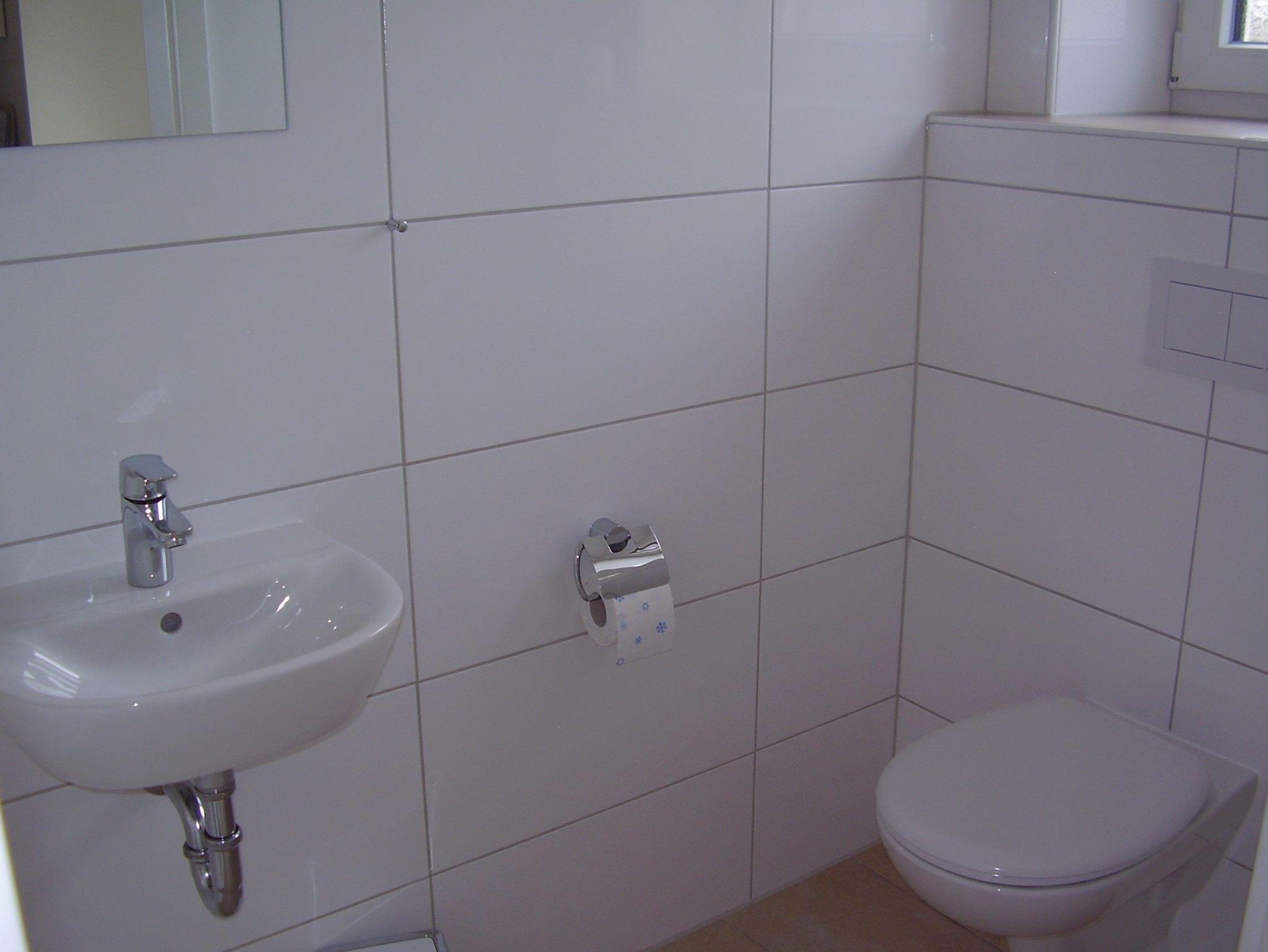 Tageslicht-Badezimmer mit grosser Dusche und Hänge-WC.