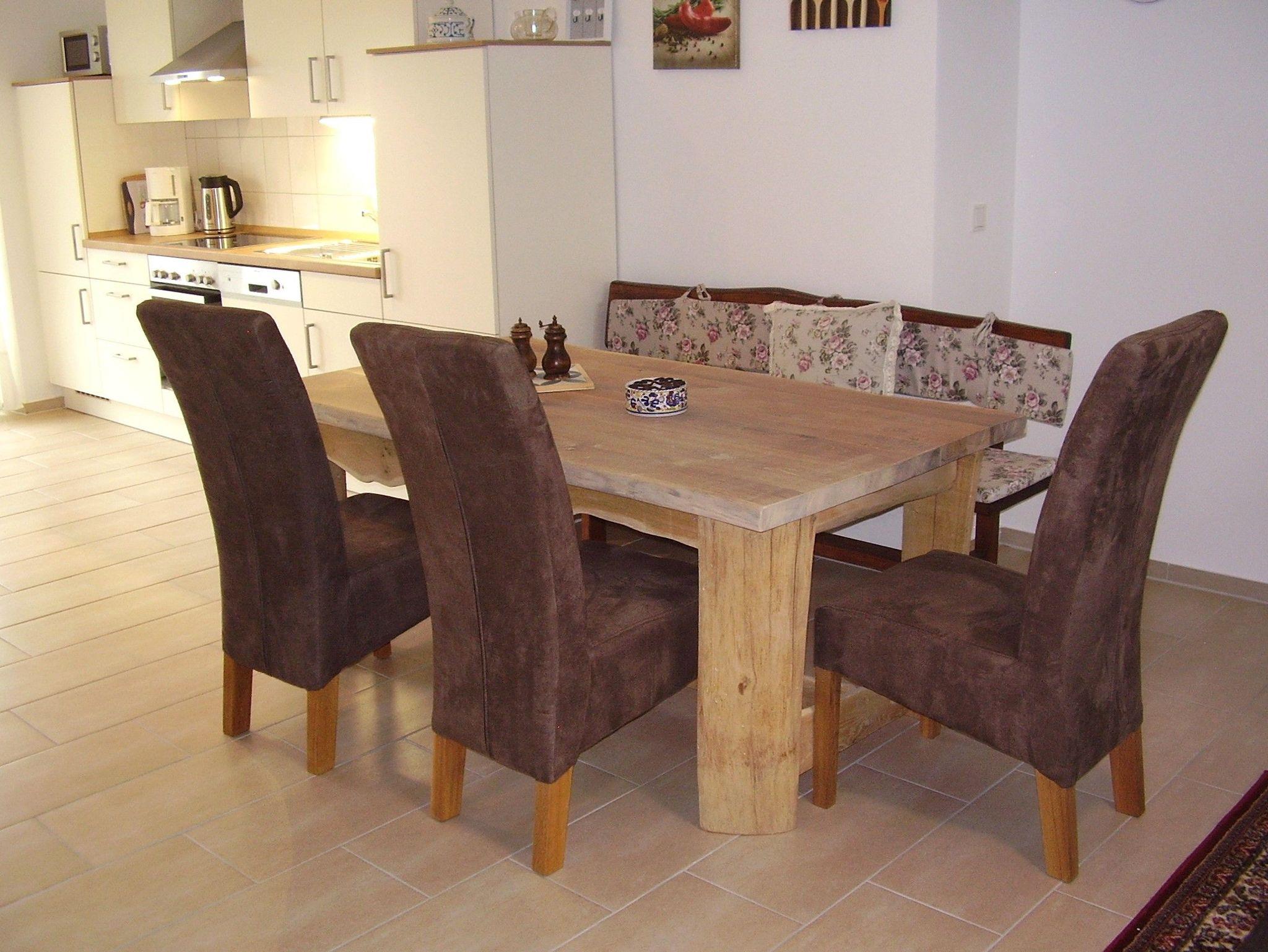 Erdgeschoss: Sehr grosszügiges Wohn- und Esszimmer mit gemütlicher Sitzgruppe und Flachbild-TV mit Satempfang. Einbauküche mit VierPlattenHerd mit Ceranfeld und Backofen, Spülmaschine, Kühlschrank, Mikrowelle und allen erforderlichen Elektrogeräten, sowie ausreichend Geschirr, Besteck, Töpfe, etc.. Massiver grosser Esstisch mit Bestuhlung.