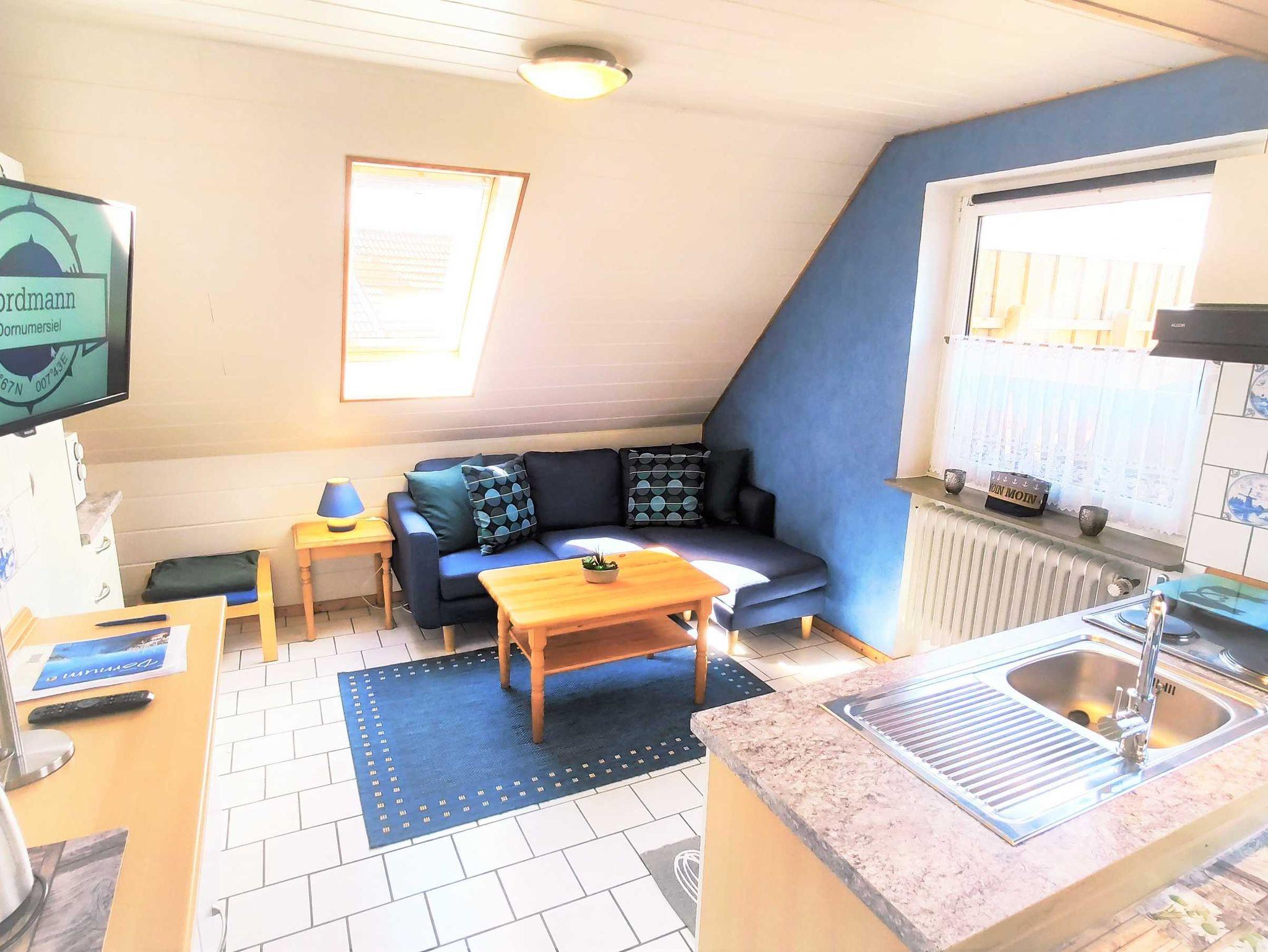 Die Wohnung Nord verfügt über ein Schlafzimmer mit einem Doppelbett, eine Wohnküche mit kompletter Küchenzeile, Sat-TV und gemütlicher Sitzecke, einem eigenen Balkon, sowie einem Duschbad.
