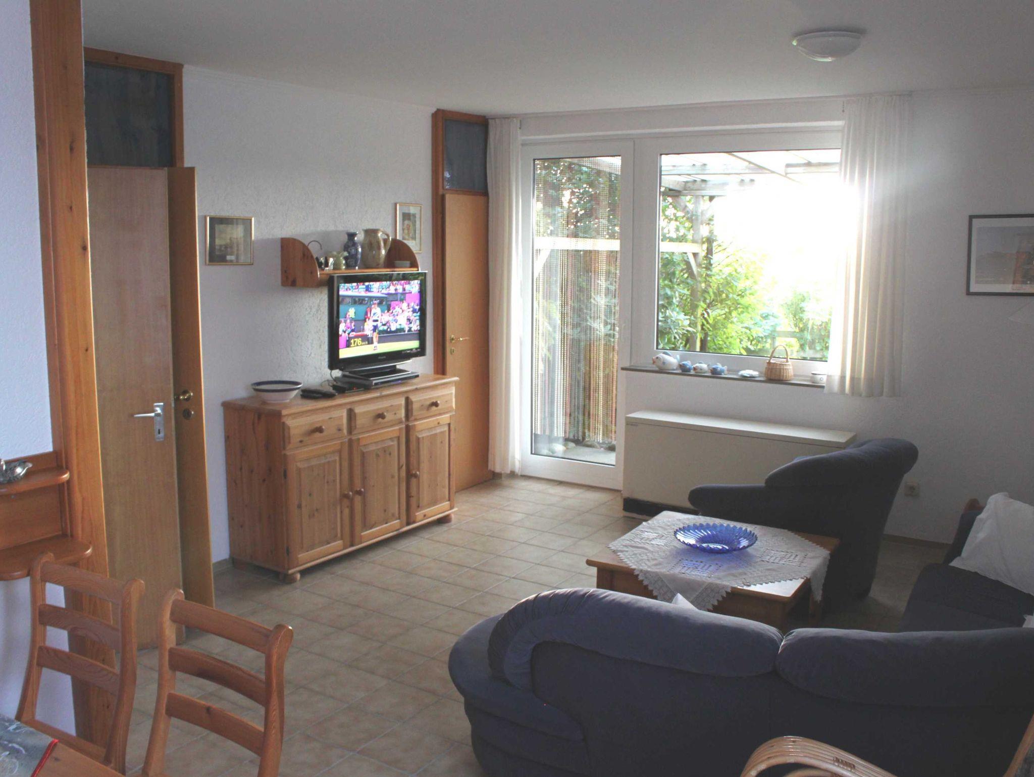 Offenes Wohn- und Esszimmer mit gemütlicher Couchgarnitur und Flachbild-TV, Essplatz mit Bestuhlung. Von hier hat man einen direkten Zugang zur überdachten Terrasse und dem eingewachsenen Garten mit unverbaubarer Fernsicht.