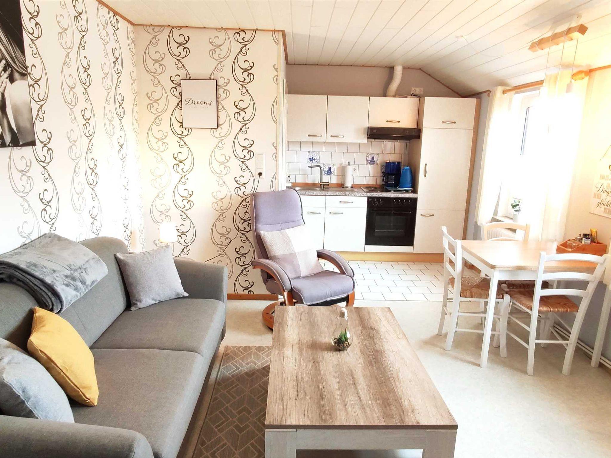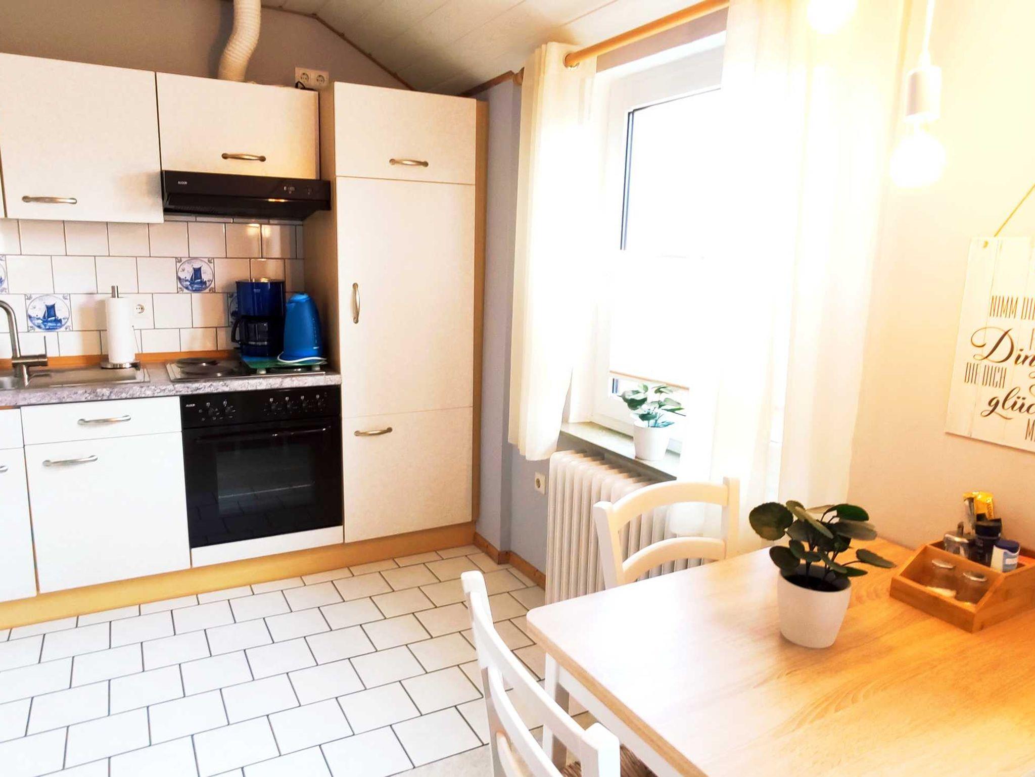 Die Wohnung Ost verfügt über ein Schlafzimmer mit einem Doppelbett und einem Einzelbett (auf Wunsch kann ein Babybett aufgestellt werden), einer moderne Wohnküche mit kompletter Küchenzeile, Sat-TV und gemütlicher Sitzecke, sowie einem Duschbad.