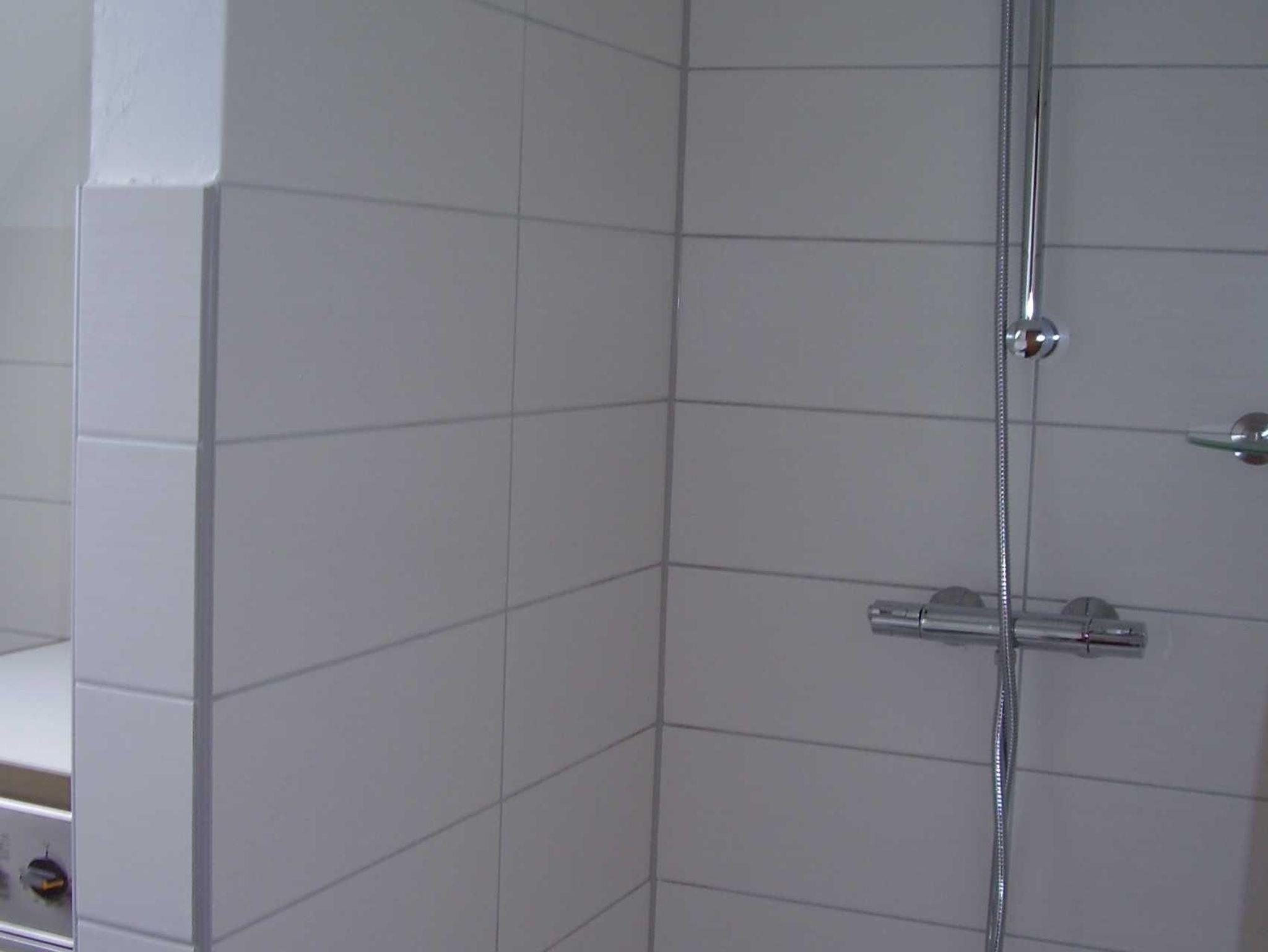 Badezimmer mit Dusche und Waschmaschine.