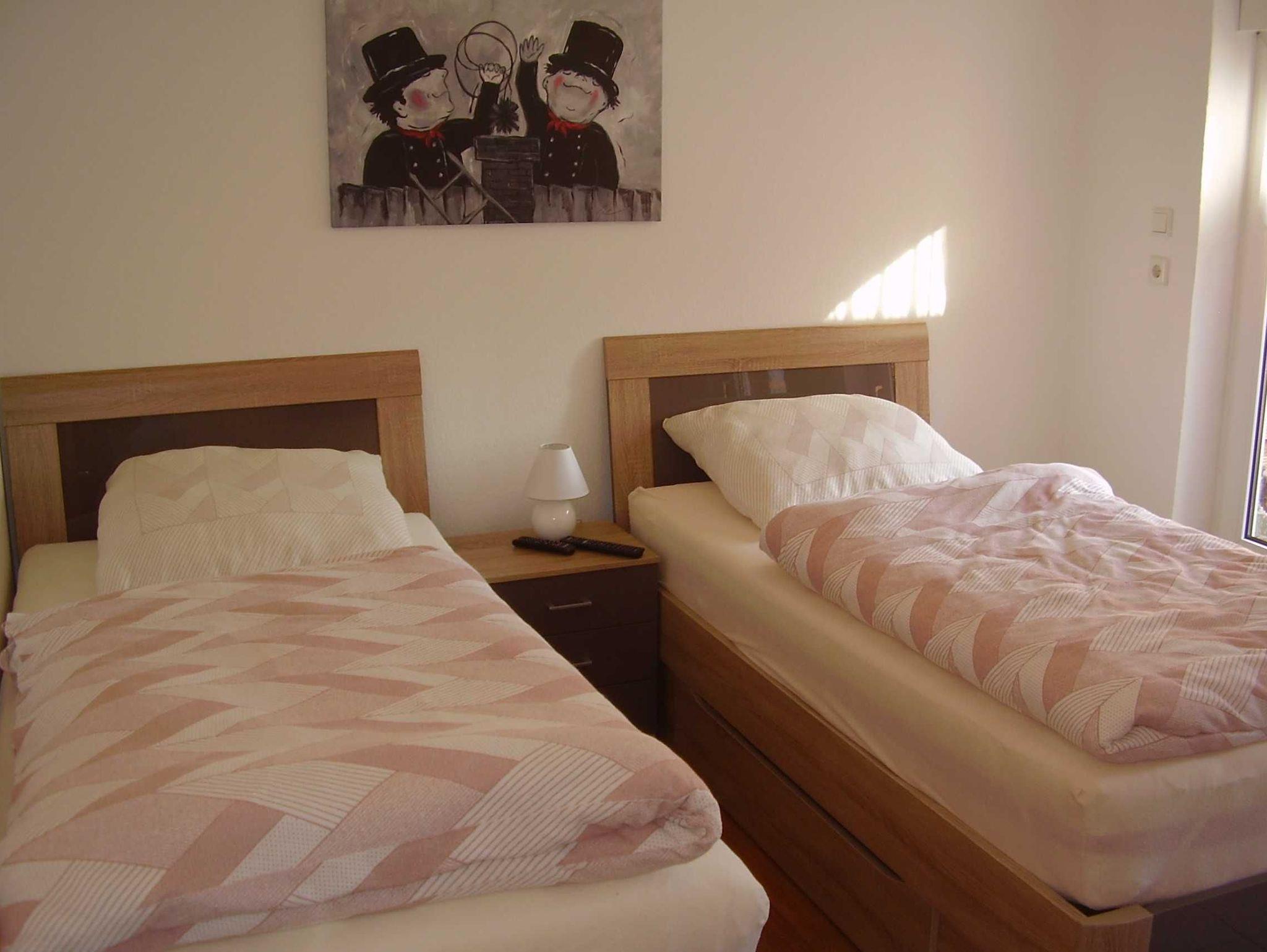Ein Schlaf-/Kinderzimmer mit zwei grossen Einzelbetten und einem Flachbild-TV.