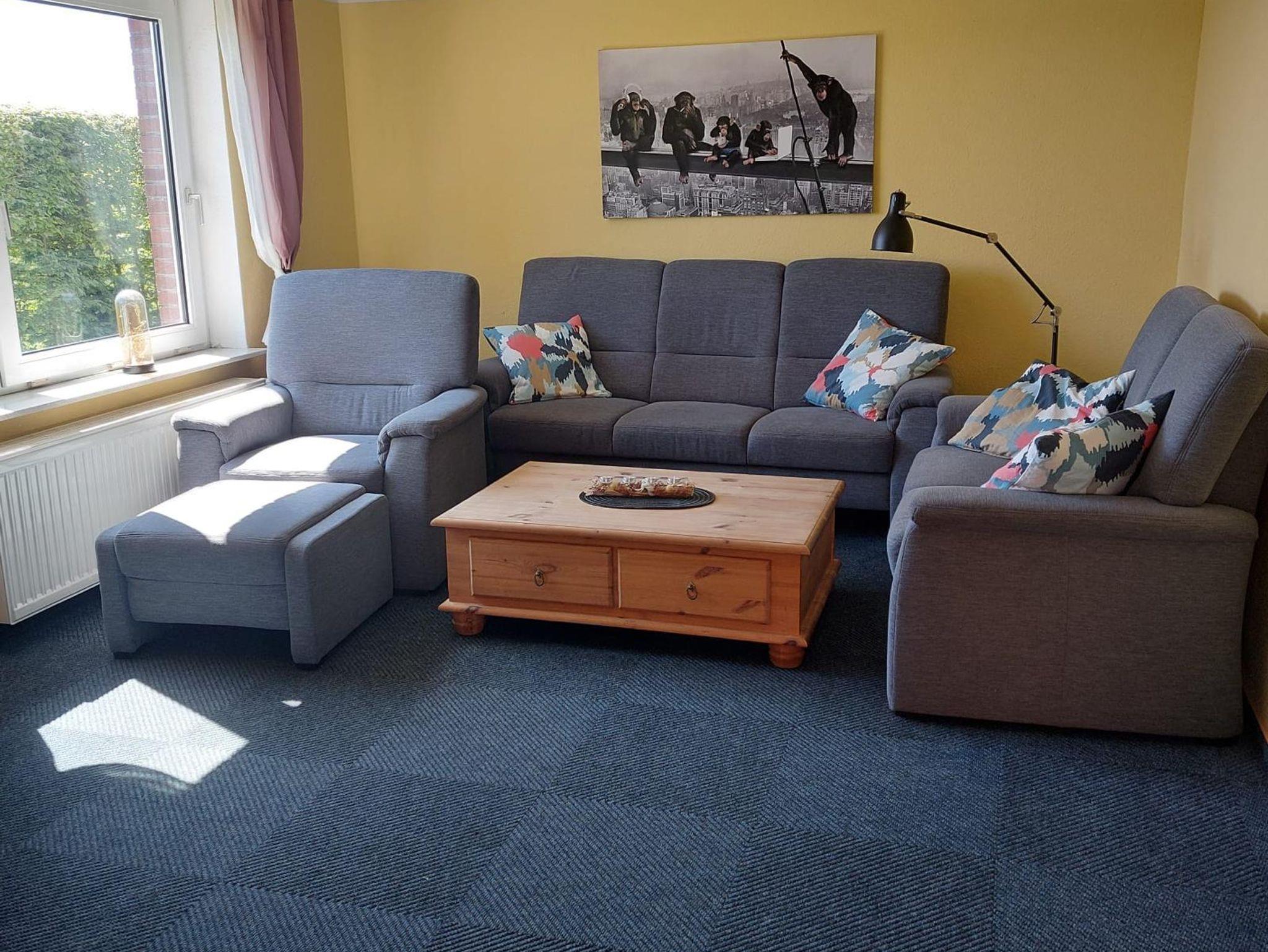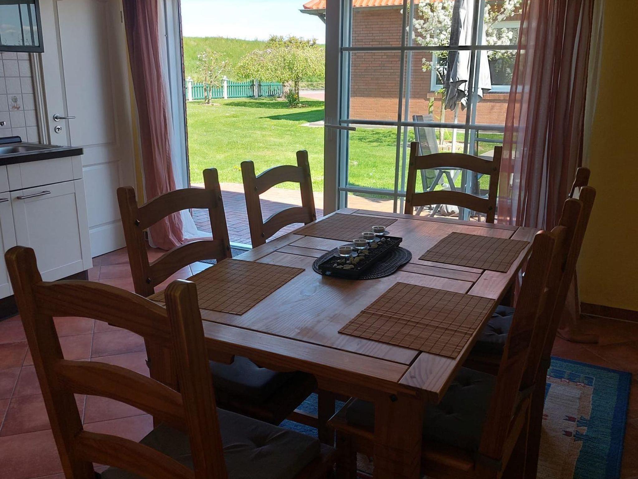 Unsere kleine Ferienwohnung im Erdgeschoss (ca. 45 m²) liegt direkt vorm Deich. Im Wohn-/Essbereich werden Sie eine ein Sat-TV und Stereoanlage sowie eine Küchenzeile mit div. elektr. Geräten wie Kaffeemaschine, Wasserkocher, Toaster u.s.w. vorfinden.