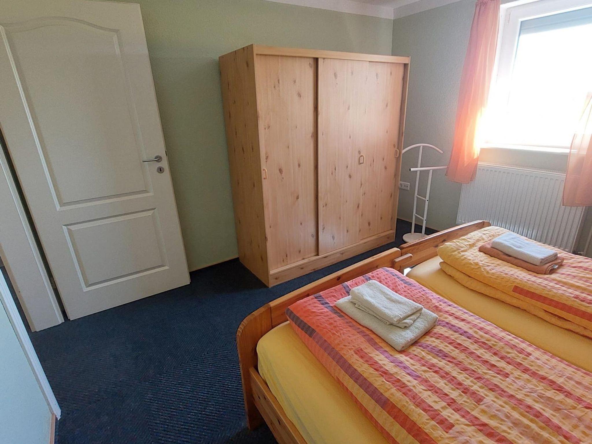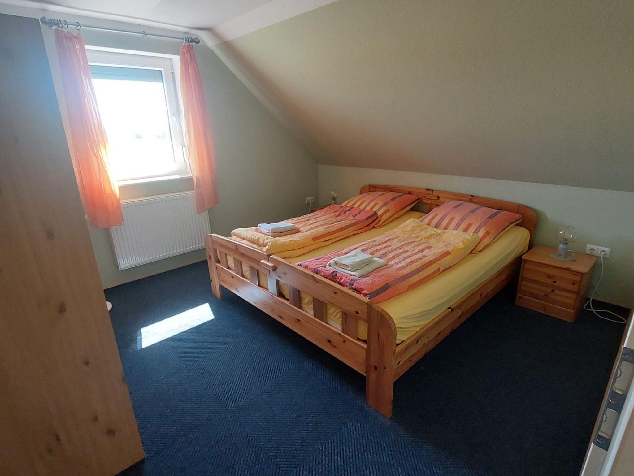 Auf einer Wohnfläche von ca. 55 m² werden Sie in unserer Ferienwohnung im Obergeschoss einen kombinierten Wohn-/Essbereich mit Sat-TV, eine integrierte Küchenzeile mit Vierplattenherd und Backofen, Kühlschrank mit Gefrierkombination sowie eine Mikrowelle und div. elektrischen Geräte vorfinden. Zwei Schlafräume sind mit jeweils einem Doppelbett ausgestattet und Ihre Betten sind bereits bei Anreise bezogen. Das Bad verfügt über Dusche/WC.