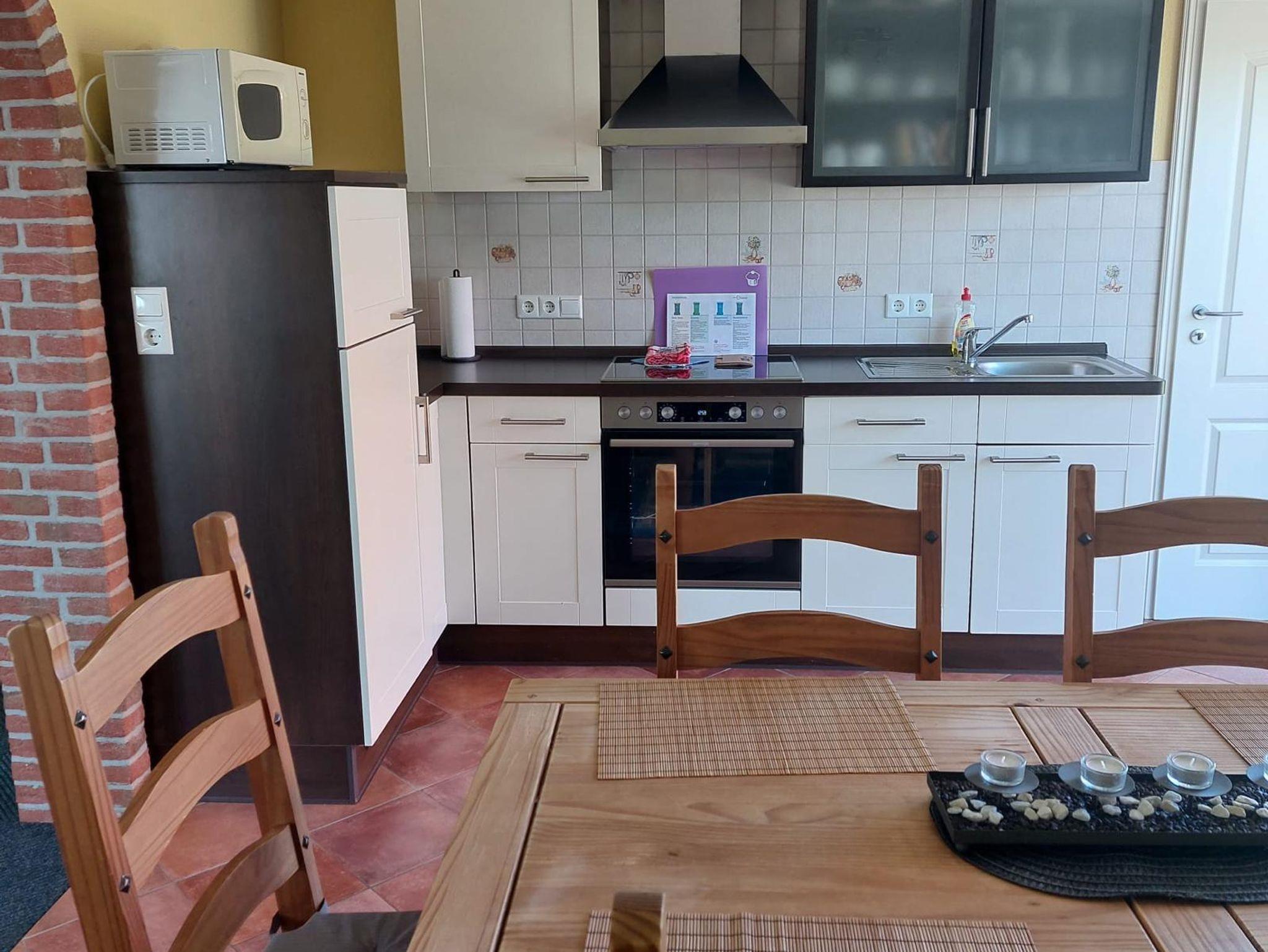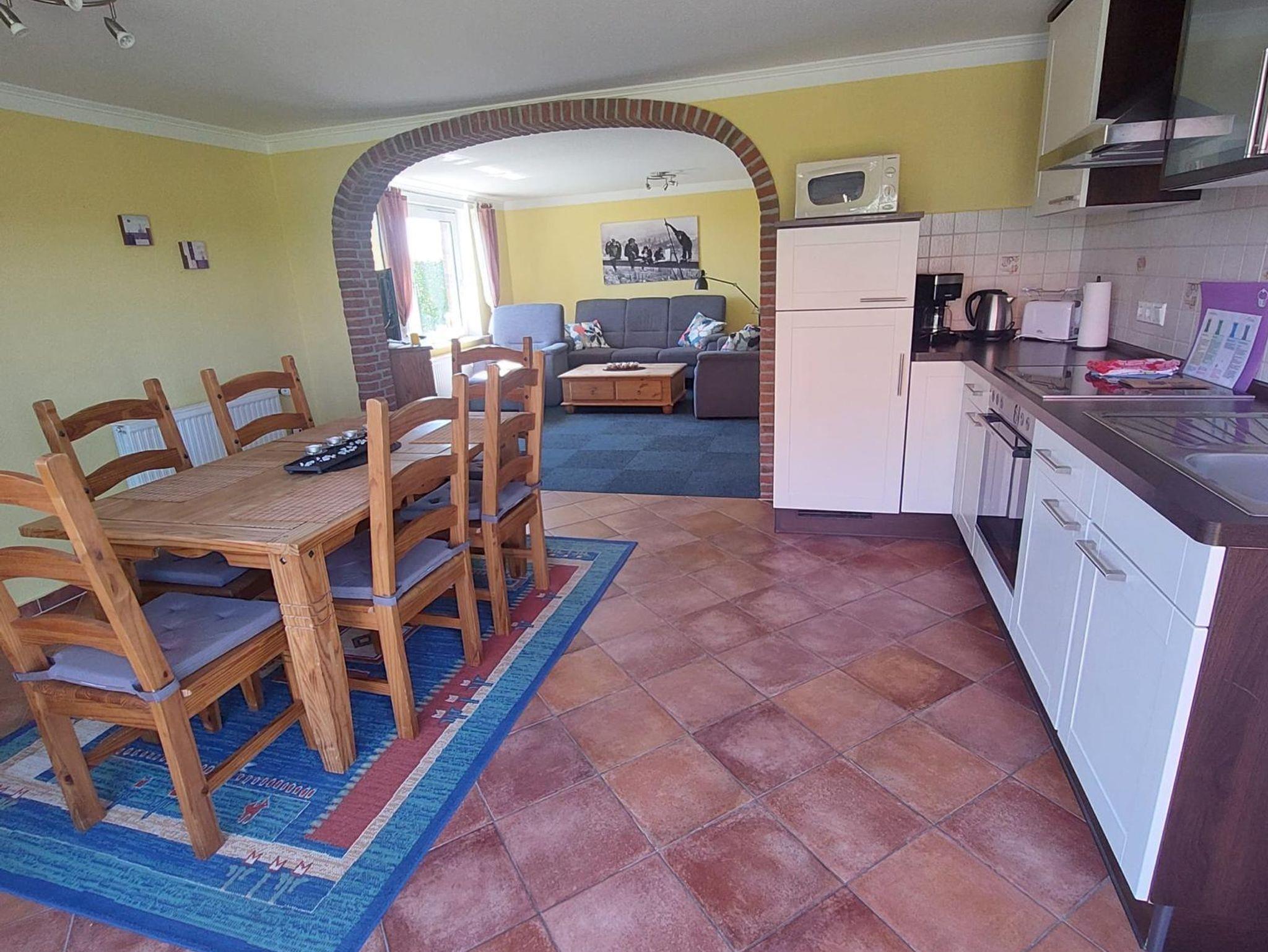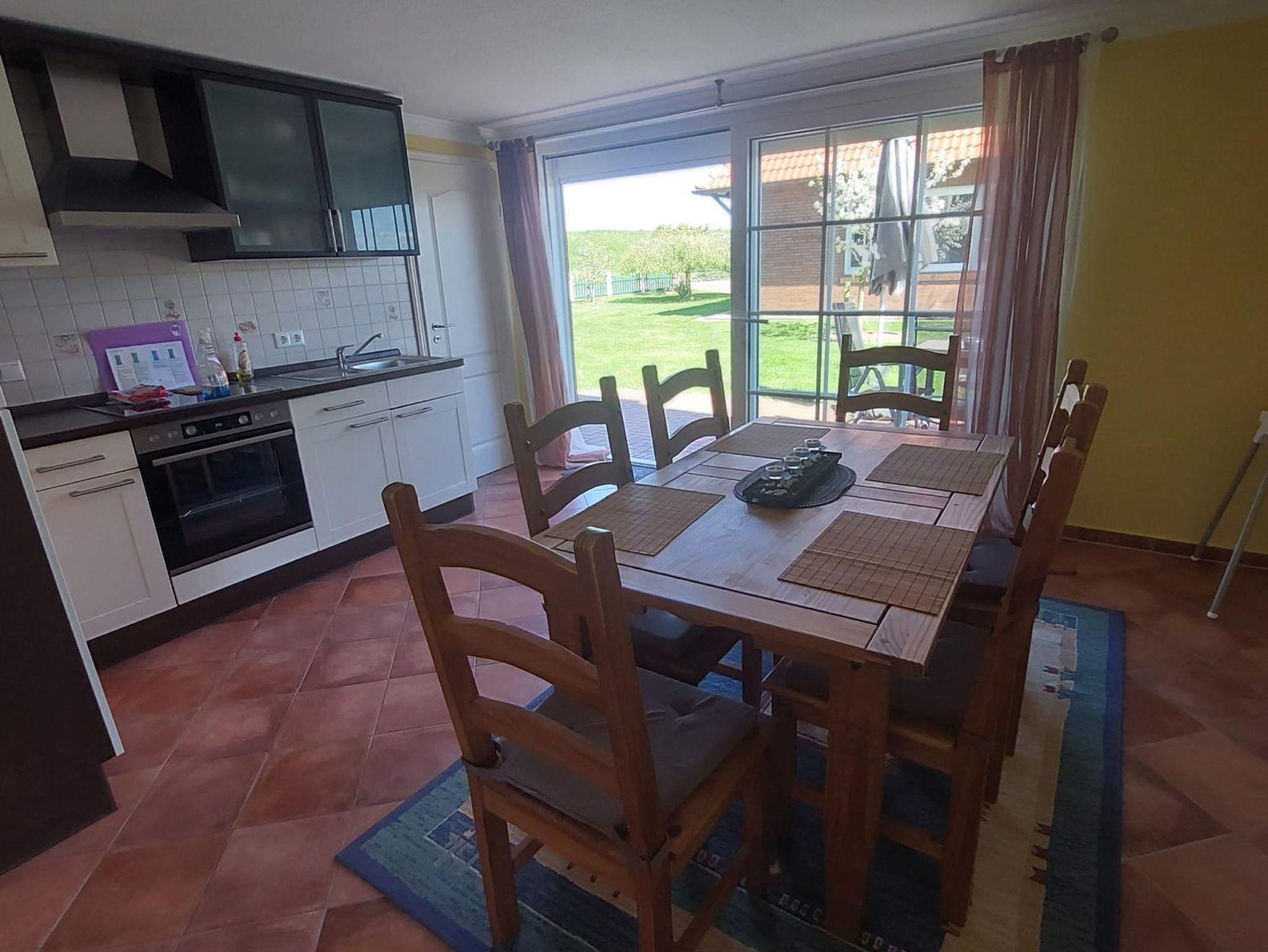 Ferienwohnung West (ca. 55 m²) befindet sich im Erdgeschoss und ist zum Westen ausgerichtet. Im Wohnzimmer erwartet Sie ein Sat-TV sowie eine Stereoanlage. In der separaten Küche erwartet Sie eine komplett eingerichtete Küchenzeile mit einem Vierplattenherd und Backofen, Kühlschrank mit Gefrierkombination, Mikrowelle und div. elektrischen Geräten.