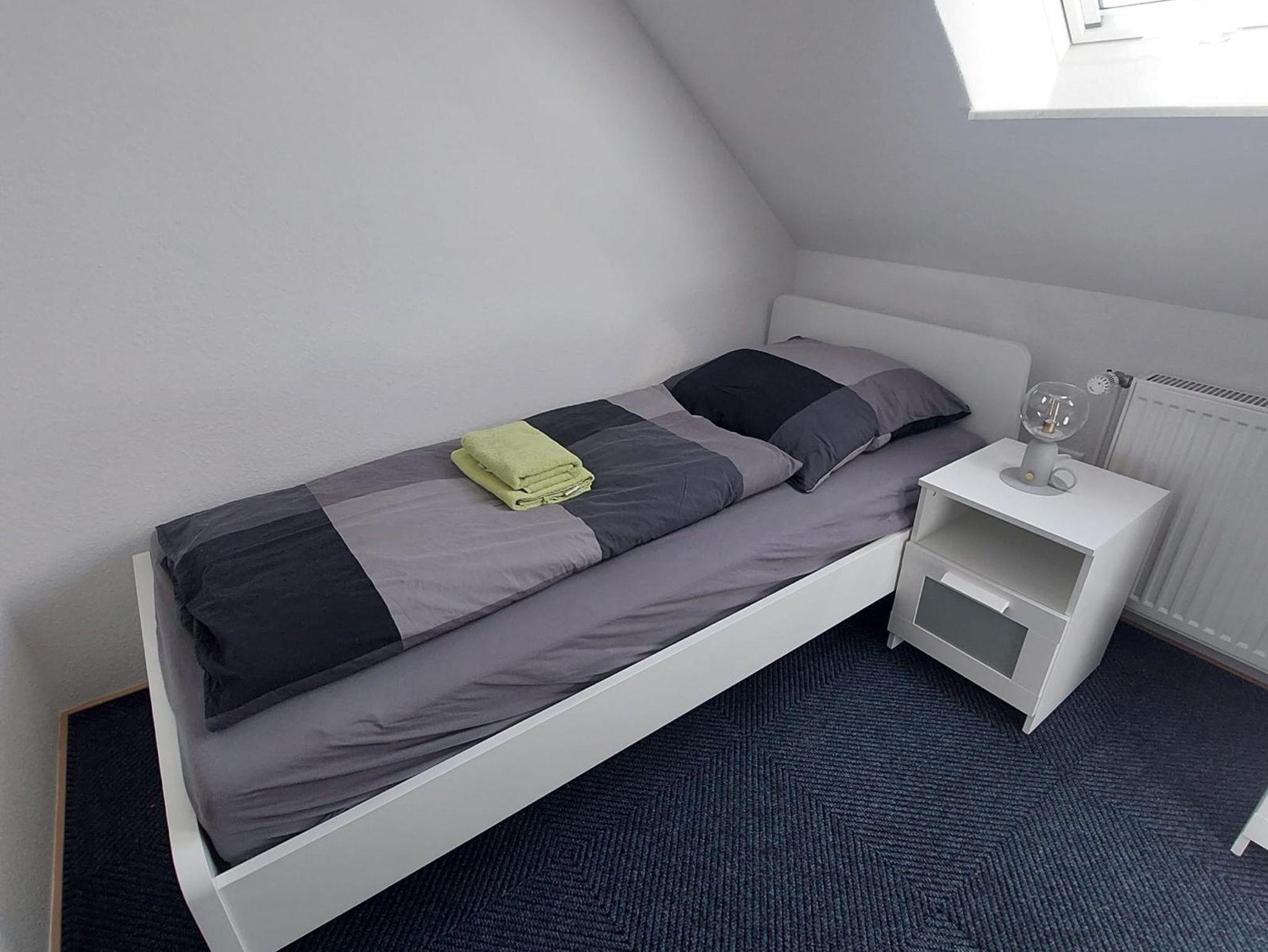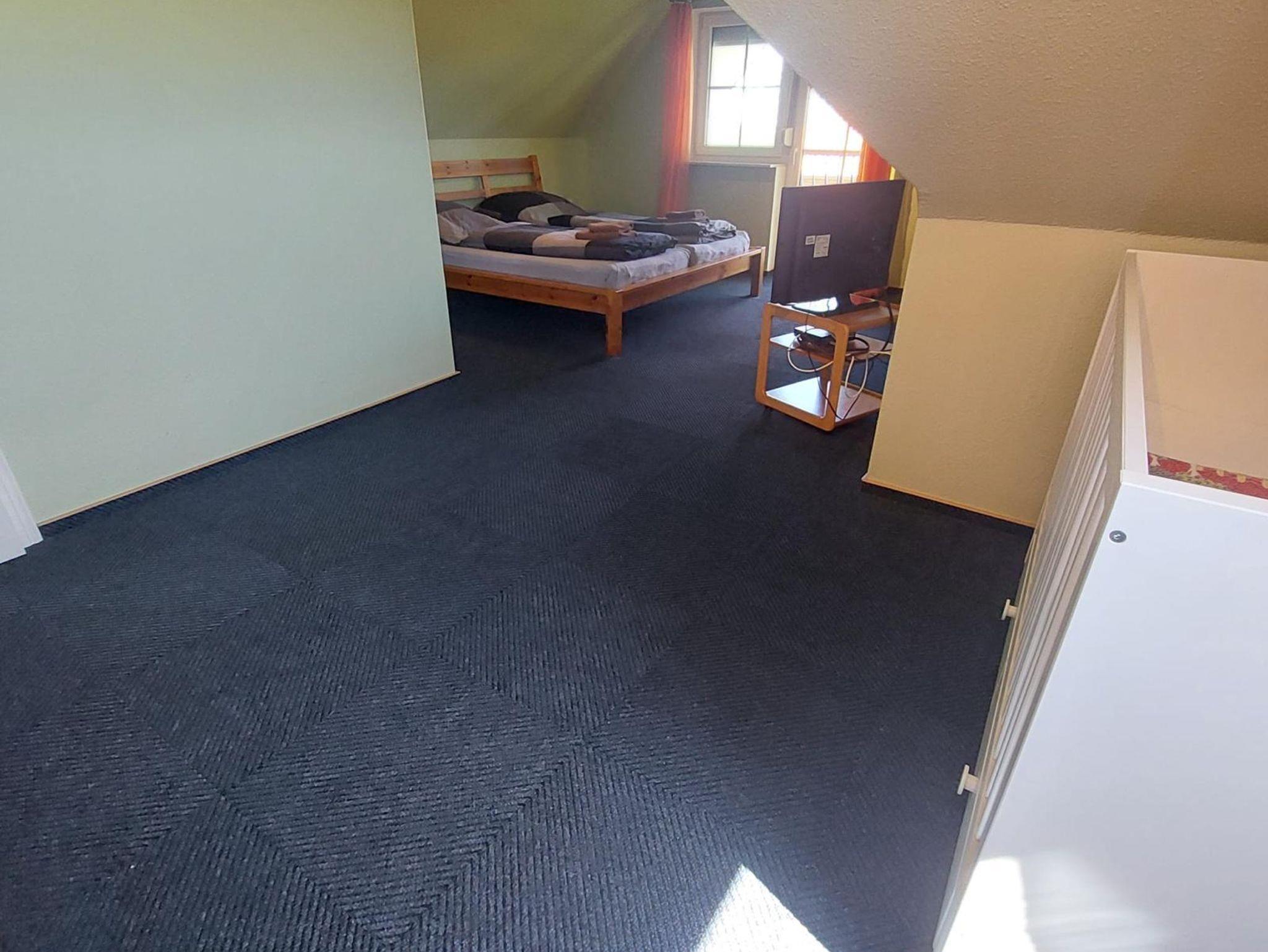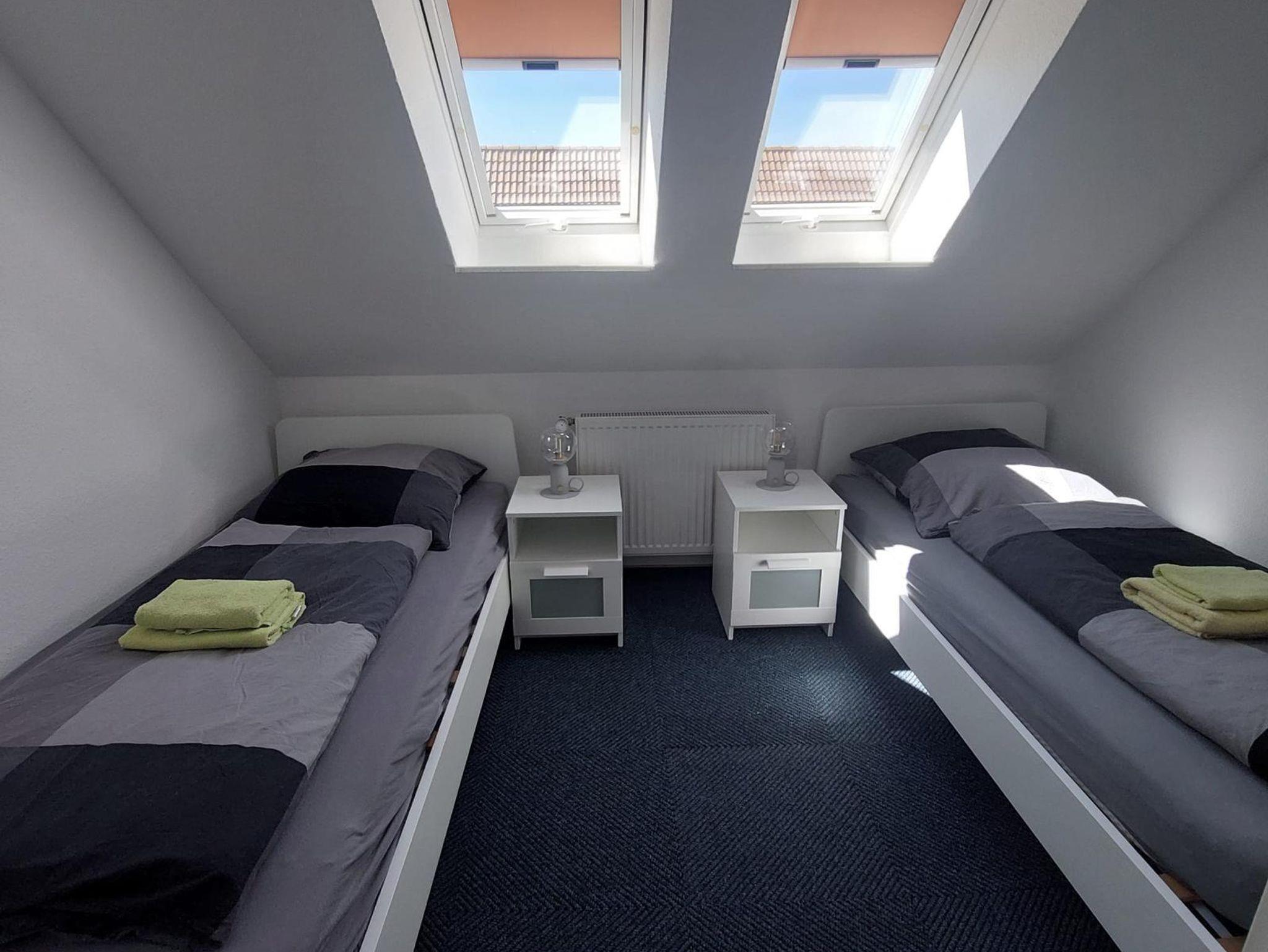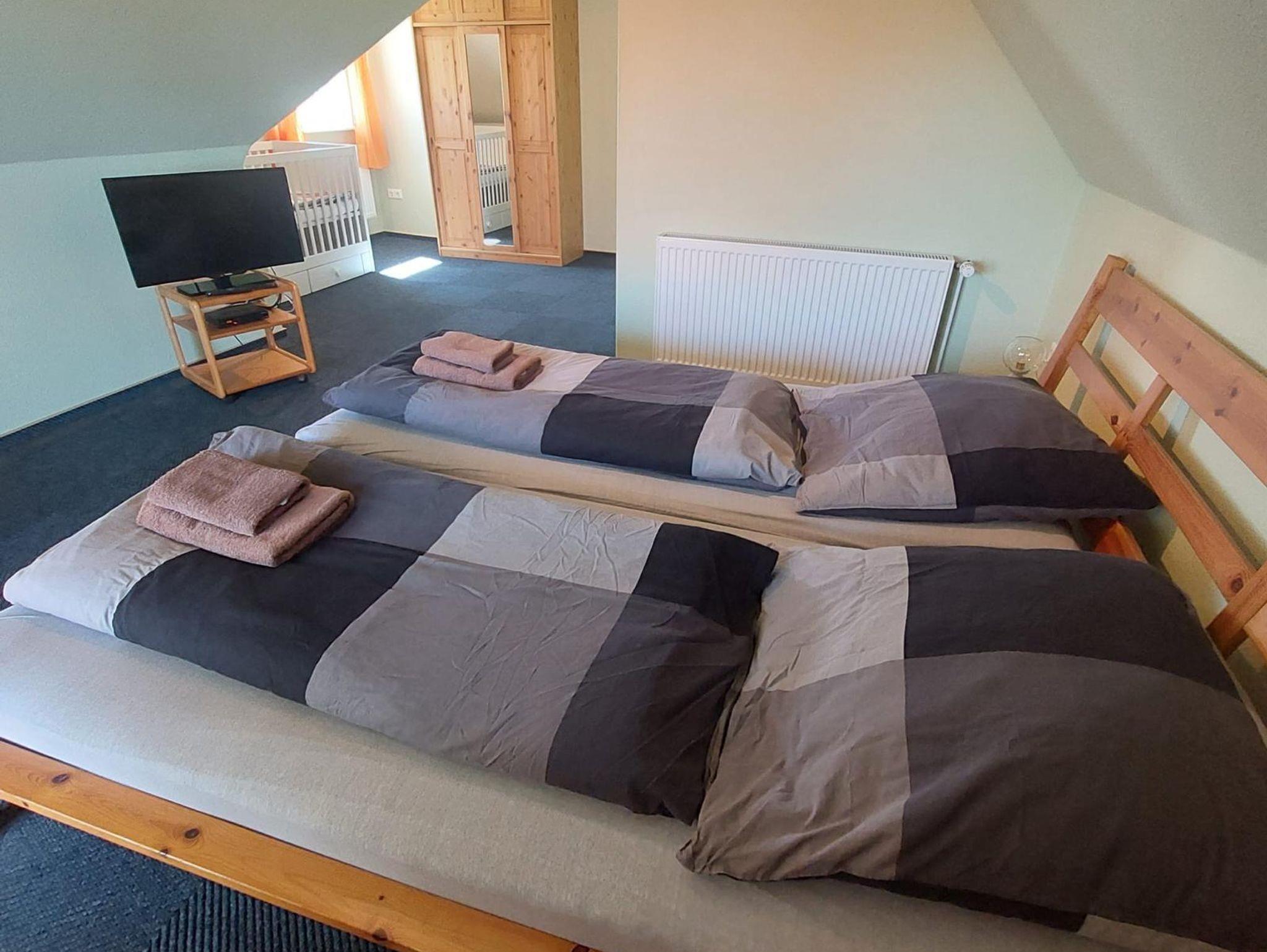 Die Ferienwohnung Vorne (ca. 80 m²) erstreckt sich über das Erd- und Obergeschoß unseres Ferienhauses. Vom gemütlichen Wohn-/Essbereich mit integrierter Küchenzeile gelangen Sie auf die Terrasse mit Gartenmöbeln. Die Schlafzimmer teilen sich in zwei mit jeweils einem Doppel- und das Weitere mit einem Einzelbett auf.