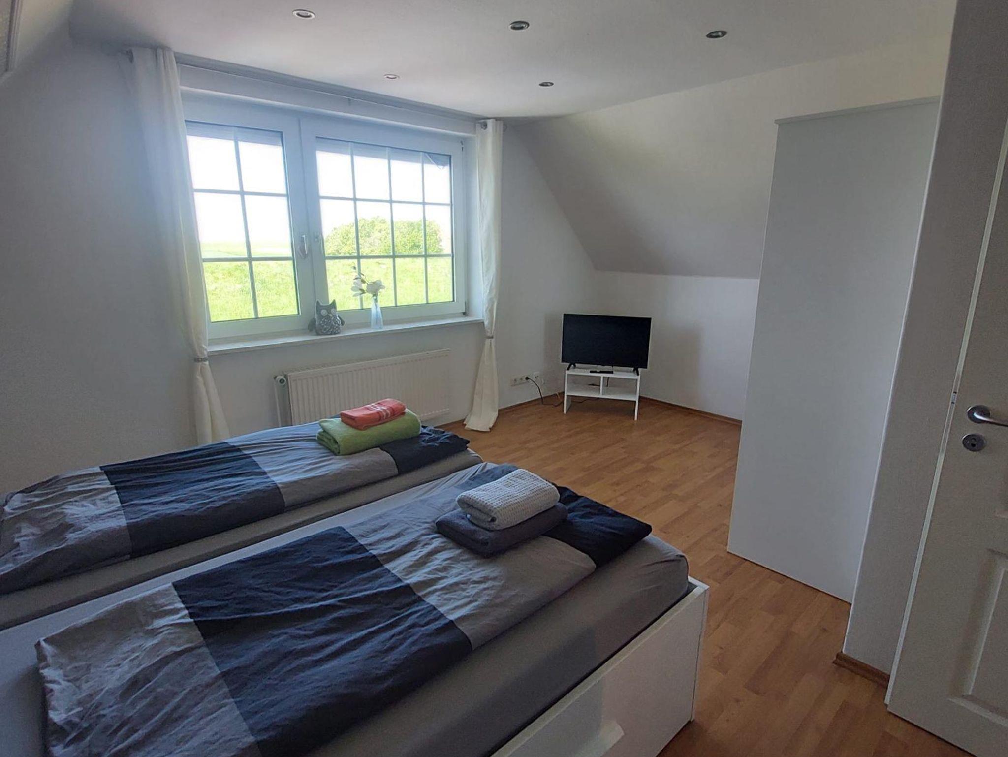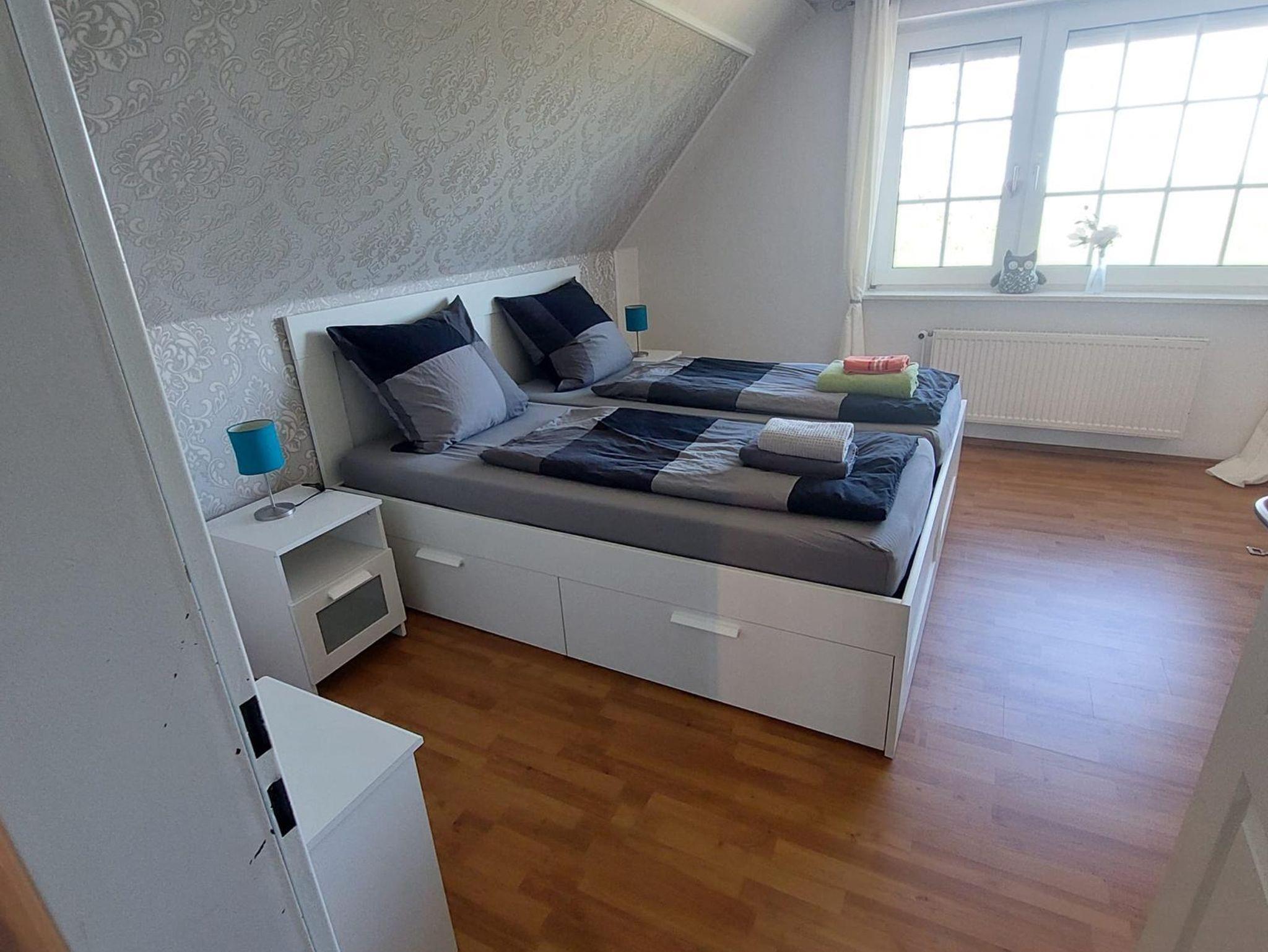 Unsere Ferienwohnung Kleeblatt hat eine Wohnfläche von ca. 65 m². Im Erdgeschoss befinden sich eine komplett eingerichtete Küche mit Backofen, Cerankochfeld, Kühlschrank mit Gefrierfach, Spülmaschine und diversen elektrischen Geräten wie Kaffeemaschine, Wasserkocher, Toaster etc. Des Weiteren werden Sie hier ein Bad mit Dusche/WC vorfinden. Im Obergeschoss erwarten Sie ein gemütlich eingerichteter Wohnbereich mit Flachbildschirm, 2 Schlafzimmer (Doppel- und Einbettzimmer) sowie ein weiteres Bad mit Badewanne/WC.