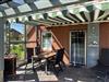 Vom Wohnbereich aus direkter Zugang zur überdachten Terrasse im eingezäunten Garten mit Gartenmöbeln und Sandkasten.