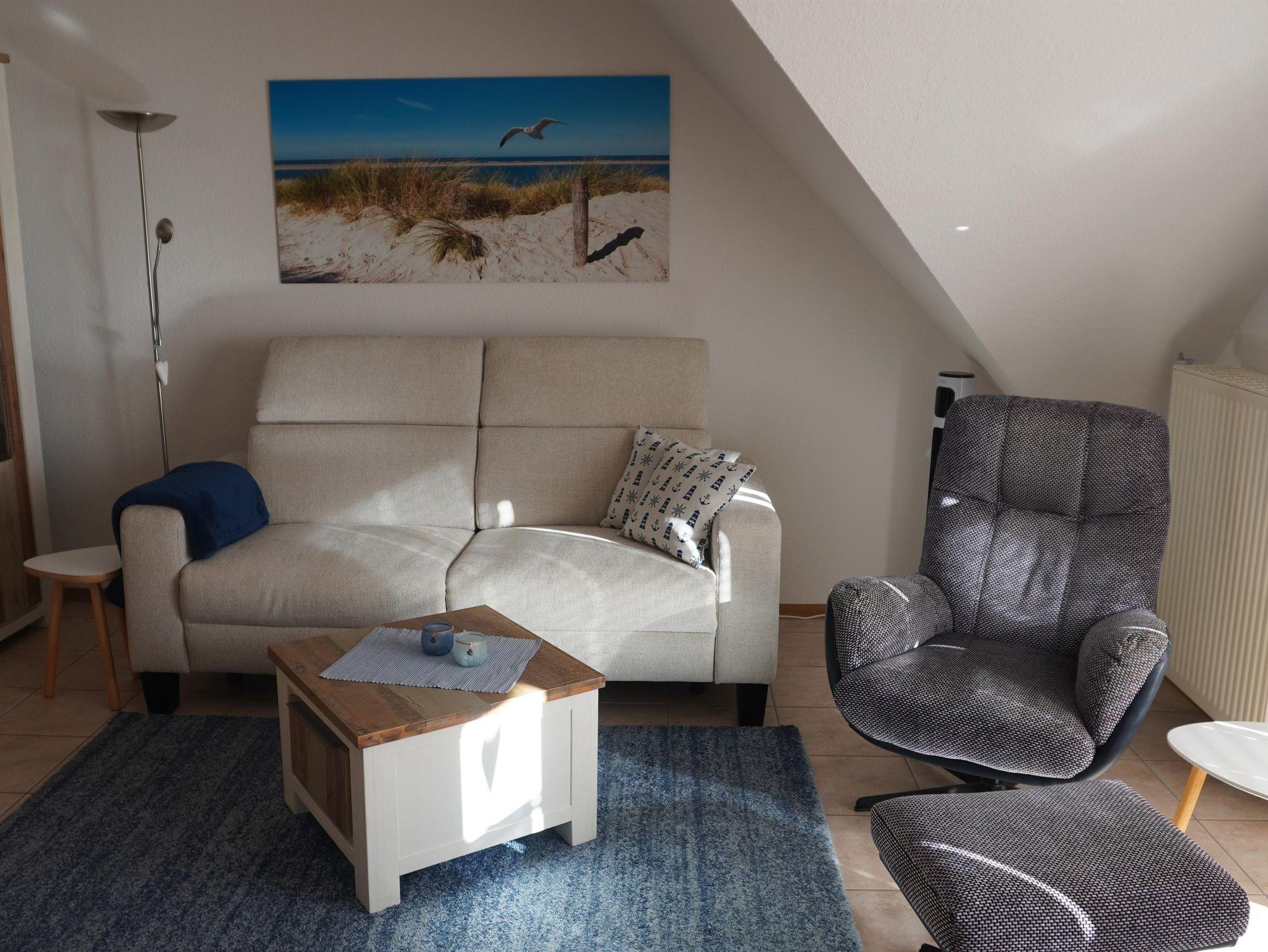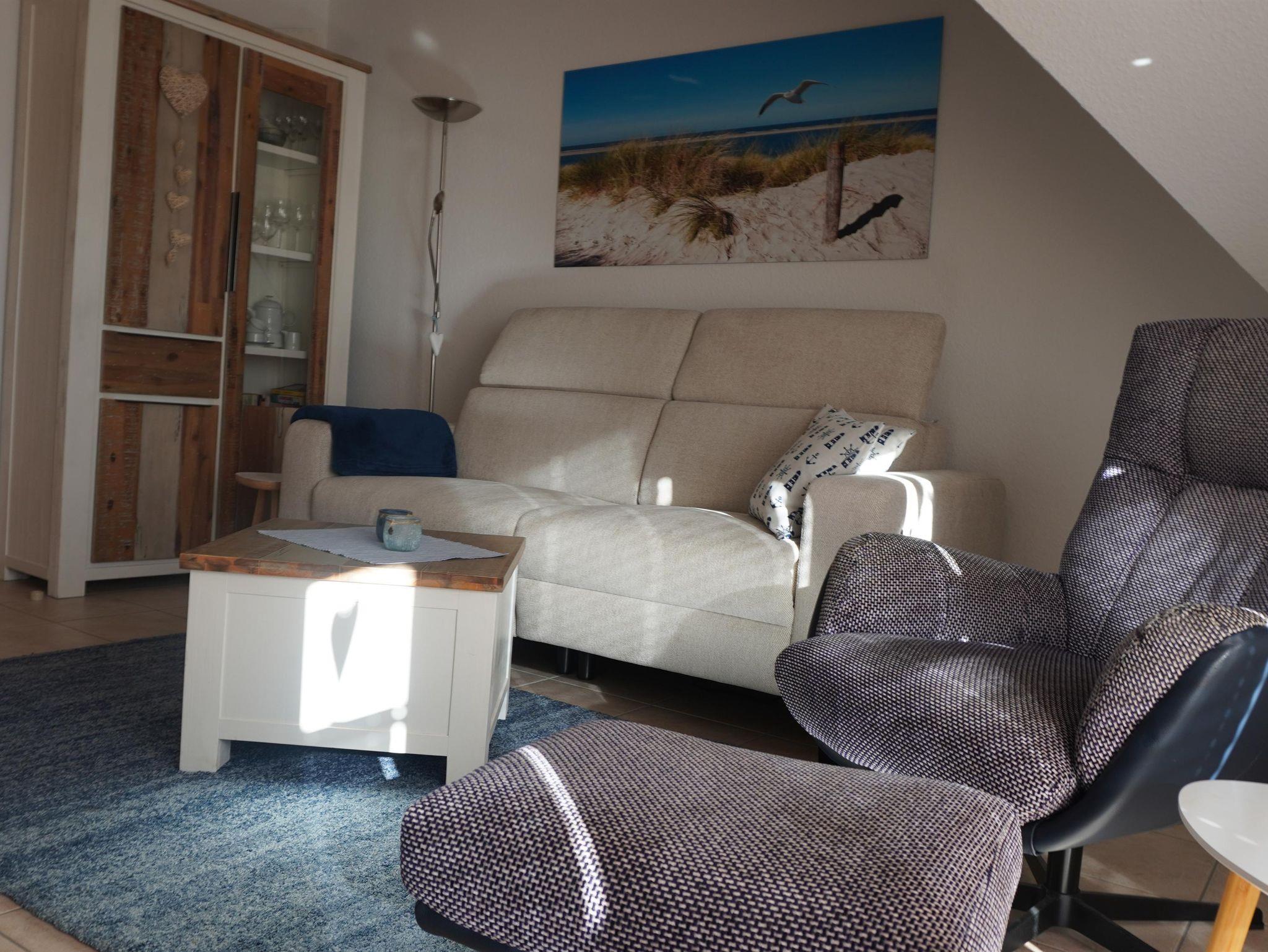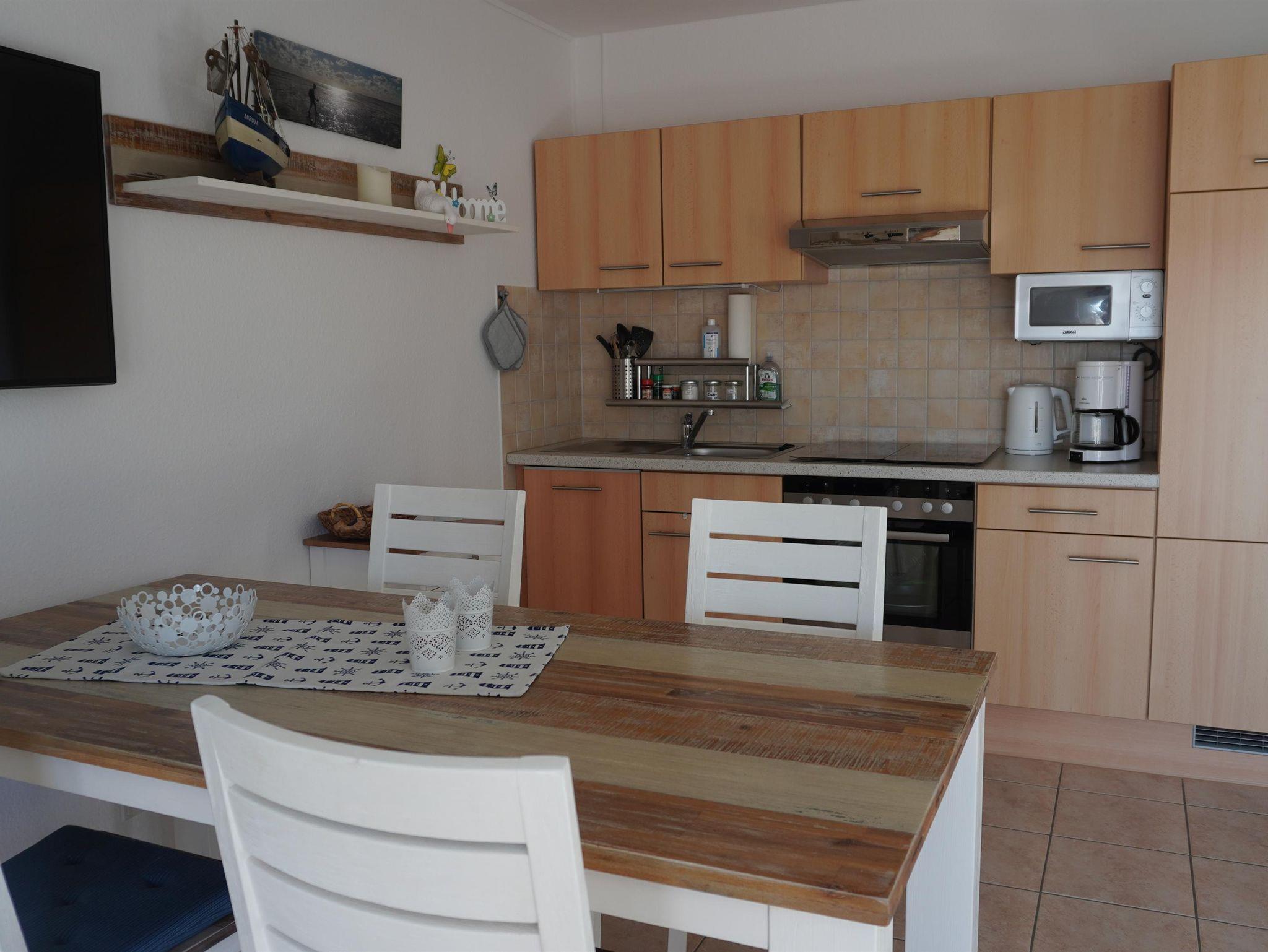 Auf einer Wohnfläche von ca. 45 m² erwarten Sie neben einer Essecke natürlich auch eine Küchenzeile mit einem 4- Plattenherd und Backofen, ein Kühlschrank mit Gefrierfach, eine Geschirrspülmaschine und diverse elektrische Geräte. Im Wohnbereich werden Sie ein Schlafsofa und einen Sessel, einen TV- Sat Fernseher, einen DVD Player, Blu-ray-Player, eine Stereoanlage sowie einige Spiele für Groß und Klein vorfinden. Die Küchenzeile sowie der Wohnbereich sind mit Fliesen ausgelegt. Das Badezimmer ist mit Dusche, WC, einem Waschbecken, einem Spiegel und Föhn gut ausgestattet. Die Ferienwohnung besitzt ein Schlafzimmer mit einem Doppelbett mit einem Maß von 1,80 x 2,00 Meter. Die Betten sind mit verstellbarem Lattenrost. Außerdem verfügt das Zimmer über einen Kleiderschrank sowie ein Radio. Im Raum selbst ist Teppichboden ausgelegt. Für die Verdunkelung der Räume sorgt ein Rollo mit integriertem Fliegengitter.