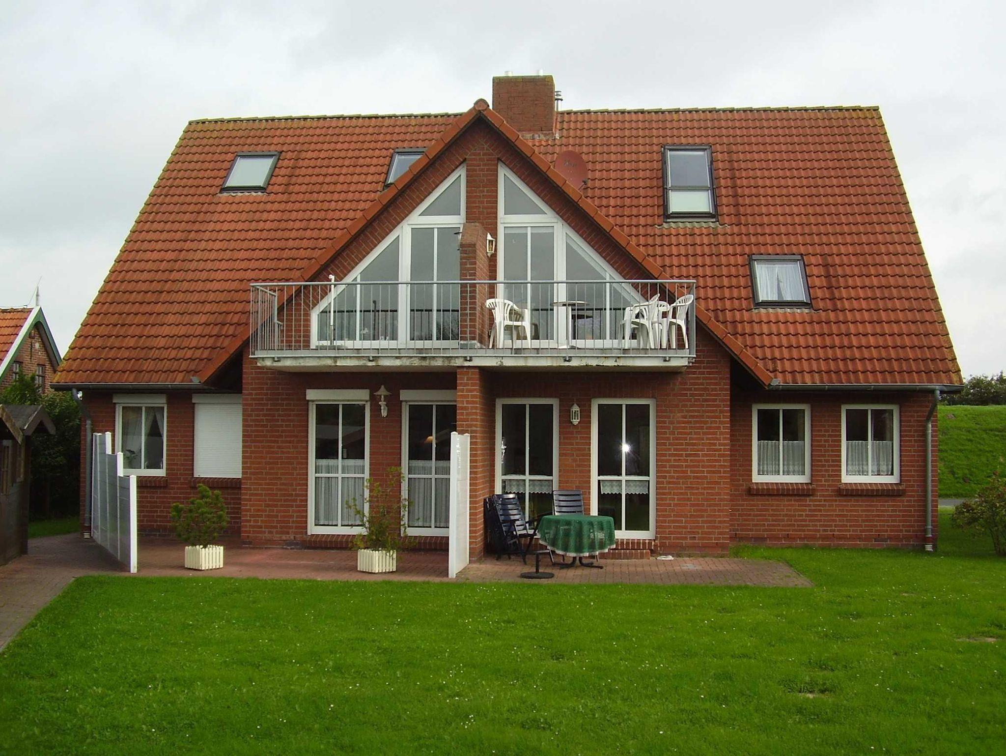 Moderne Ferienwohnung mit Kaminofen und Südbalkon direkt am Deich im Küstenbadeort Neßmersiel an der ostfriesischen Nordseeküste mit Blick über dem Deich bis zu den Inseln.