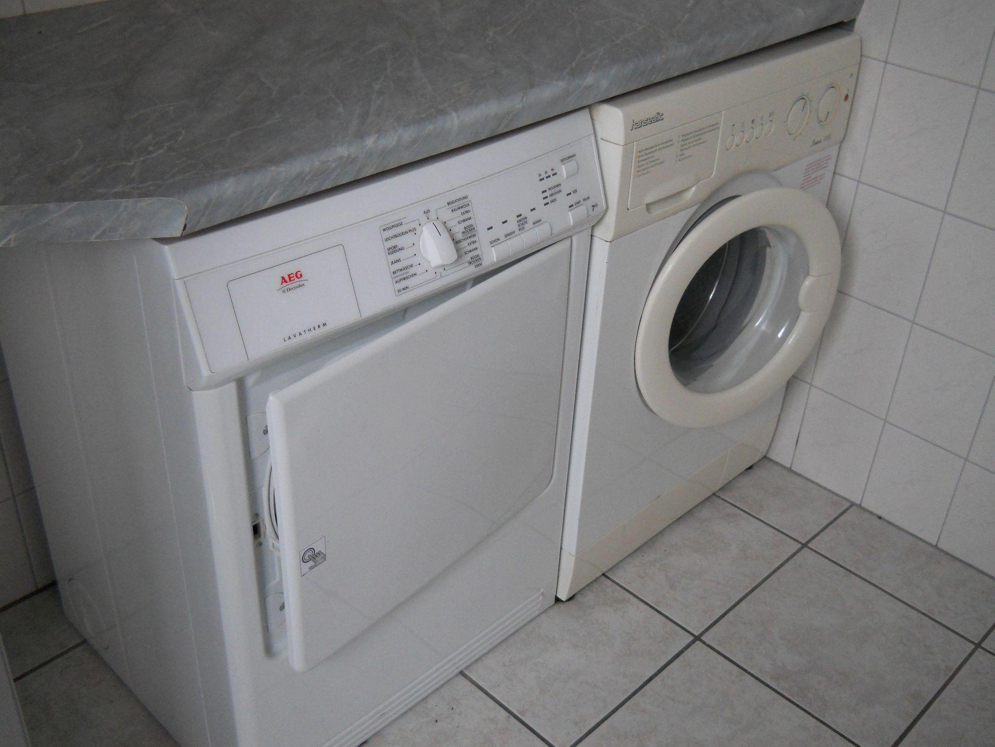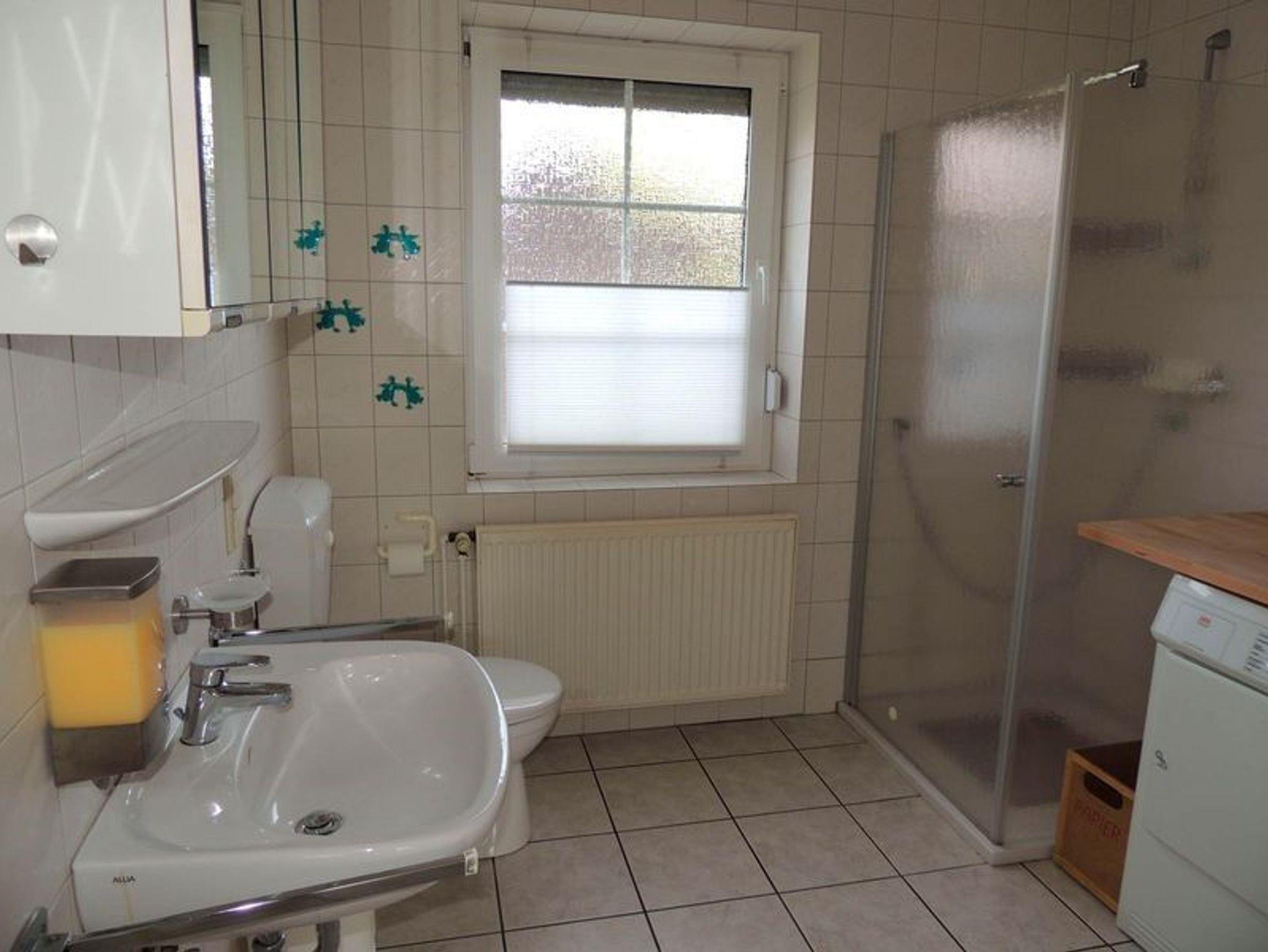 Tageslicht Badezimmer mit Dusche mit niedrigem Einstieg, WC, Waschmaschine und Trockner.
