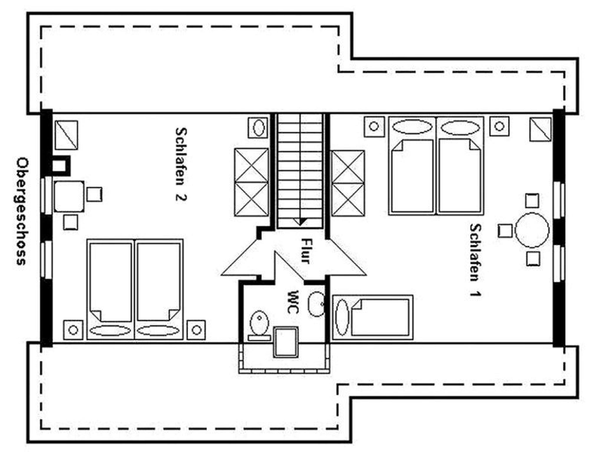 Obergeschoss: 1 Schlafzimmer mit Doppelbett. 1 Schlaf-/Kinderzimmer mit 2 Einzelbetten und einem festen Kleinkinderbett mit Gitter. Zusätzliches Gäste-WC.