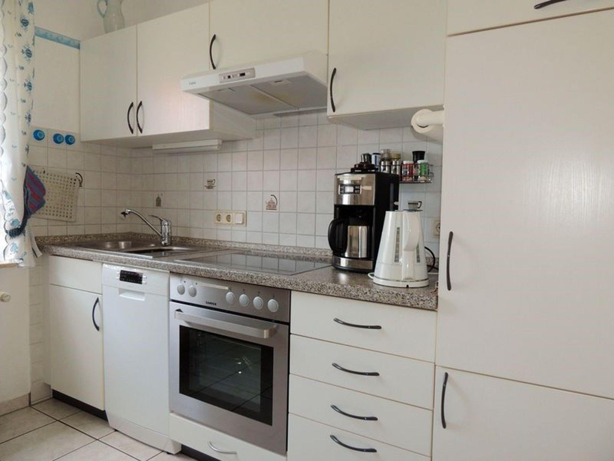 Separate Küche mit gut ausgestatteter hochwertiger Einbauküche mit 4-Plattenherd mit Ceranfeld und Backofen, Kühlschrank mit Gefrierfach, Spülmaschine, Microwelle, etc., zusätzlicher Essbereich mit Eckbank und Stühlen.