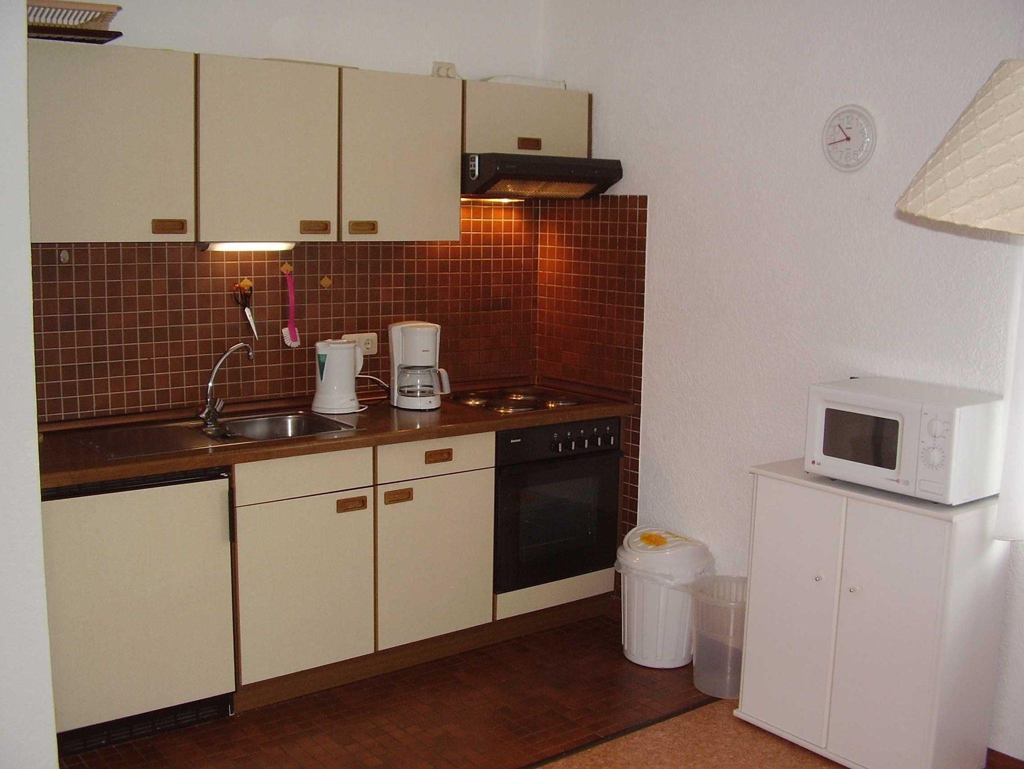 Offener Wohn- und Essbereich mit gemütlicher Ostfriesensitzecke und Flachbild-TV, Esstisch mit Bestuhlung und EBK mit Kühlschrank mit Gefrierfach, Spülmaschine, Elektroherd mit Backofen und allen erforderlichen Elektrogeräten. Südbalkon. Internet über WLAN kostenlos.