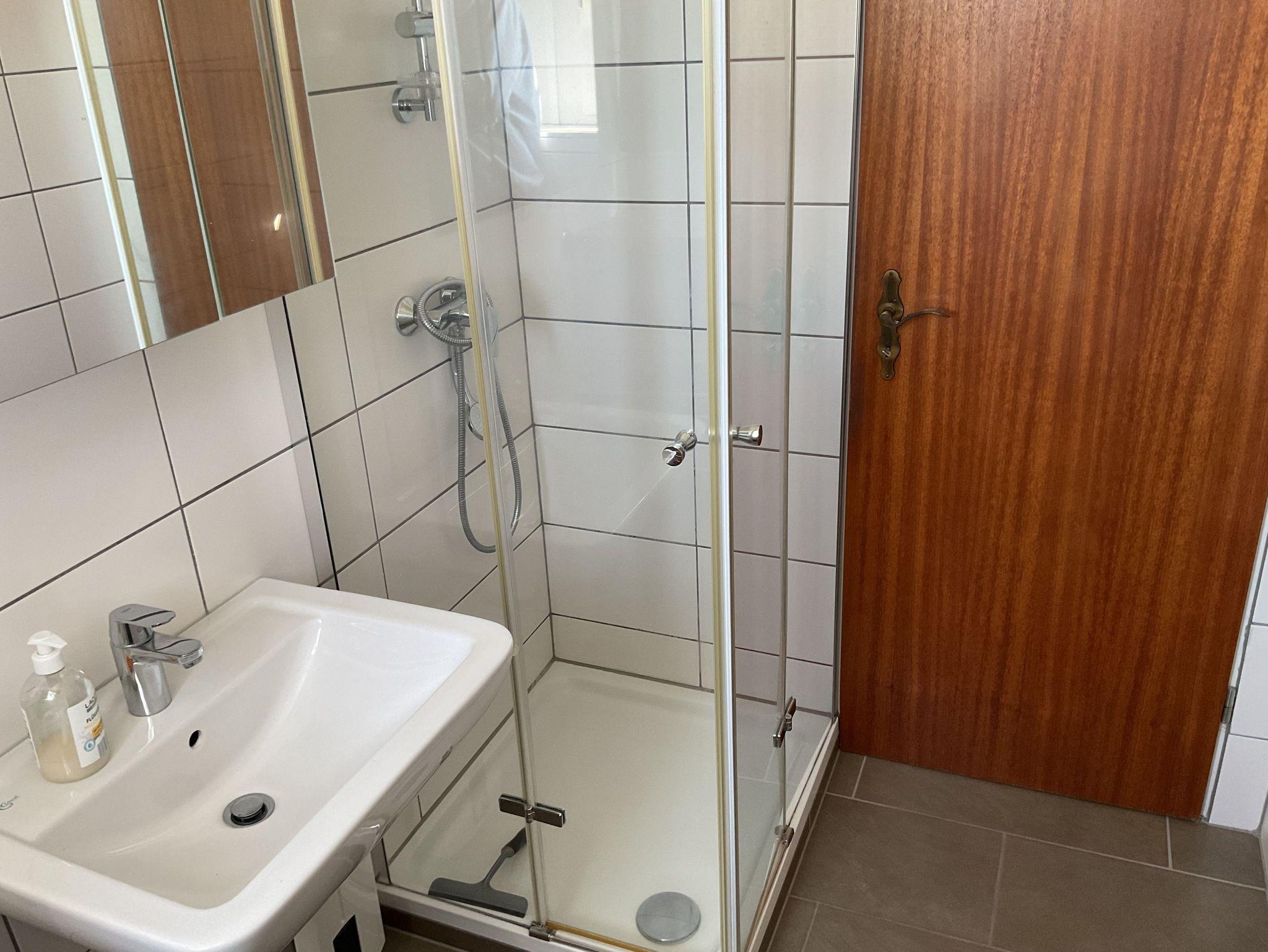 Tageslicht-Badezimmer mit Dusche und WC.