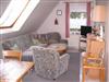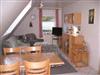 Oberhalb der Garage befindet sich die Ferienwohnung 3. Hier steht Ihnen auf einer Wohnfläche von c. 30 m² ein gemütlich eingerichteter Wohn-Essraum mit Sat-TV, eine separate komplett eingerichtete Küchenzeile mit Backofen und Cerankochfeld, eine Mikrowelle sowie eine Kühlgefrierkombination zur Verfügung. Ein Schlafzimmer mit Doppelbett sowie eine weitere Schlafgelegenheit mit zwei einzelnen Betten im ausgebauten Dachstuhl, der nur durch eine Raumspartreppe zu erreichen ist. Aus diesem Grund wird die Wohnung erst für Kinder ab 5 Jahren vermietet. Ein Bad mit Dusche/WC gehört ebenfalls zur Ausstattung dazu