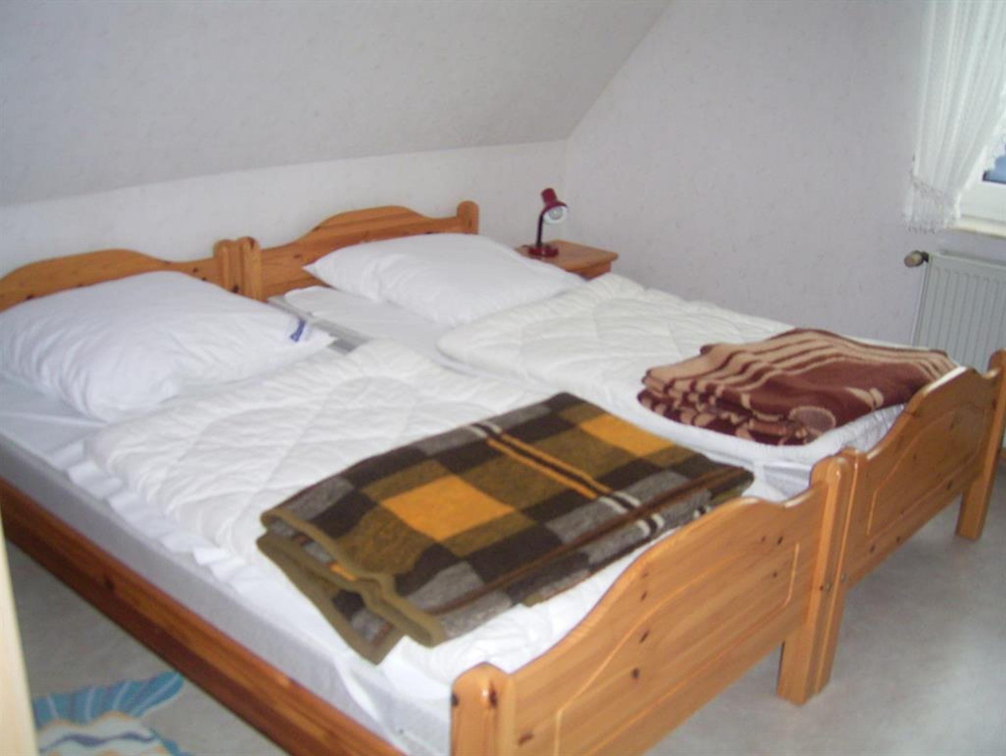 Zur Ferienwohnung im Obergeschoß gehört ein Wohn- Essraum mit F-TV, Radio/CD sowie eine integrierte Küchenzeile. Diese ist mit einem Toaster, Mikrowelle, Kaffeemaschine, Eierkocher, Wasserkocher ausgestattet. Zwei getrennte Schlafzimmer (Doppel- u. Zweibett) gehören zur Ausstattung dazu genauso wie ein Bad mit Dusche/WC. Für unsere kleinen Gäste steht ein Kinder Reisebett zur Verfügung.