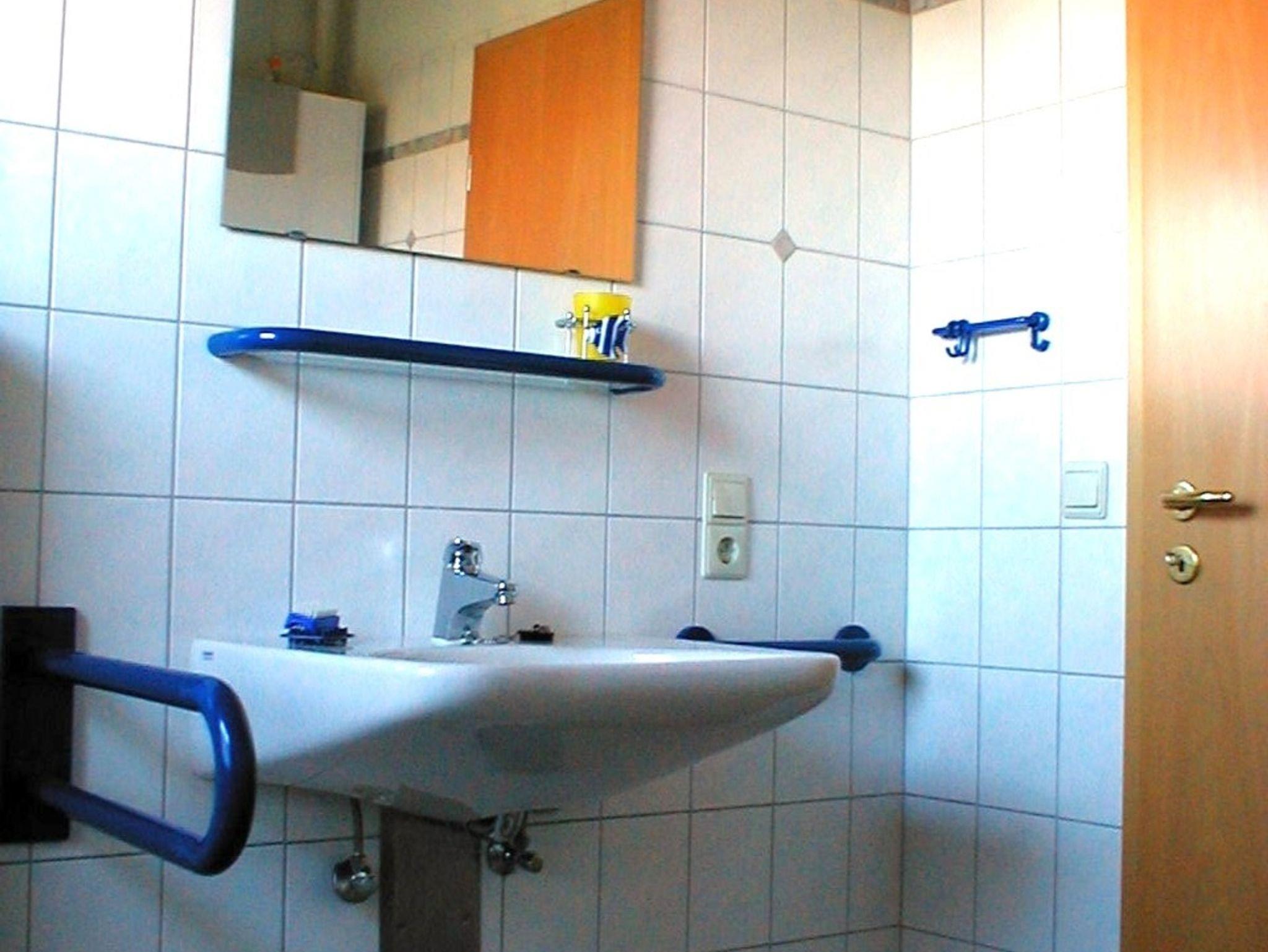 Tageslicht-Badezimmer mit ebenerdiger behindertengerechter Dusche und WC; Waschmaschine.
