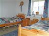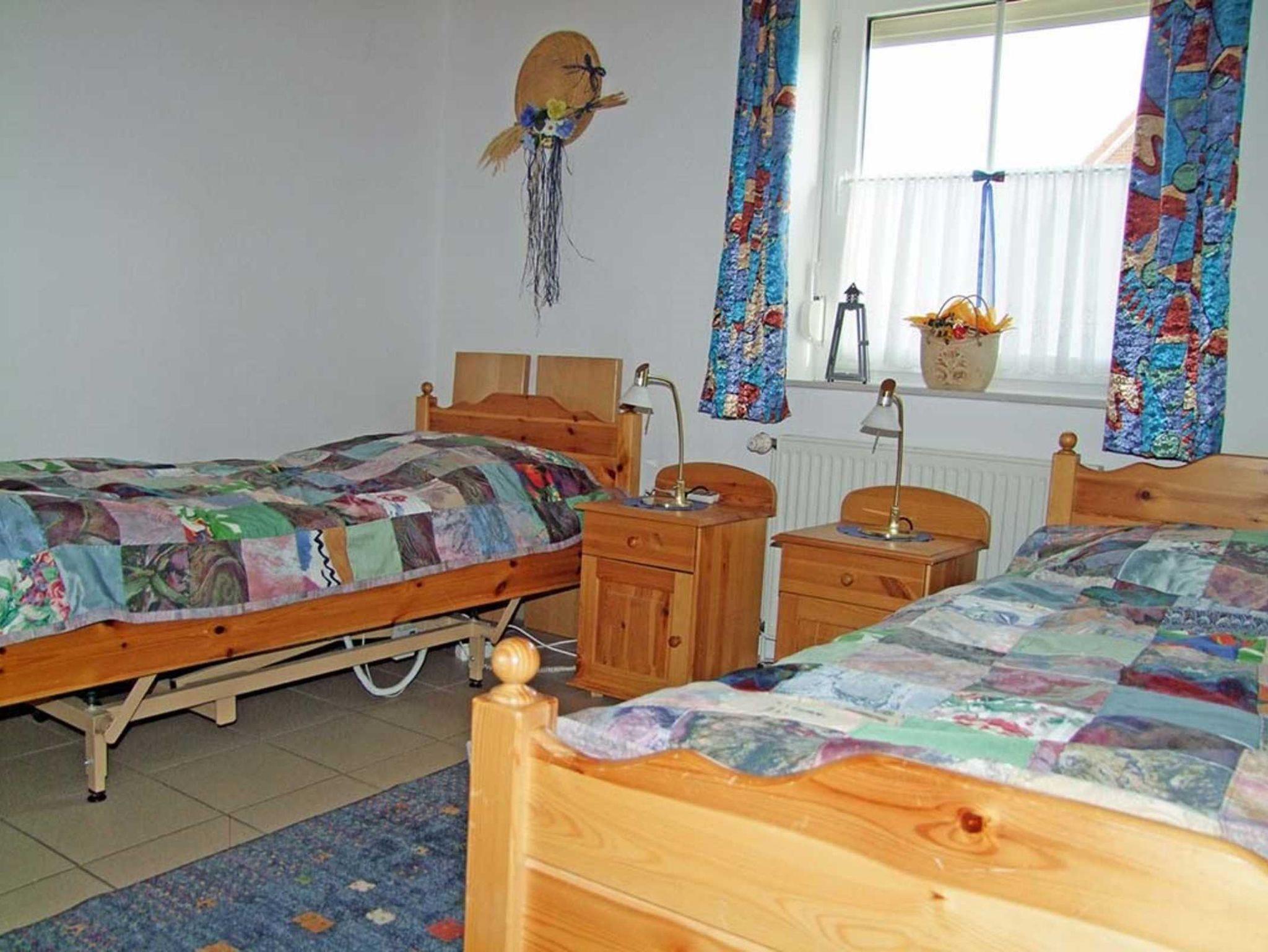 Schlafzimmer mit 2 Einzelbetten, einmal mit Pflegebetteinsatz.