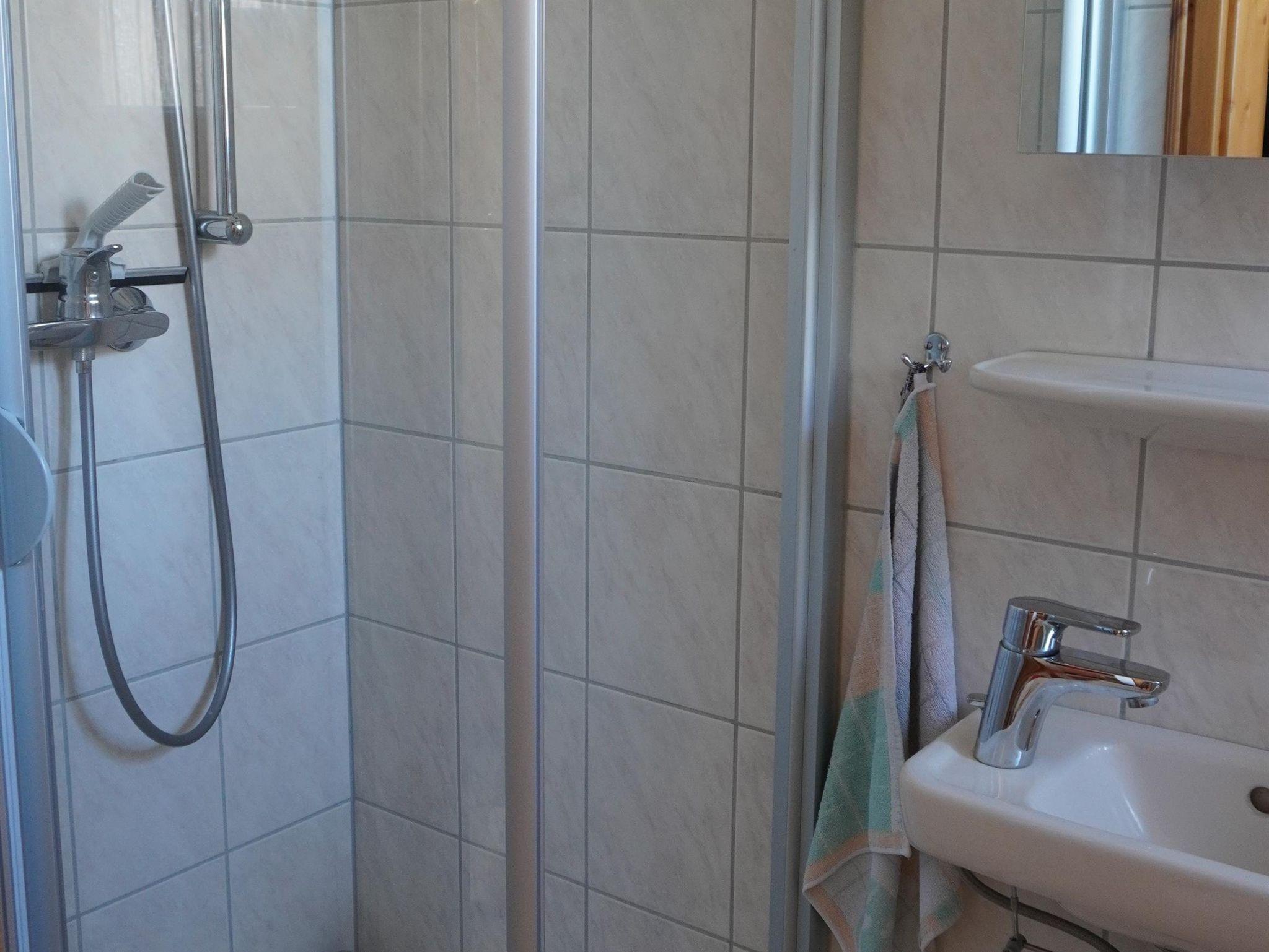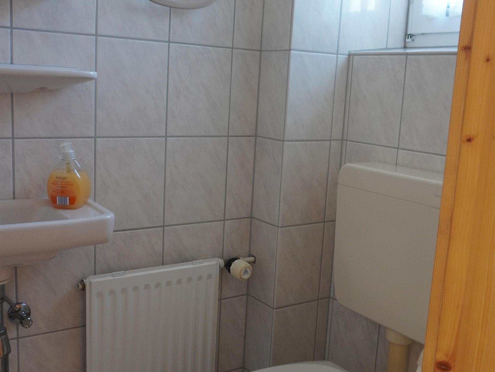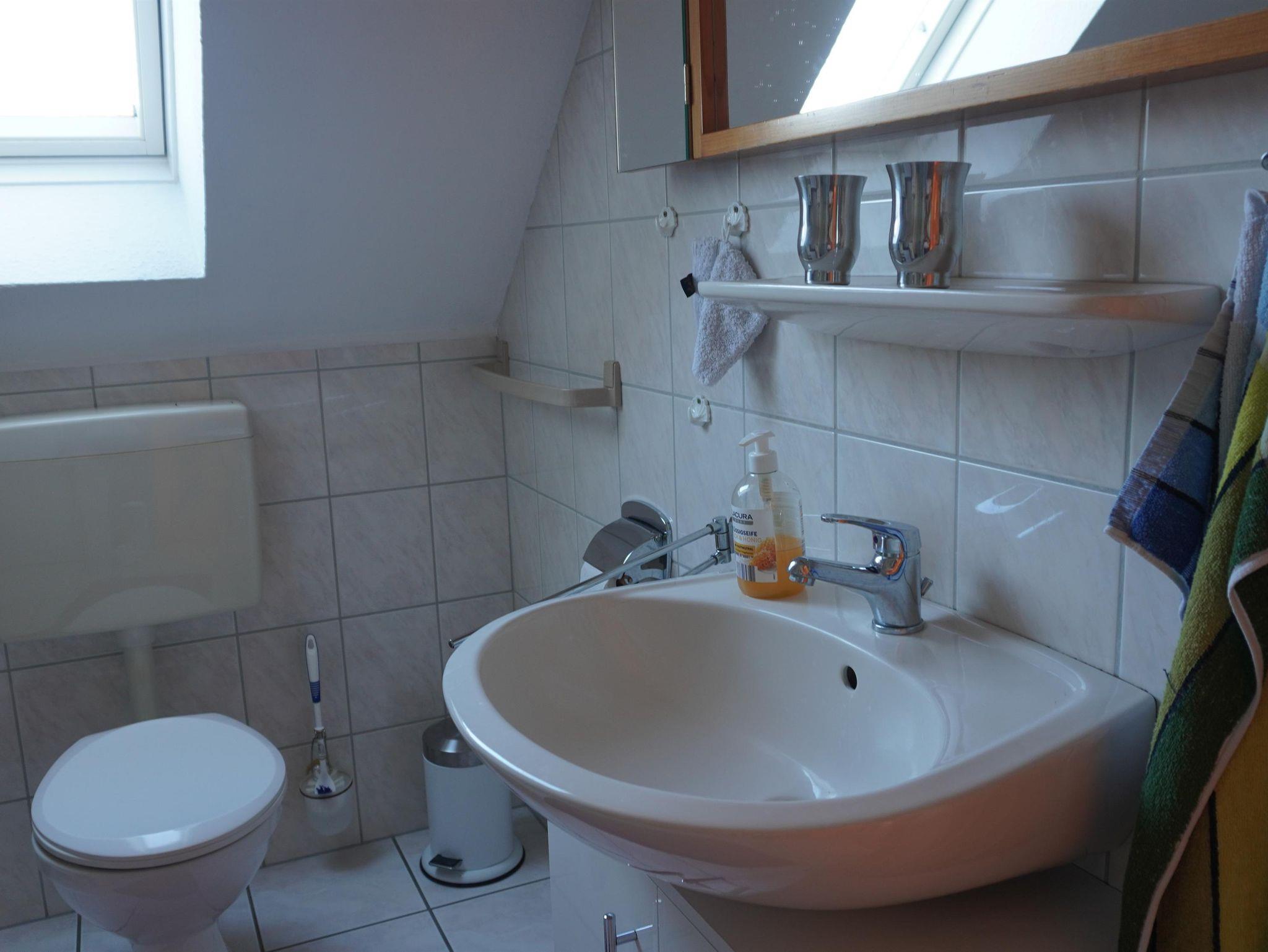 Ein weiteres, großzügiges, Bad mit bodengleicher Dusche, WC und Waschmaschine sowie Fön, Klapp- und Kosmetikspiegel ist im Obergeschoss vorhanden. Für die Kleinen stehen eine Wickelkommode mit -auflage, WC-Sitz, Tritthocker, Kinderhochstuhl, Wärmeteller, Trinkbecher sowie reichlich Spielzeug bereit.