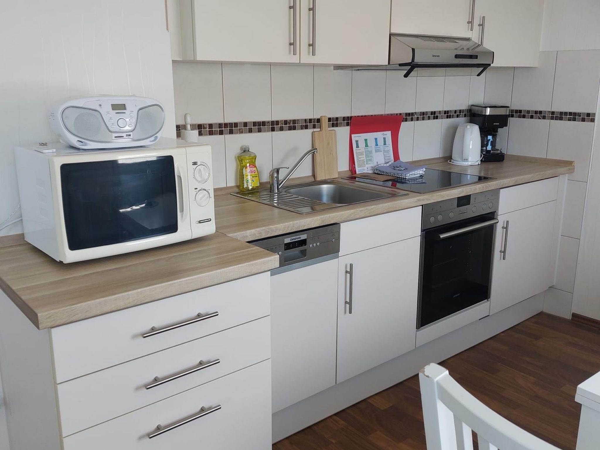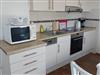Ferienwohnung West (ca. 55 m²) befindet sich im Erdgeschoss und ist zum Westen ausgerichtet. Im Wohnzimmer erwartet Sie ein Sat-TV sowie eine Stereoanlage. In der separaten Küche erwartet Sie eine komplett eingerichtete Küchenzeile mit einem Vierplattenherd und Backofen, Kühlschrank mit Gefrierkombination, Mikrowelle und div. elektrischen Geräten.