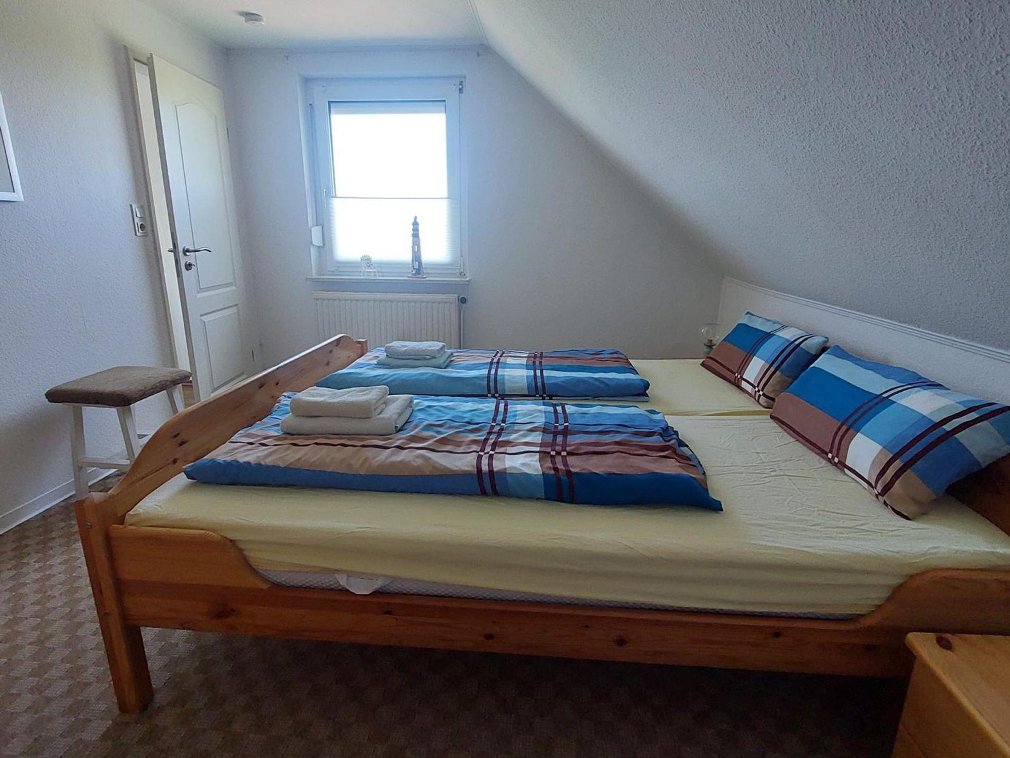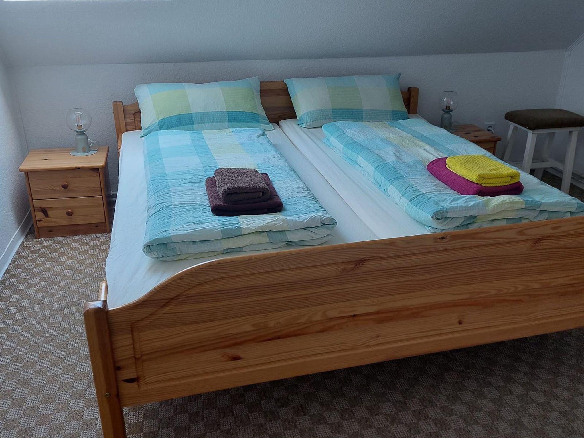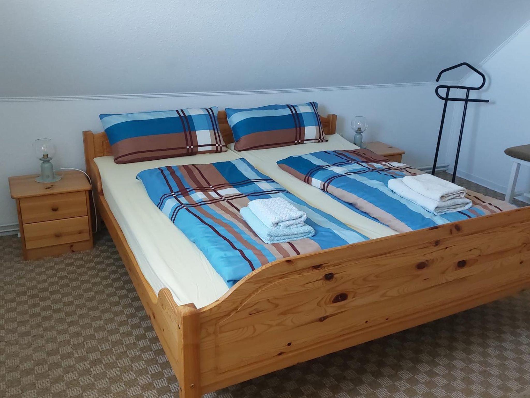 Auf einer Wohnfläche von ca. 55 m² werden Sie in unserer Ferienwohnung im Obergeschoss einen kombinierten Wohn-/Essbereich mit Sat-TV, eine integrierte Küchenzeile mit Vierplattenherd und Backofen, Kühlschrank mit Gefrierkombination sowie eine Mikrowelle und div. elektrischen Geräte vorfinden. Zwei Schlafräume sind mit jeweils einem Doppelbett ausgestattet und Ihre Betten sind bereits bei Anreise bezogen. Das Bad verfügt über Dusche/WC.