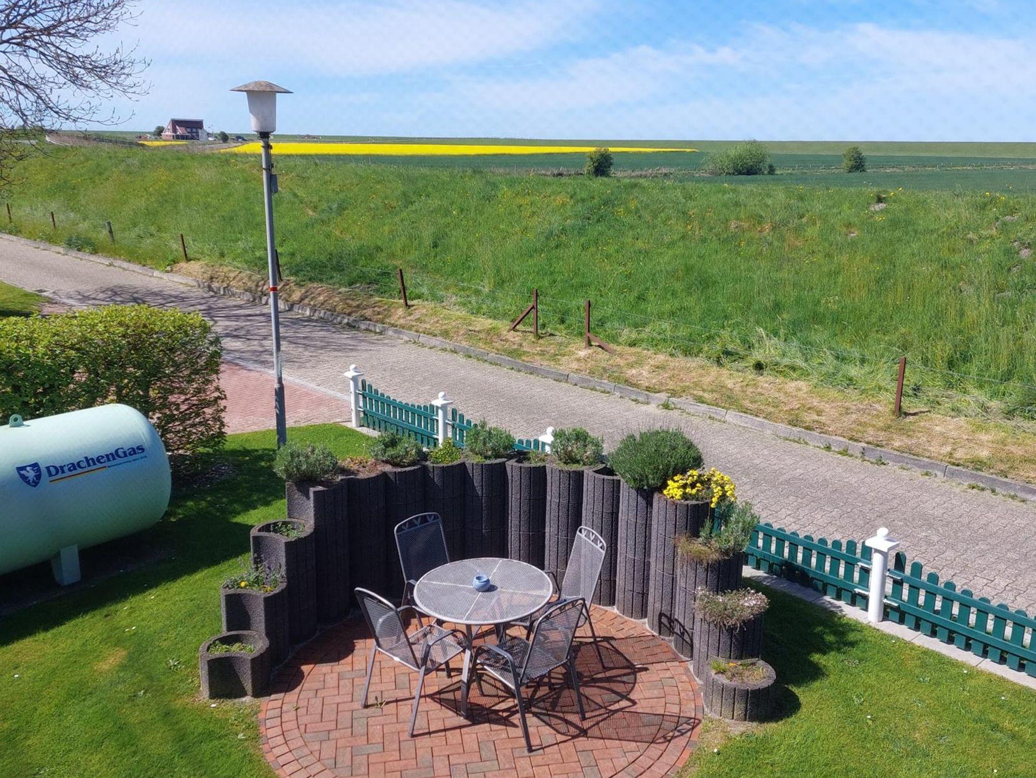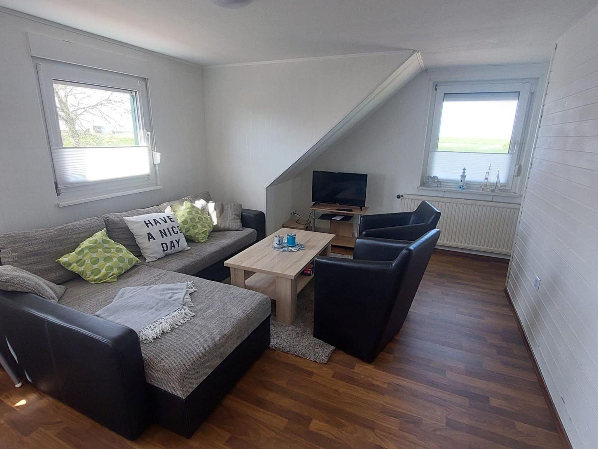 Unsere kleine Ferienwohnung im Erdgeschoss (ca. 45 m²) liegt direkt vorm Deich. Im Wohn-/Essbereich werden Sie eine ein Sat-TV und Stereoanlage sowie eine Küchenzeile mit div. elektr. Geräten wie Kaffeemaschine, Wasserkocher, Toaster u.s.w. vorfinden.