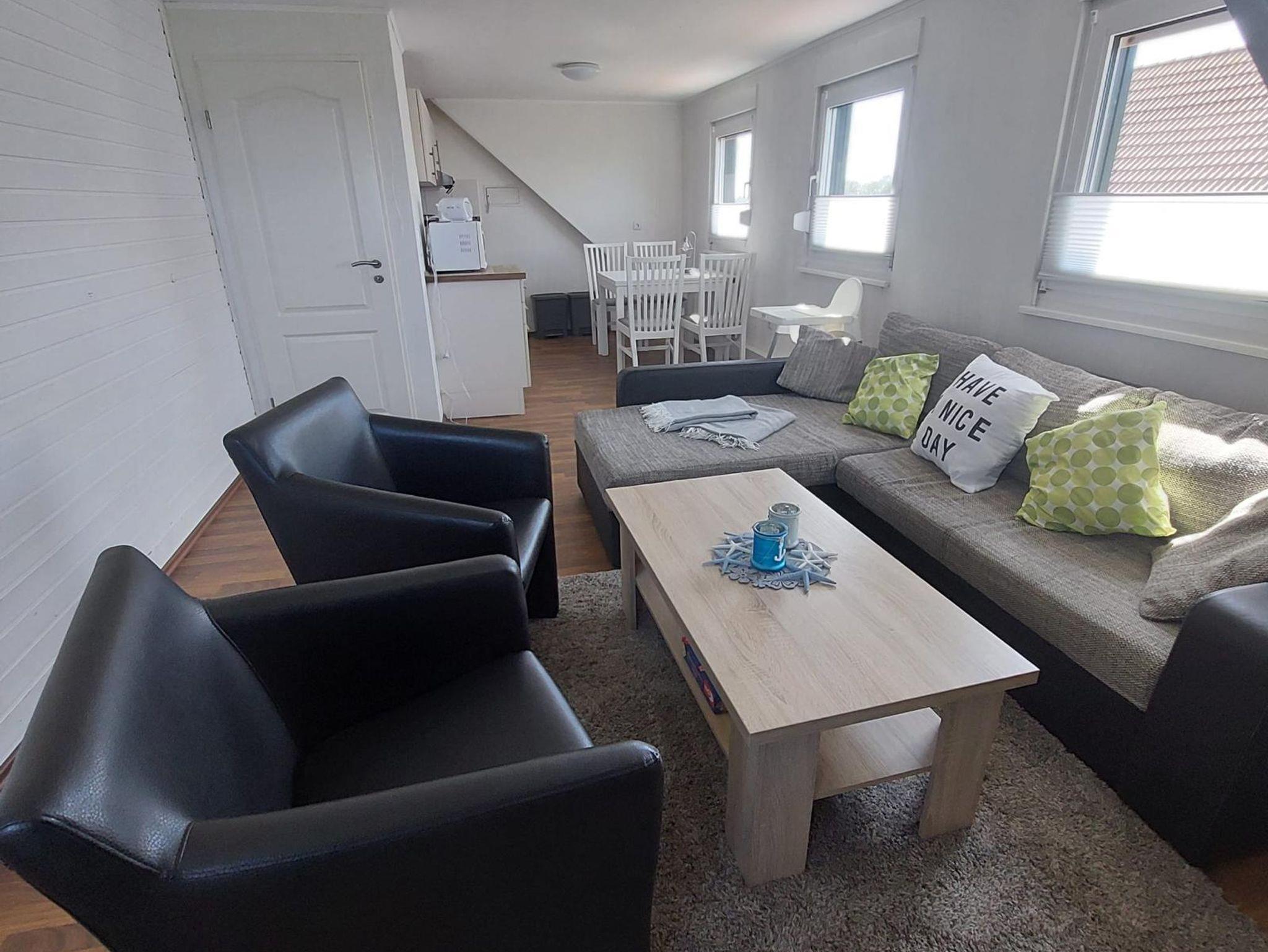 Die Ferienwohnung Vorne (ca. 80 m²) erstreckt sich über das Erd- und Obergeschoß unseres Ferienhauses. Vom gemütlichen Wohn-/Essbereich mit integrierter Küchenzeile gelangen Sie auf die Terrasse mit Gartenmöbeln. Die Schlafzimmer teilen sich in zwei mit jeweils einem Doppel- und das Weitere mit einem Einzelbett auf.