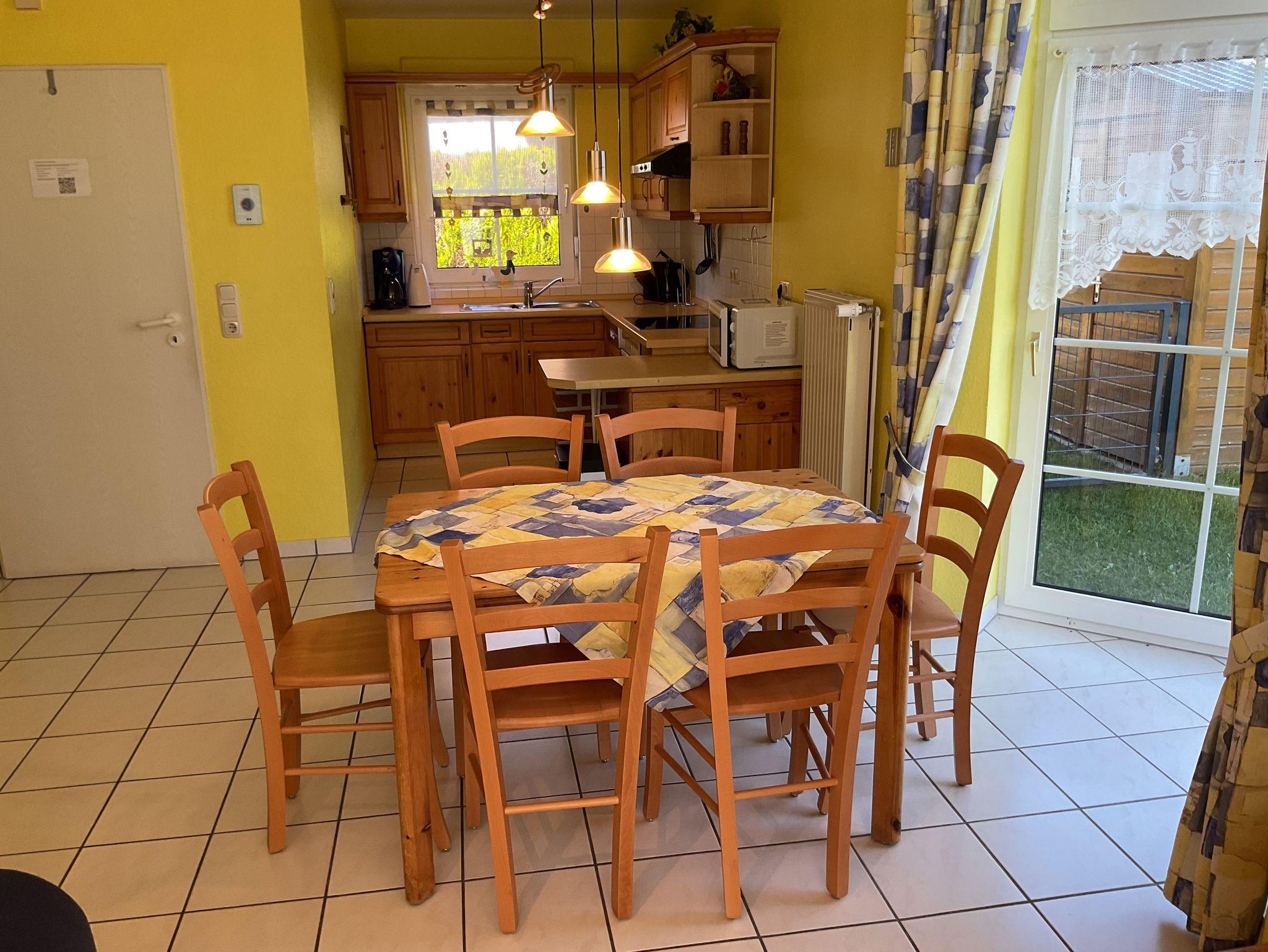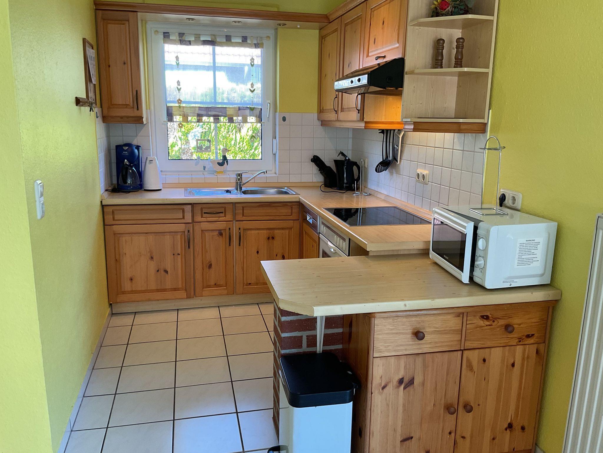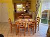 Esstisch mit Bestuhlung und offene Küche mit Einbauküche mit Vier-Platten-Herd mit Backofen, Spülmaschine, Kühlschrank mit Gefrierfach, Microwelle, etc.. und natürlich ausreichend Küchengeräte, Töpfe und Geschirr.