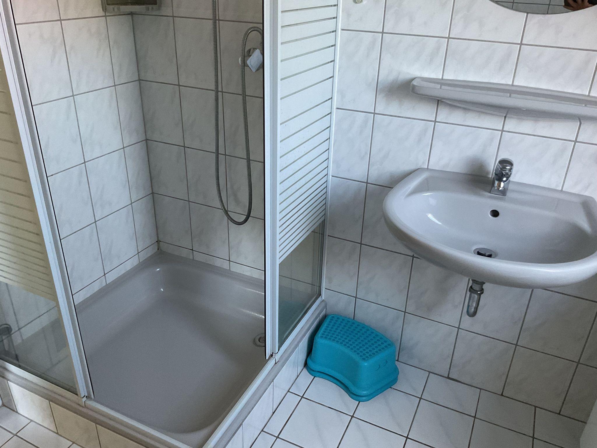Tageslicht-Bad mit Dusche, WC und Waschmaschine.