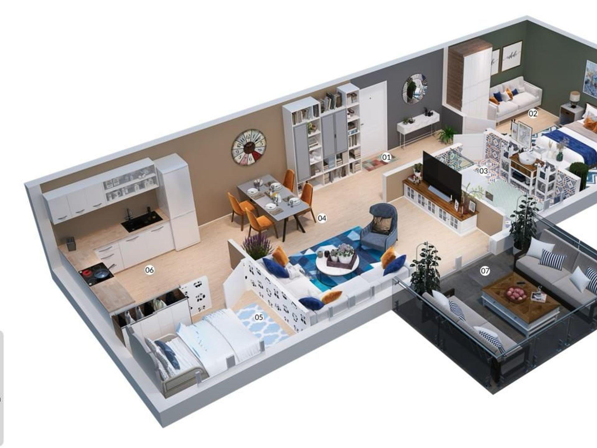 Es gibt insgesamt 2 Schlafzimmer. Im größeren Schlafzimmer befindet sich ein Doppelbett (Boxspring) und ein Schlafsofa (z. B. für 2 Kinder). Im kleineren Schlafzimmer befindet sich ein Etagenbett, welches unten ca. 130 cm breit und oben ca. 90 cm breit ist. Im Wohnzimmer gibt es ein zusätzliches Schlafsofa.