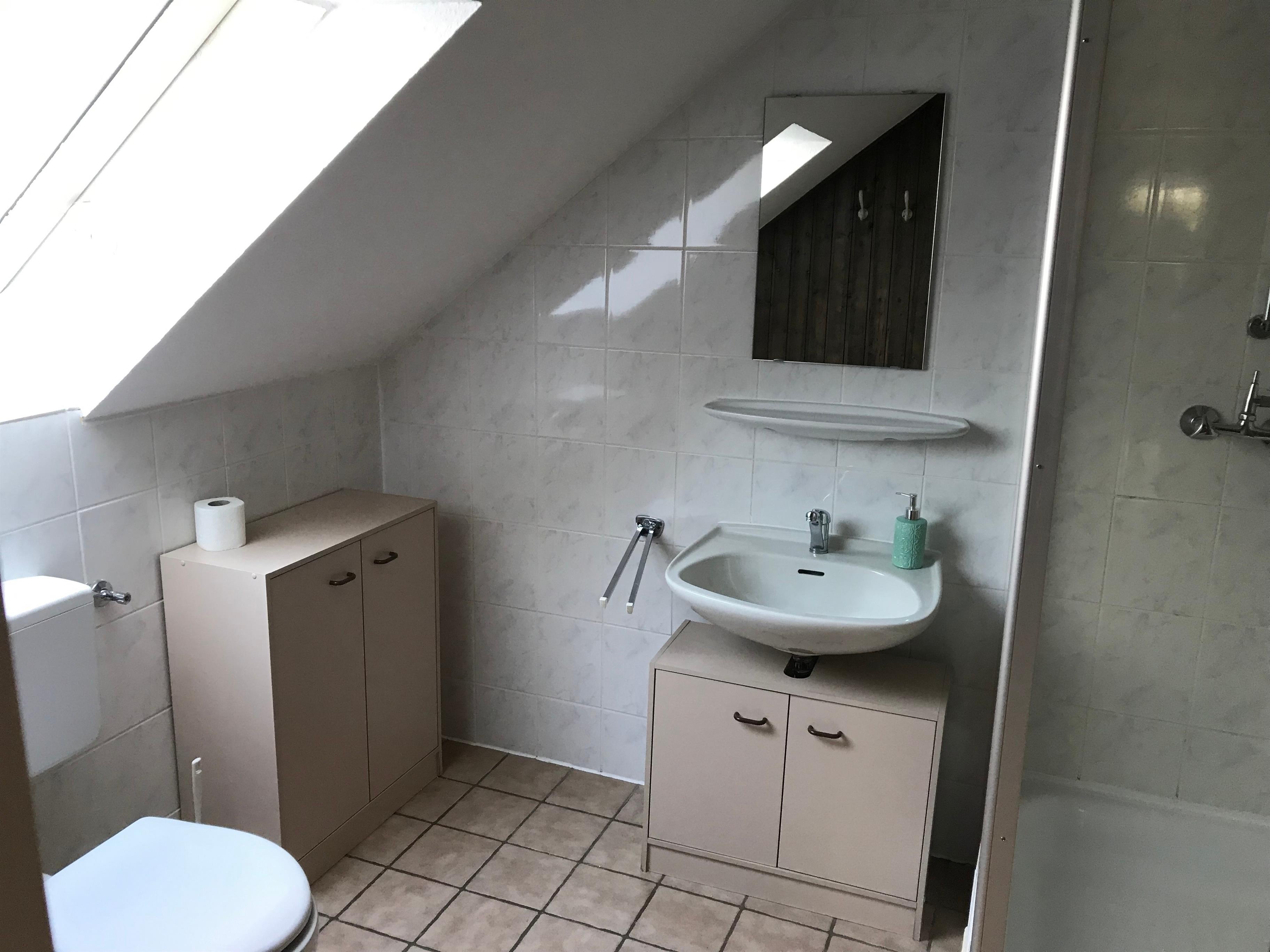 Das Badezimmer ist mit einer Dusche ausgestattet.