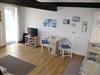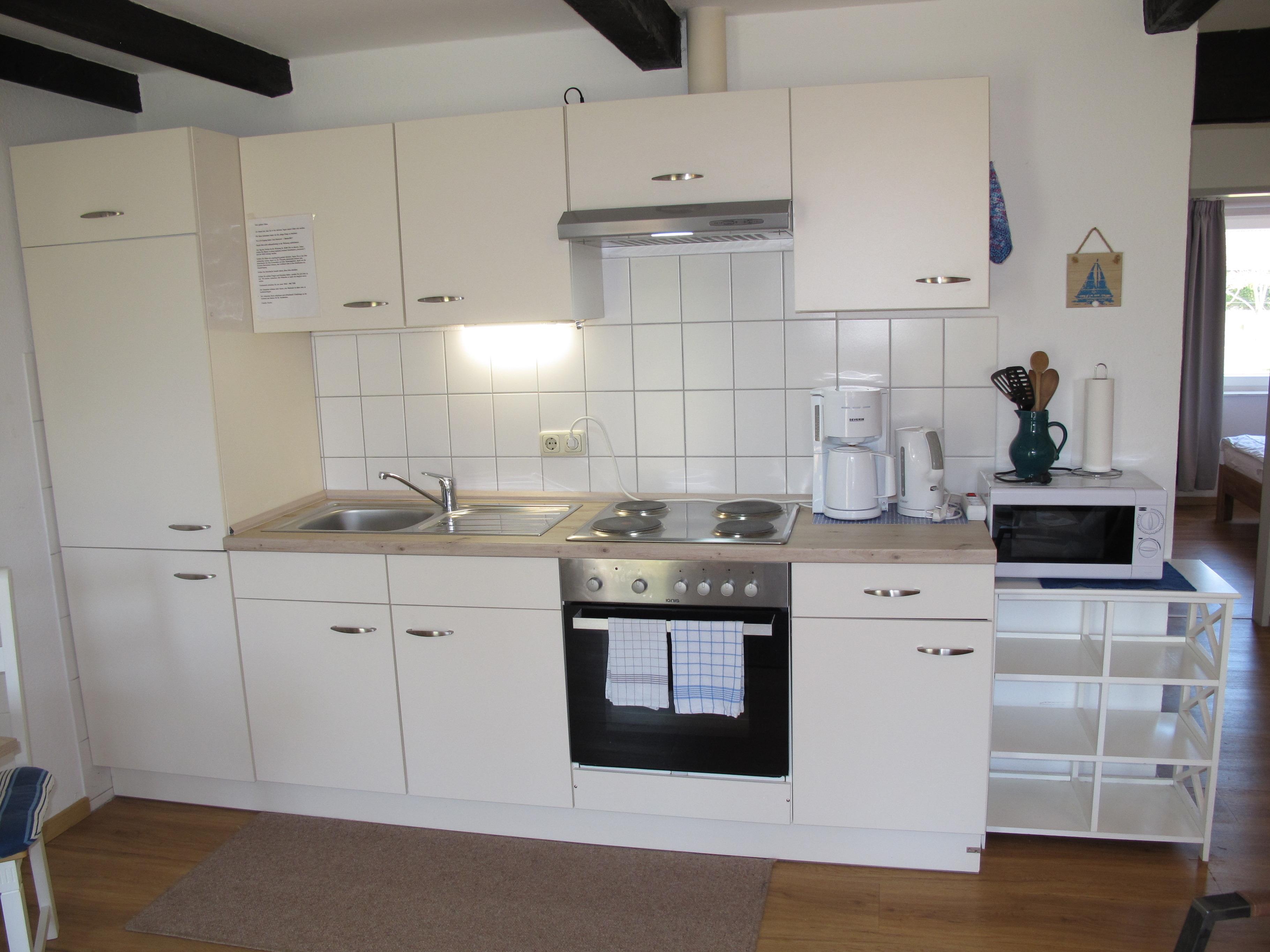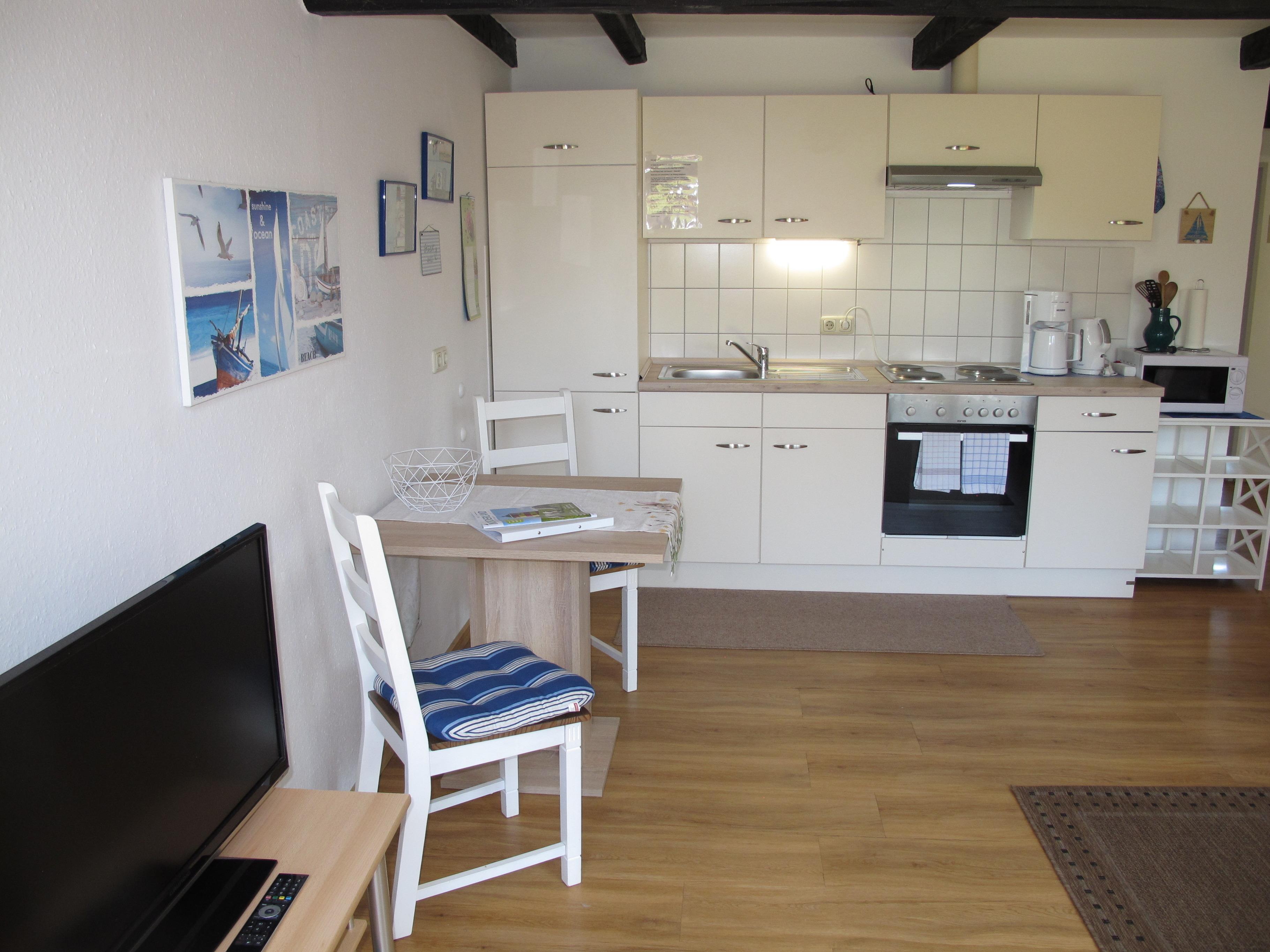Zugang über Terrasse und separaten Eingang in großen Wohnraum mit Leder-Sitzgruppe und Eßplatz. Offene Küche mit Einbauherd (4 Platten, Backofen), Mikrowelle, Kaffeemaschine, Wasserkocher, Toaster und Kühlschrank mit Gefrierfach. Doppelzimmer. Moderne Dusche/WC. NICHTRAUCHEROBJEKT !