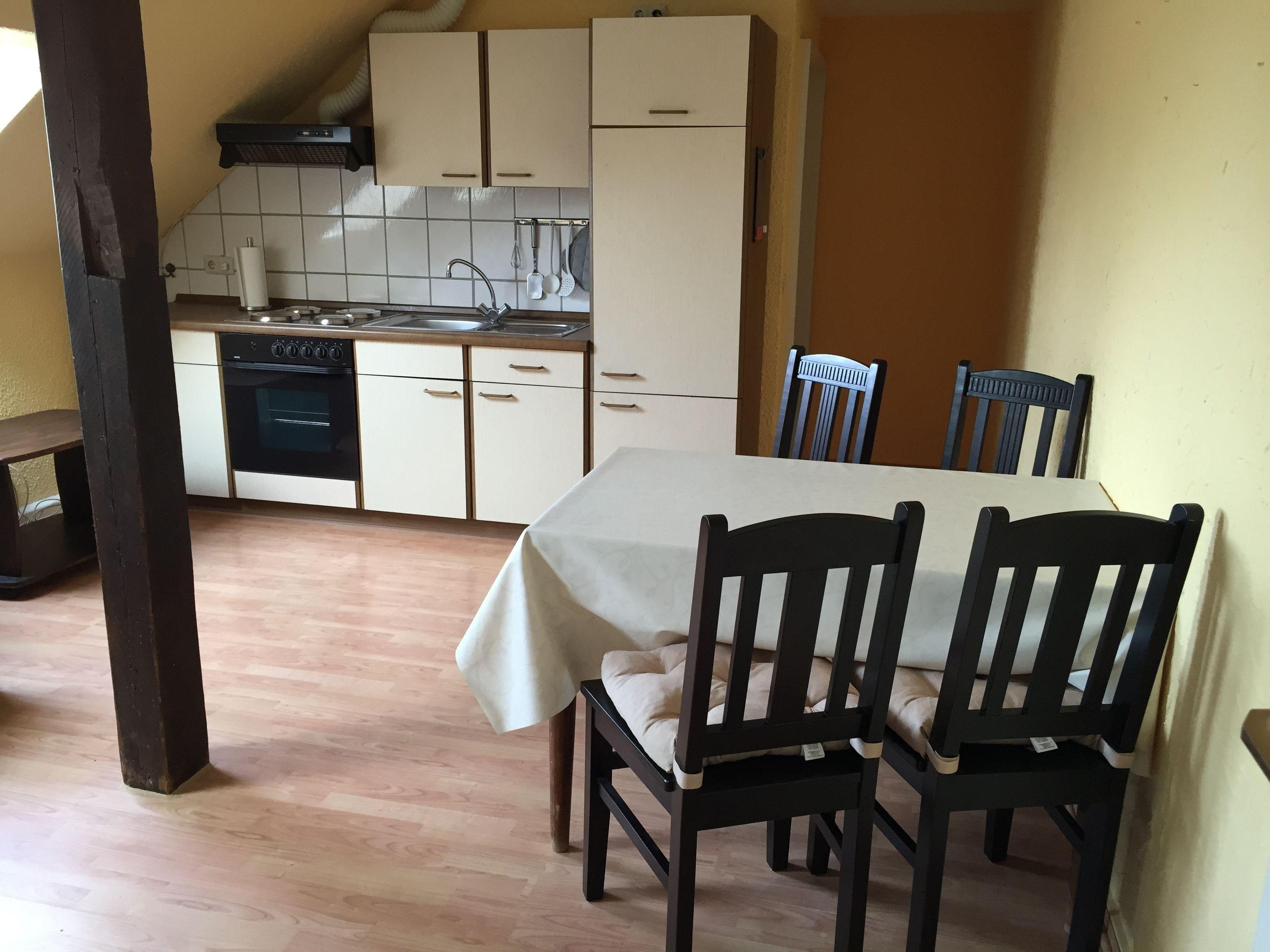 Diese 48 qm große Ferienwohnung hat 3 Räume, bestehend aus einer Wohnküche, Schlafzimmer und einem Badezimmer. Der Wohnteil hat ein Sofa, einen Couchtisch, einen SAT-Fernseher und einen Eßtisch mit 4 Stühlen. Der Küchenteil ist mit Wasserkocher, Kaffeemaschine, Handmixer, Herd, Backofen, Toaster, Kühlschrank, Geschirr, Besteck, Pfannen und Töpfen ausgestattet.