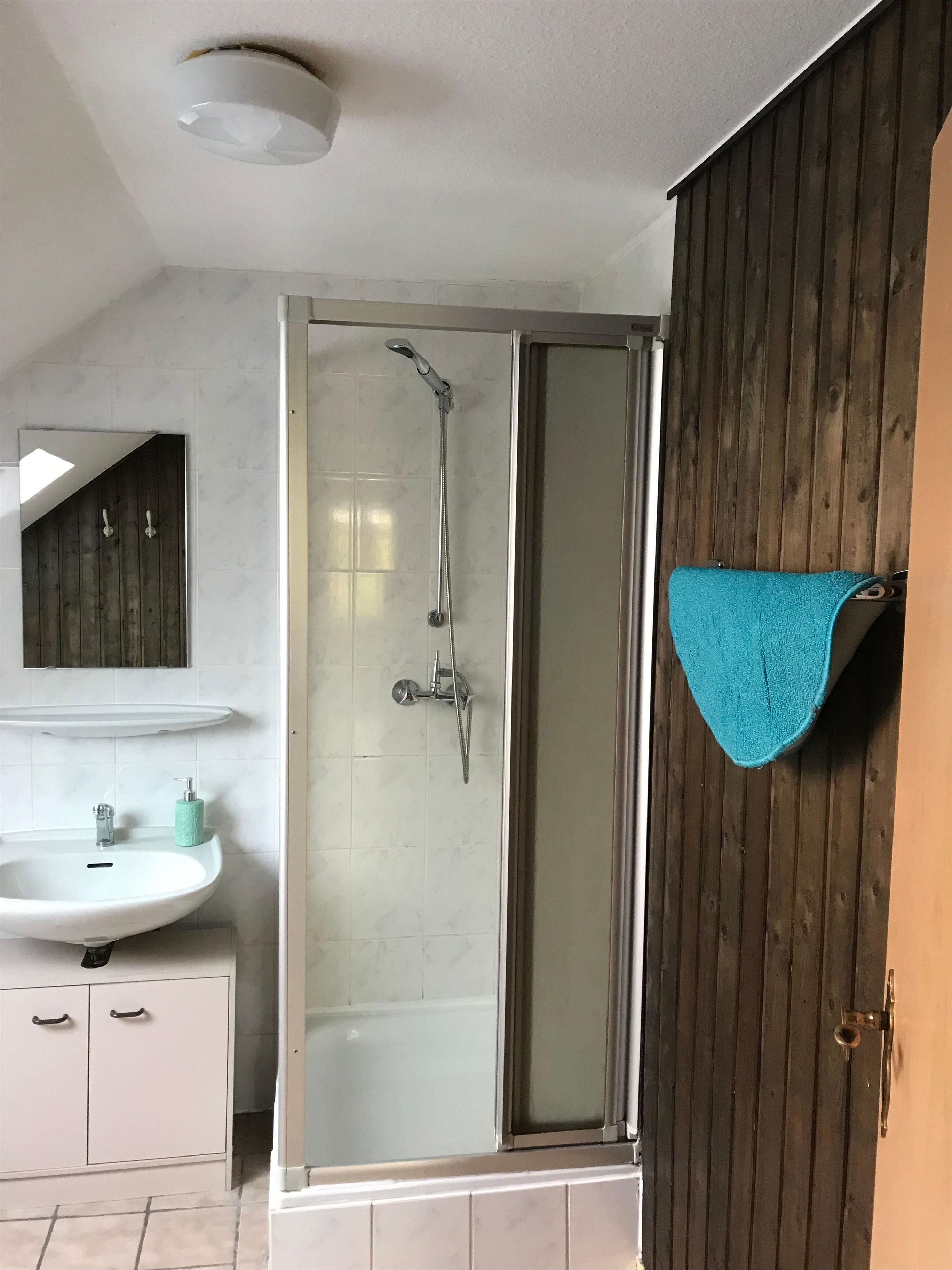 Das Badezimmer ist mit einer Dusche ausgestattet.